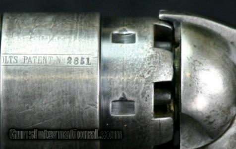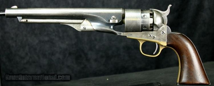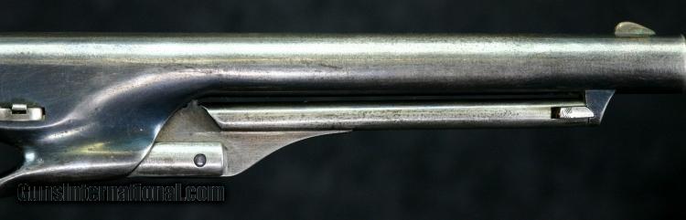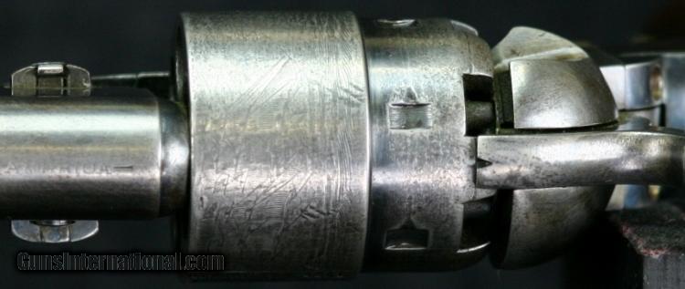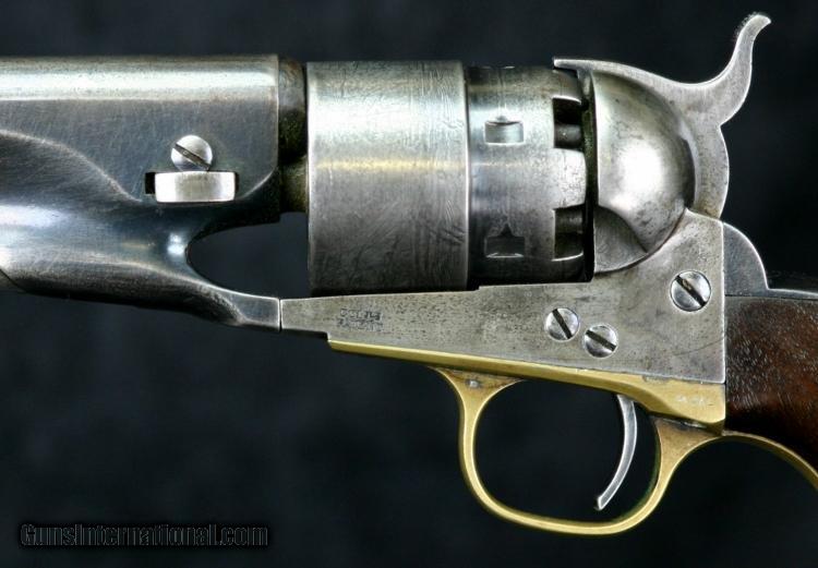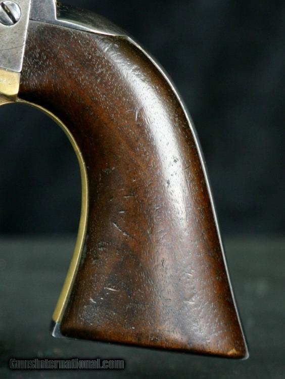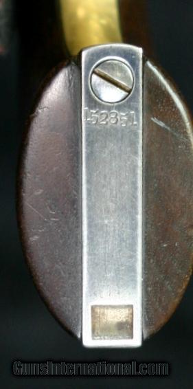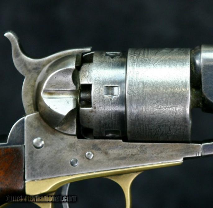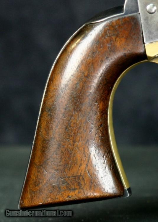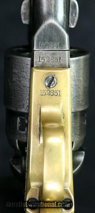 Description: #152851, .44 cal, blued and case colored, one piece walnut grips, all matching numbera, faint cartouche on left grip, 1864. Condition: bore is very good + with black powder oxidation near muzzle, 60% blue on barrel, thinning at center but bright and strong near breech, cylinder has 60% blue thinning with excellent scene, back strap retains 70% blue thinning, frame, loading lever and frame show 50 to 60% case colors starting to fade and go silver, grips are slightly under sized. SOLD Antique: Yes |