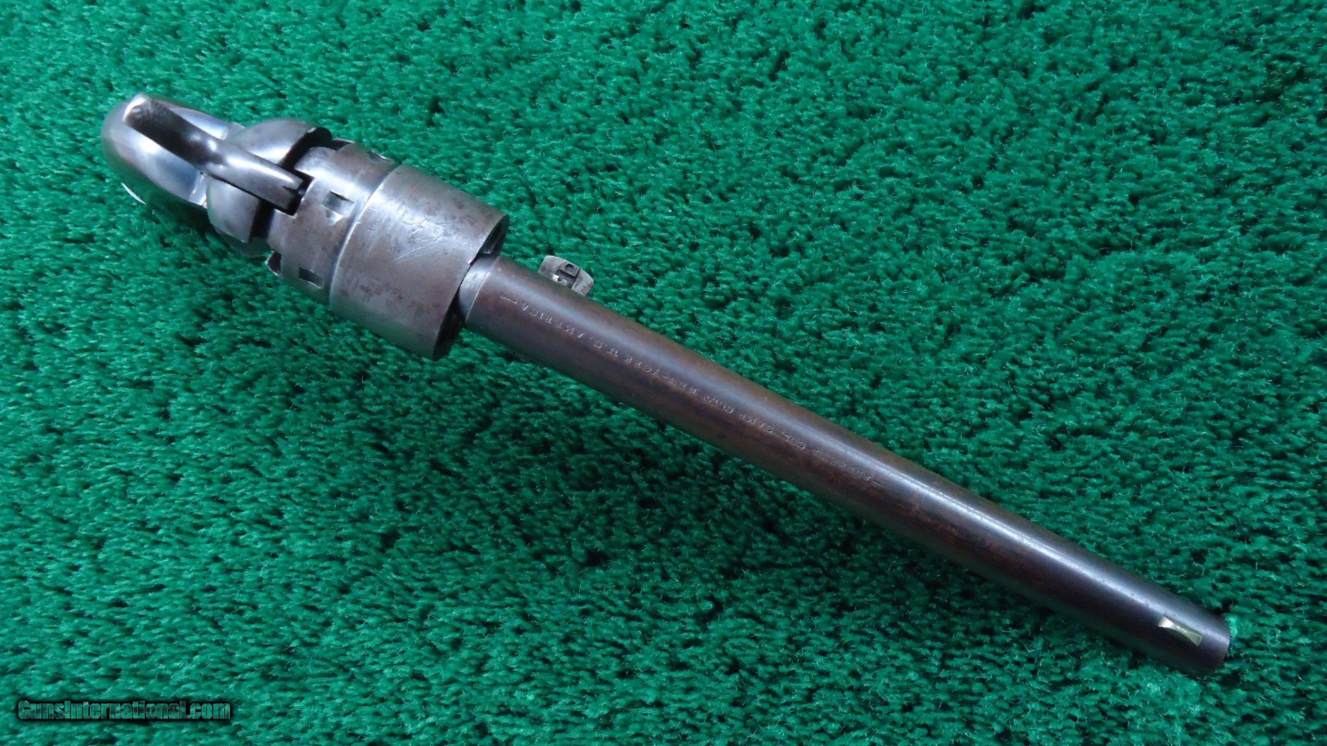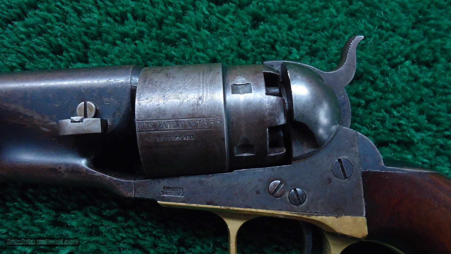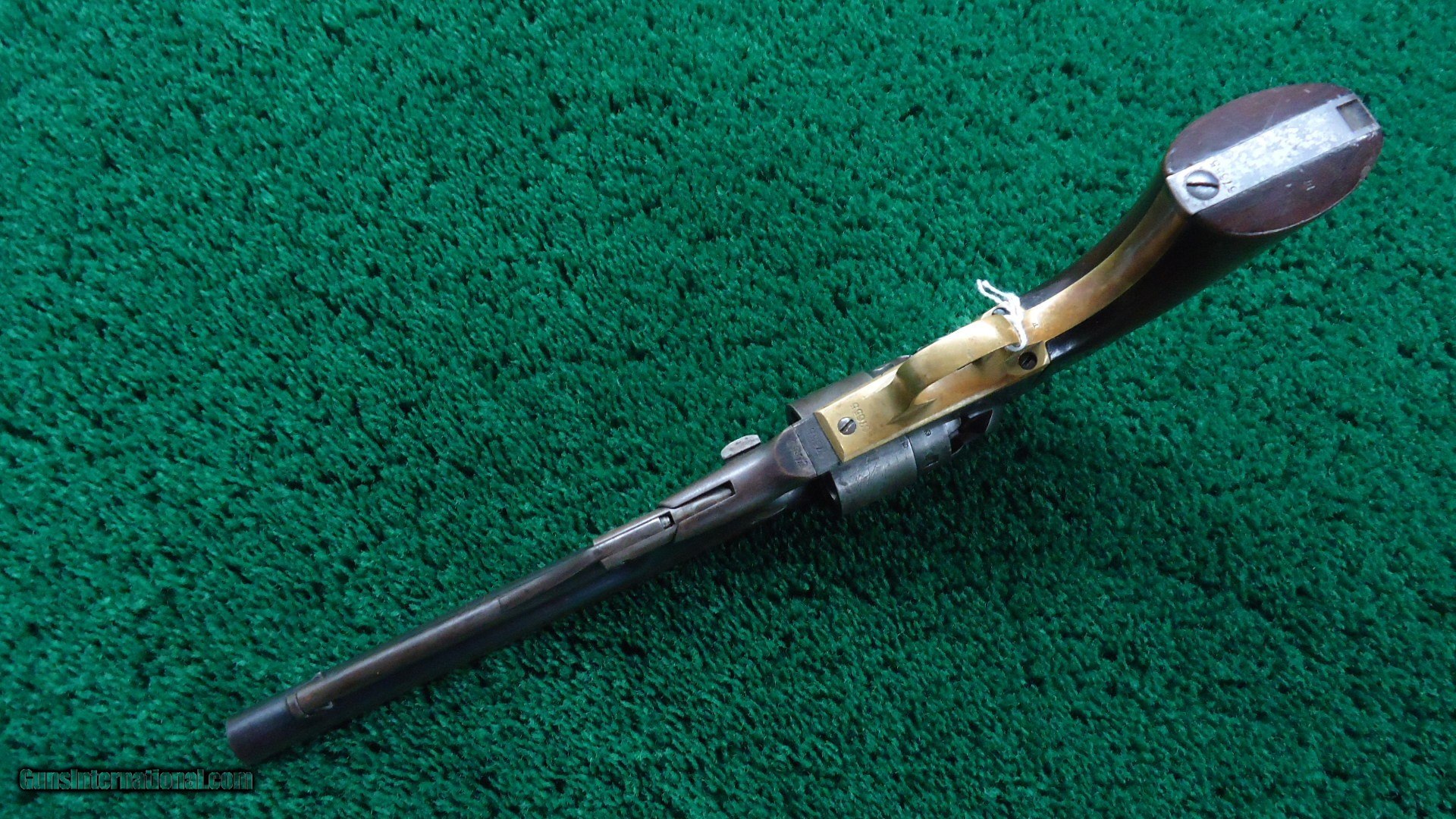 Description: 6 shot percussion revolver with 8 inch round barrel. Good bore with shine and visible rifling but does have some scattered light pits. Sharp barrel address. Good amounts of original blue in the protected areas with the balance turning a plum/brown. Steel back strap has good blue as well. Brass trigger guard has an untouched appearance and looks good. Traces of case color remain on the frame and hammer. Excellent cylinder scene. Several inspector marks as well a sharp cartouche on each side of the walnut grips. Action functions properly. All matching numbers except for an unmarked wedge. An early example that was made in 1862. Leroy Merz Antique Firearms specializes in antique and vintage Winchesters and other fine American firearms. Since 1965 Mr. Merz has taken part in the world of firearms and has been a contributor to many well known reference books. We have hundreds of additional guns in every price range at our home online. Search for Merz Antiques in google. SOLD Antique: Yes Handgun Caliber: .44 |