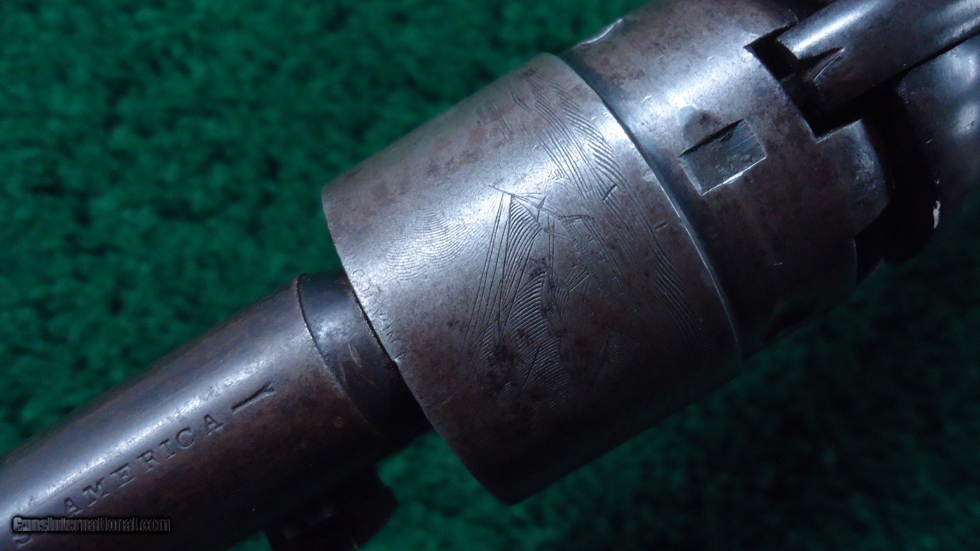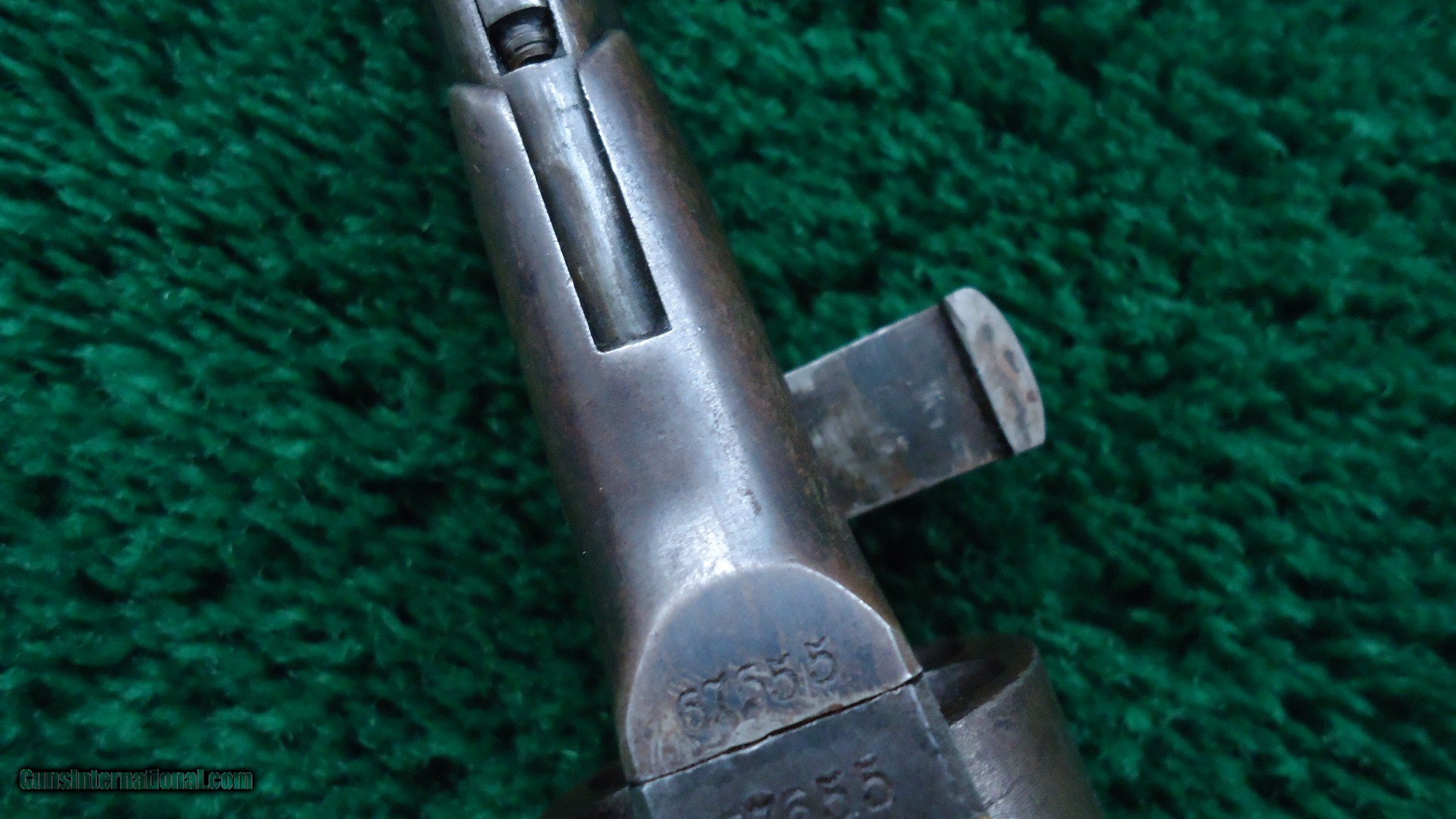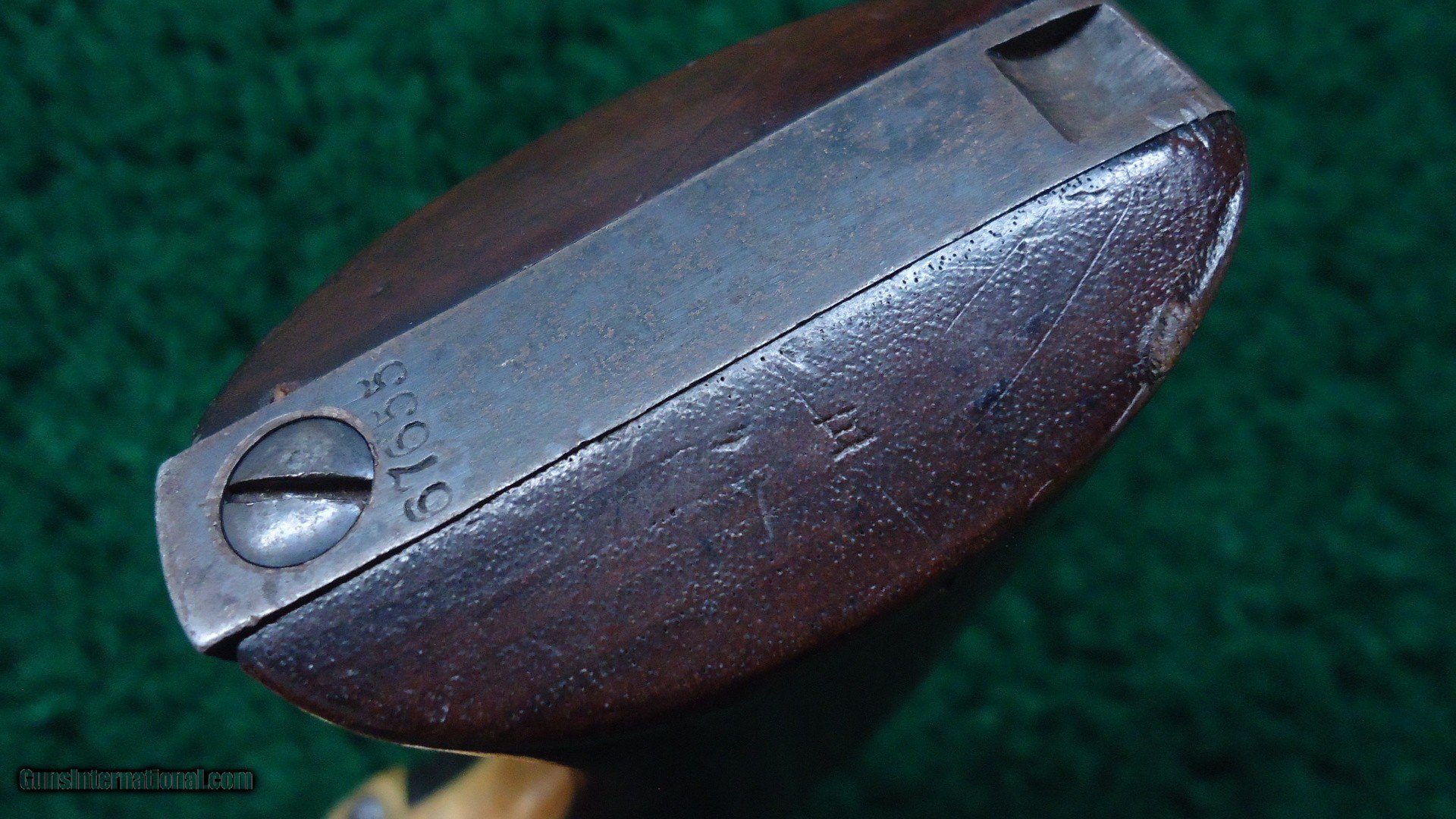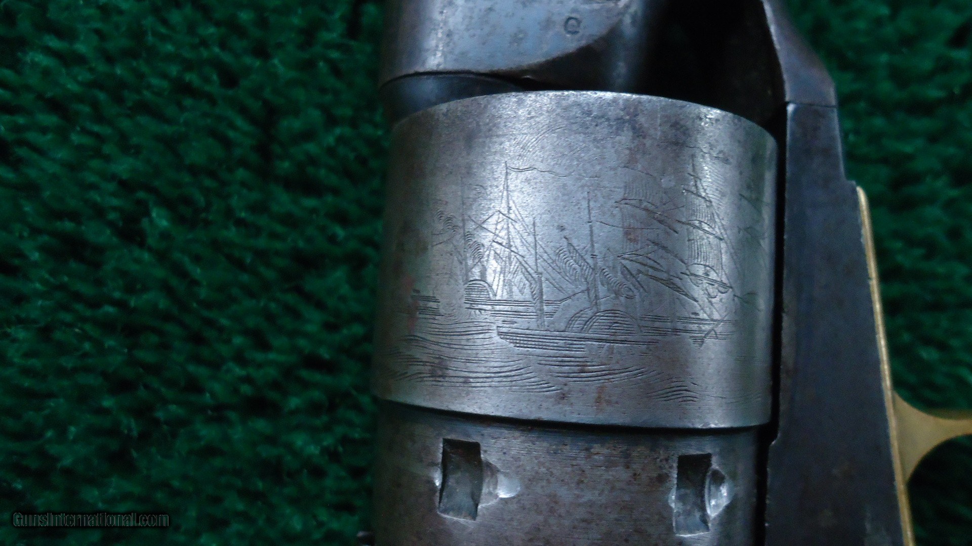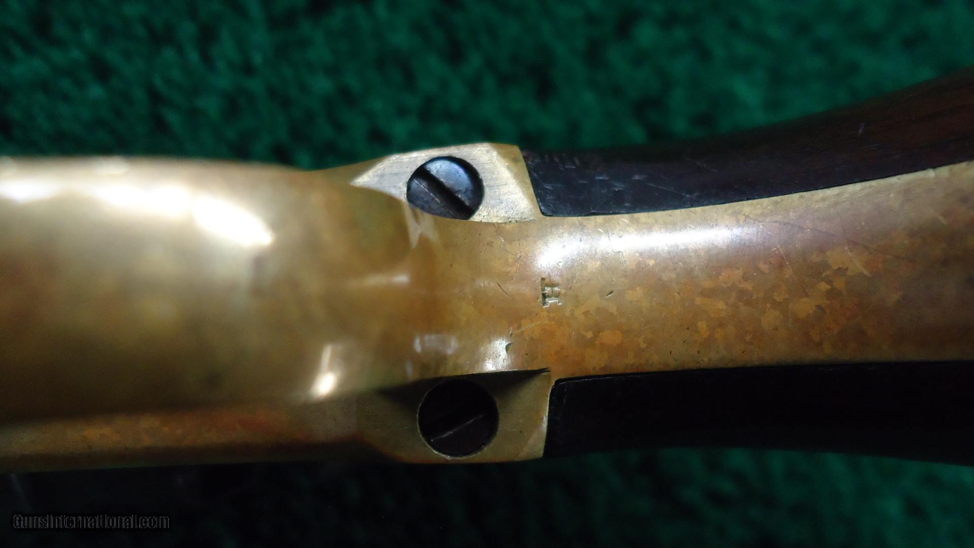 Description: 6 shot percussion revolver with 8 inch round barrel. Good bore with shine and visible rifling but does have some scattered light pits. Sharp barrel address. Good amounts of original blue in the protected areas with the balance turning a plum/brown. Steel back strap has good blue as well. Brass trigger guard has an untouched appearance and looks good. Traces of case color remain on the frame and hammer. Excellent cylinder scene. Several inspector marks as well a sharp cartouche on each side of the walnut grips. Action functions properly. All matching numbers except for an unmarked wedge. An early example that was made in 1862. Leroy Merz Antique Firearms specializes in antique and vintage Winchesters and other fine American firearms. Since 1965 Mr. Merz has taken part in the world of firearms and has been a contributor to many well known reference books. We have hundreds of additional guns in every price range at our home online. Search for Merz Antiques in google. SOLD Antique: Yes Handgun Caliber: .44 |