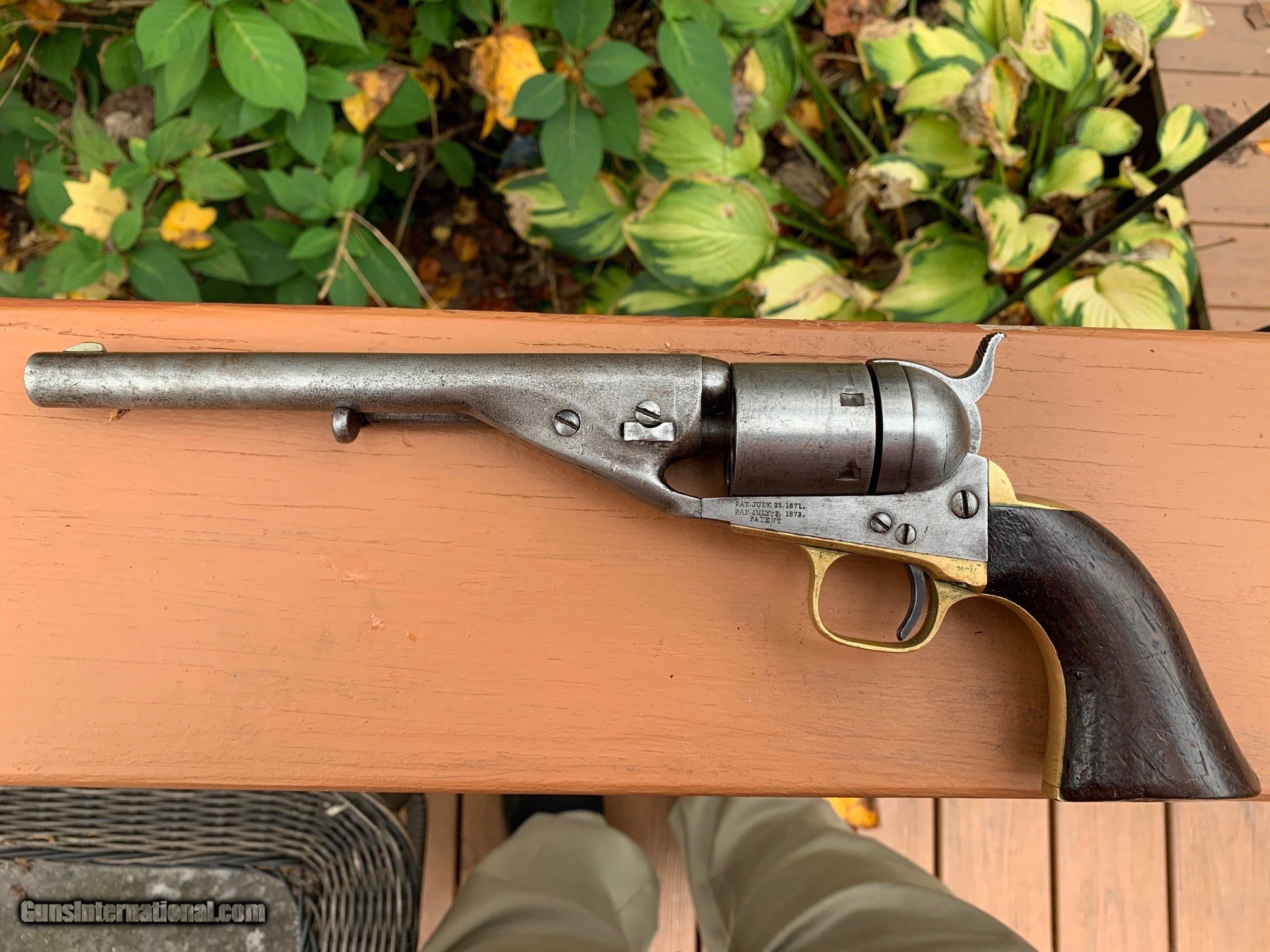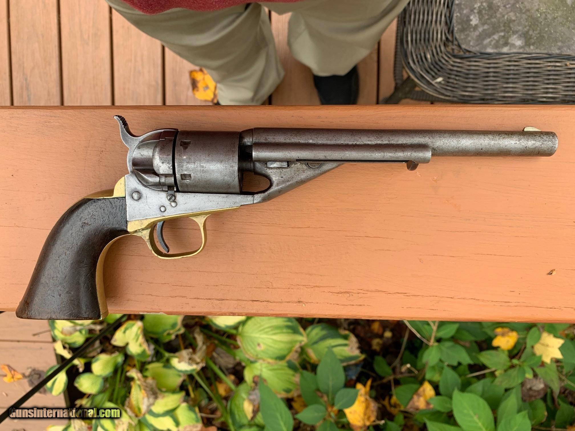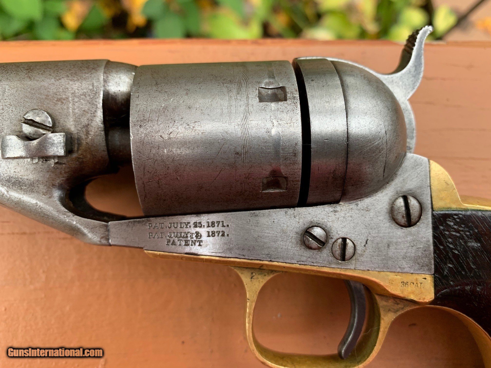 Description: Colt 1861 Navy Conversion 38 CF factory Mason conversion in 1872. Grey finish, nice lettering and serials. Navy anchor on barrel and inspector marks. Perfect indexing, completely tight frame fit and tight cylinder lockup. All matching cylinder and frame as converted. Bore is excellent, bright with nice rifling. 30% cylinder scene. Should make a great shooter. Have checked by a competent gunsmith prior to use. As is. Shipping based on location. SOLD Antique: Yes Manufacturer: Colt Model: 1861 Bore: Ex. |