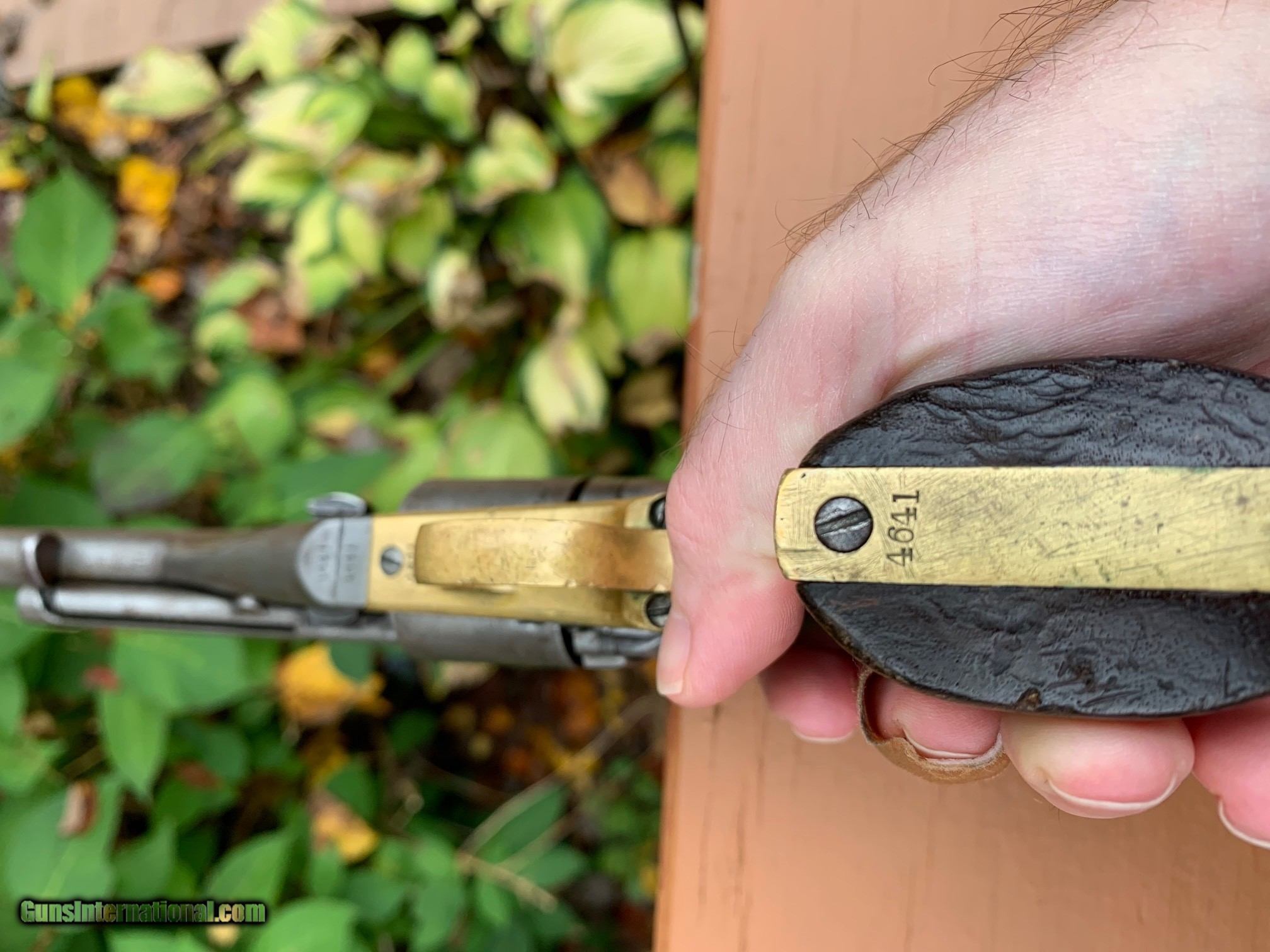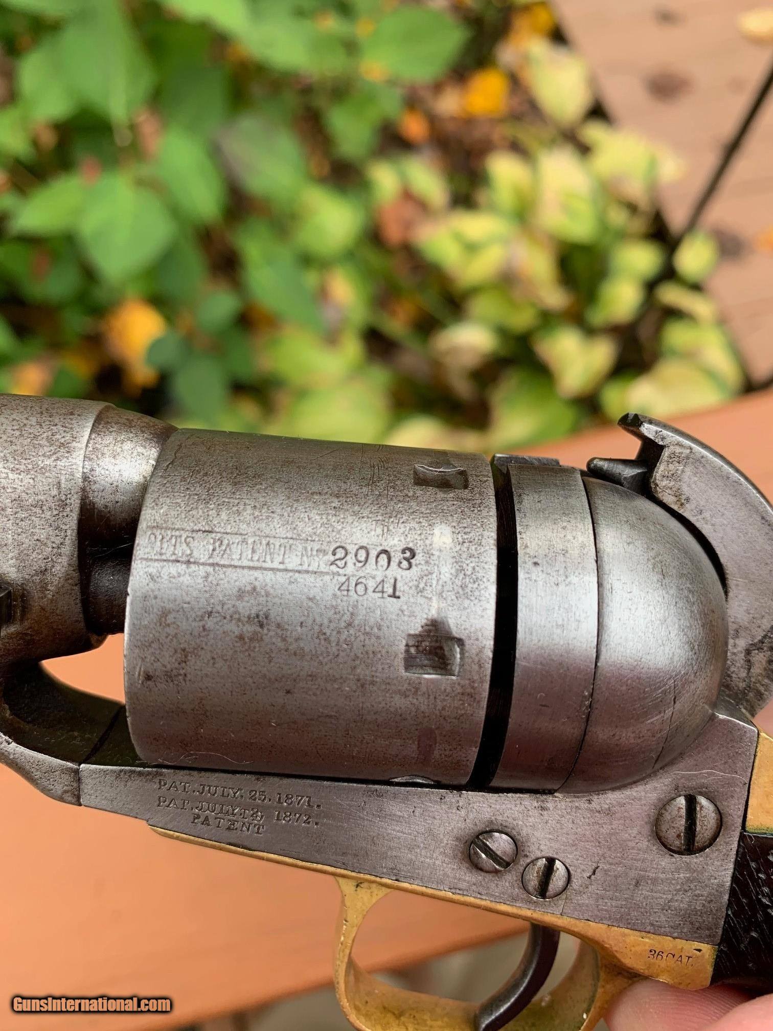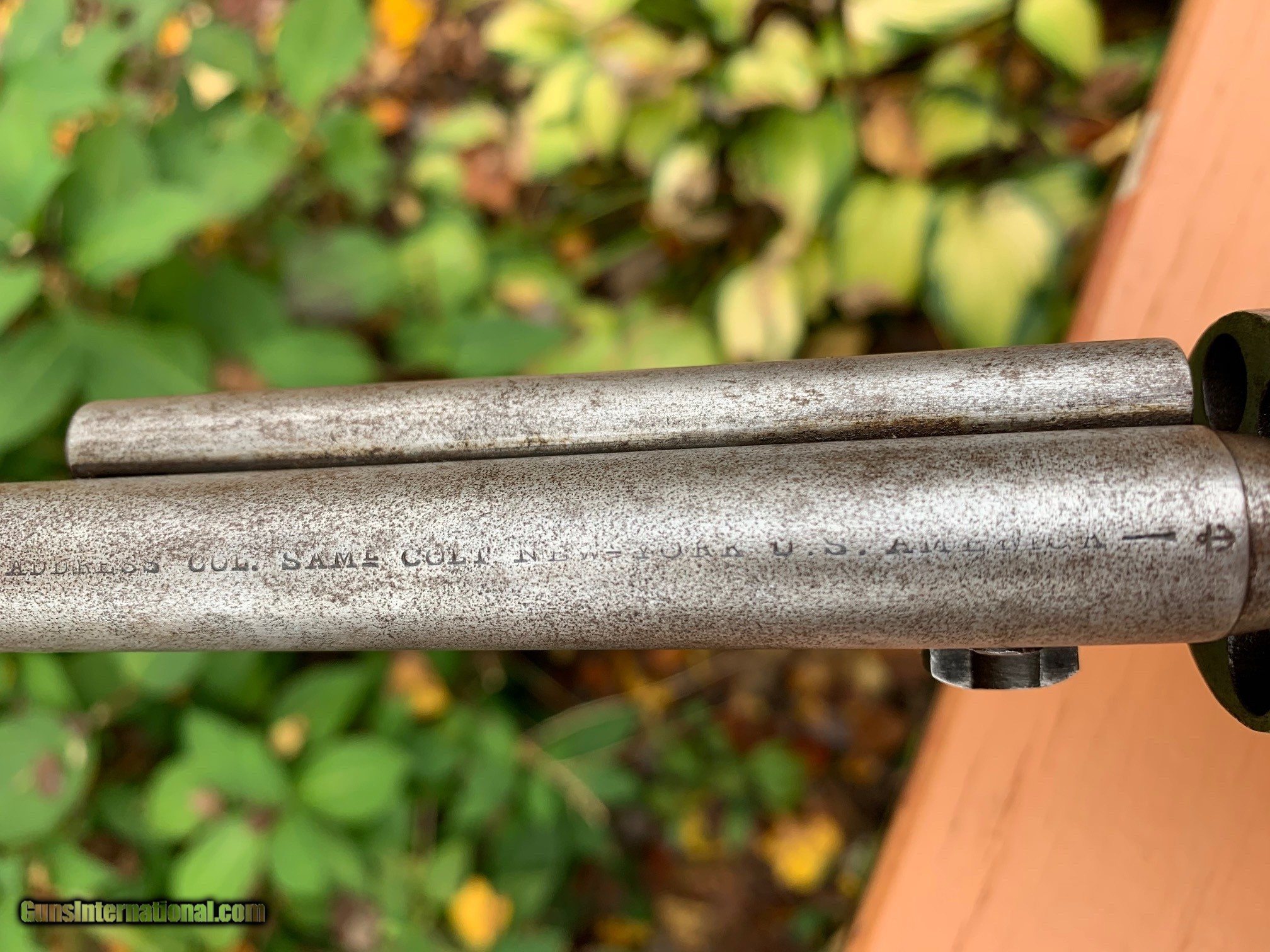 Description: Colt 1861 Navy Conversion 38 CF factory Mason conversion in 1872. Grey finish, nice lettering and serials. Navy anchor on barrel and inspector marks. Perfect indexing, completely tight frame fit and tight cylinder lockup. All matching cylinder and frame as converted. Bore is excellent, bright with nice rifling. 30% cylinder scene. Should make a great shooter. Have checked by a competent gunsmith prior to use. As is. Shipping based on location. SOLD Antique: Yes Manufacturer: Colt Model: 1861 Bore: Ex. |