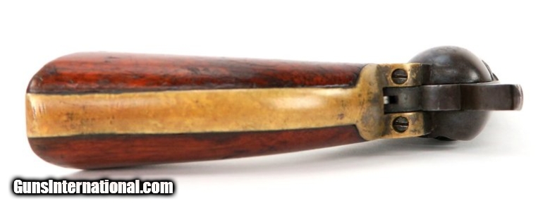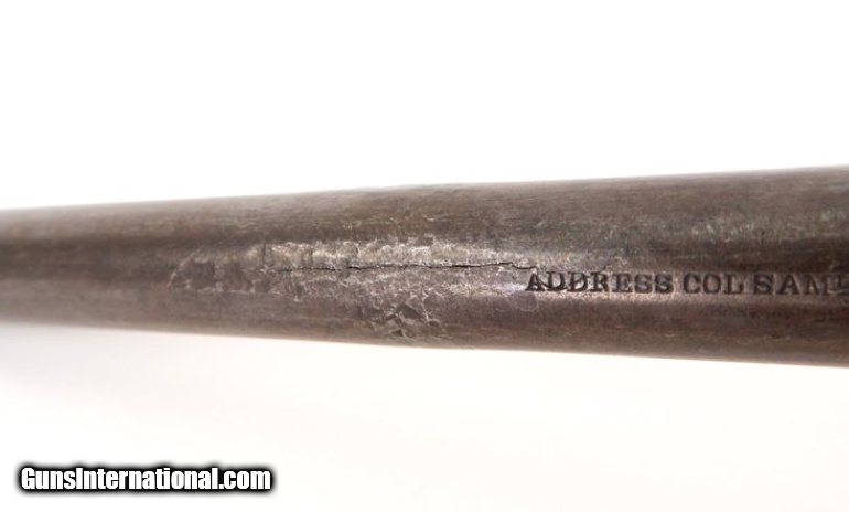 Description: Colt 1862 Police .36 caliber revolver. Made in 1862. 6½” barrel. Gun has a gray to brown patina with trace amount of original blue. Barrel has a crack on the top that goes through to the inside of the barrel. This gun is NOT to be attempted to be fired under ANY CIRCUMSTANCES. The grips are very good with normal handling wear. There is a slot made on the butt on each side of the grips presumable for a lanyard. Action works perfectly and locks up tight. SOLD Antique: Yes |