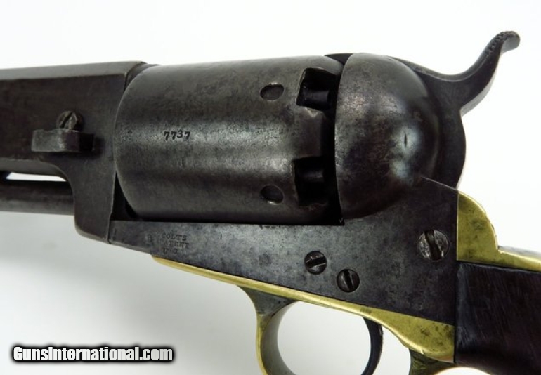 Colt 1st Model Dragoon .44 caliber revolver. Serial # 7737. All matching numbers except for wedge, which is unnumbered. Gun is tight with no barrel to frame looseness. All markings are sharp. Cylinder scene is partially visible. Grips are good and fit well, there is a chip at the bottom front edge. This is a decent 1st Model and is better than usual as 1st Models are well used and saw a lot of service out West.
