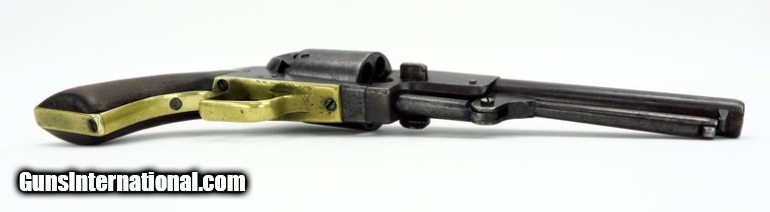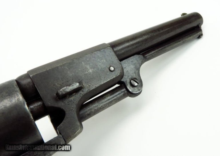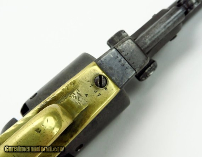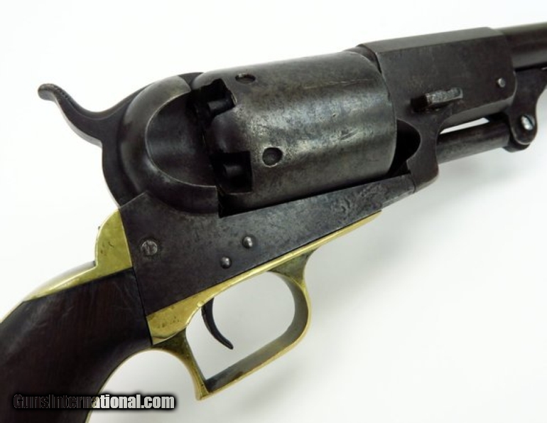 Description: Colt 1st Model Dragoon .44 caliber revolver. Serial # 7737. All matching numbers except for wedge, which is unnumbered. Gun is tight with no barrel to frame looseness. All markings are sharp. Cylinder scene is partially visible. Grips are good and fit well, there is a chip at the bottom front edge. This is a decent 1st Model and is better than usual as 1st Models are well used and saw a lot of service out West. SOLD |