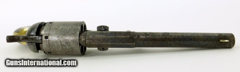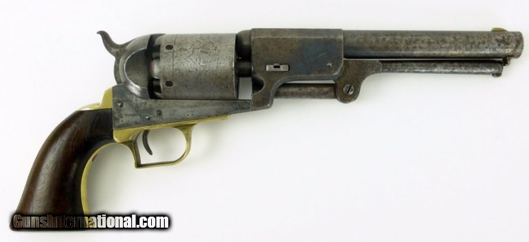 Colt 1st Model Martially Marked Dragoon. Made in 1849. Well above average 1st Model Dragoon! Nice sharp gun with a smooth dark gray patina mixed with original blue. Approximately 15% of the original finish remains in protected areas. Cylinder scene is very good. All numbers match. Grips still have visible cartouches. This is a Martial Dragoon from the third contract and lot of these guns went to Texas. In addition to cartouches are various inspector’s marks on different parts. Very nice gun and certainly in better condition than what you normally see!