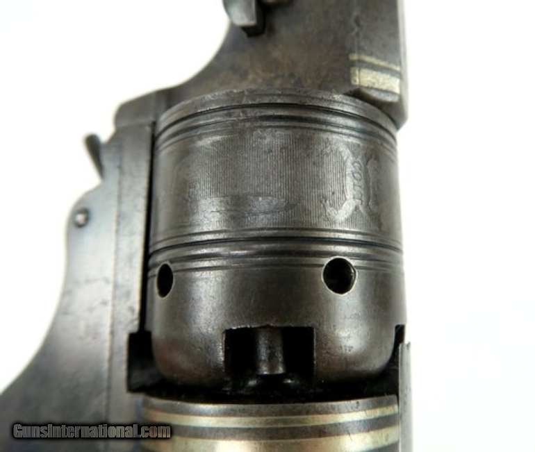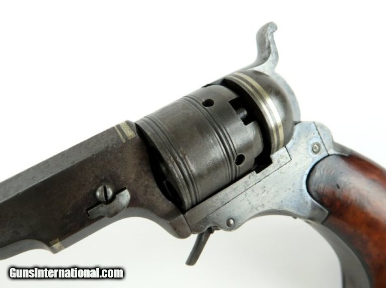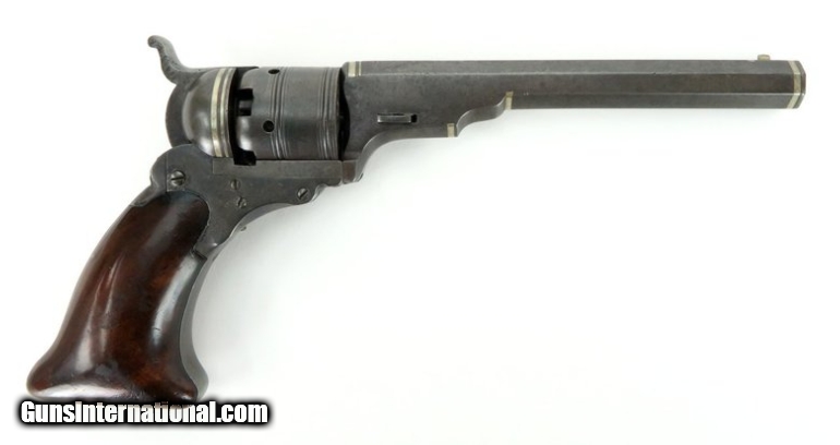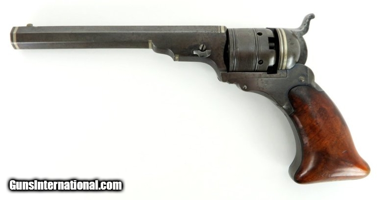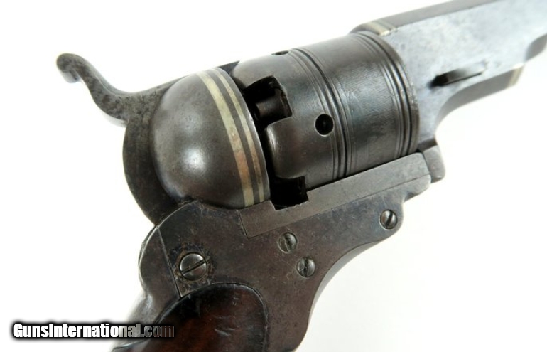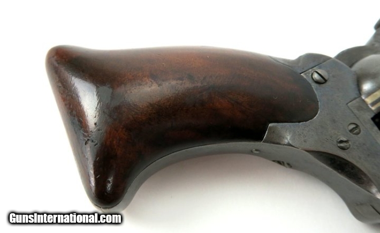 Description: Colt 3rd Model Belt Paterson. Serial number 171. Rare gun with silver bands. The 5½” long barrel has the correct 11 groove rifling. The cylinder scene is very strong and the gun is all matching. The silver bands are a rare feature on Paterson pistols. The metals has a dark gray patina with trace amounts of finish in protected areas. Grips are excellent. Gun works perfectly. Very fine Belt Model Paterson! SOLD |