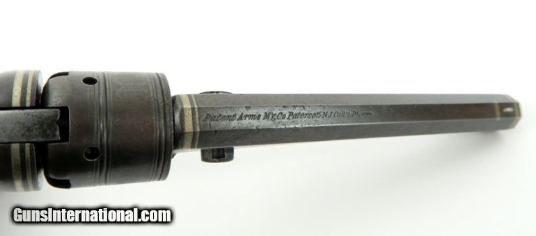 Colt 3rd Model Belt Paterson. Serial number 171. Rare gun with silver bands. The 5½” long barrel has the correct 11 groove rifling. The cylinder scene is very strong and the gun is all matching. The silver bands are a rare feature on Paterson pistols. The metals has a dark gray patina with trace amounts of finish in protected areas. Grips are excellent. Gun works perfectly. Very fine Belt Model Paterson!