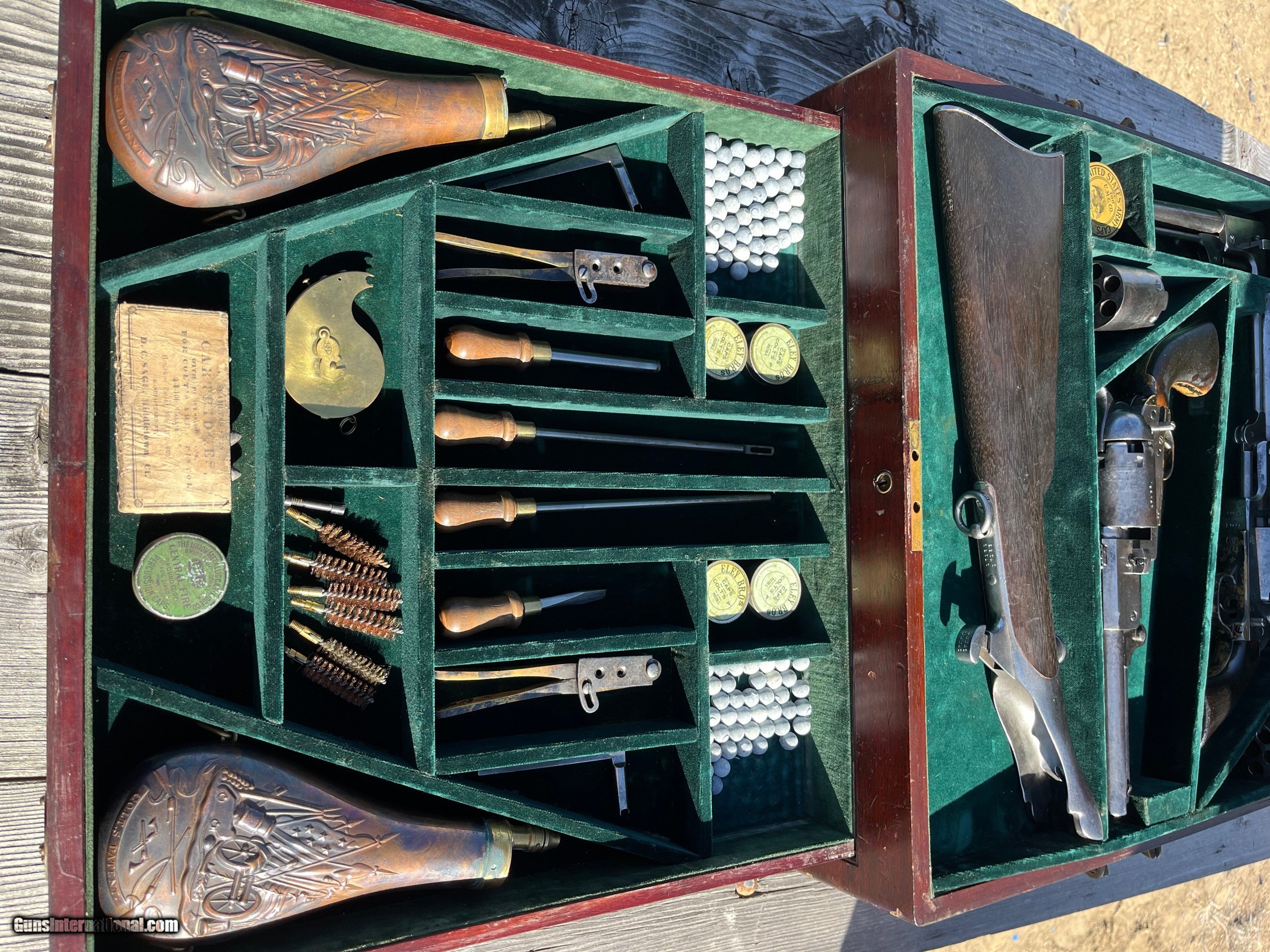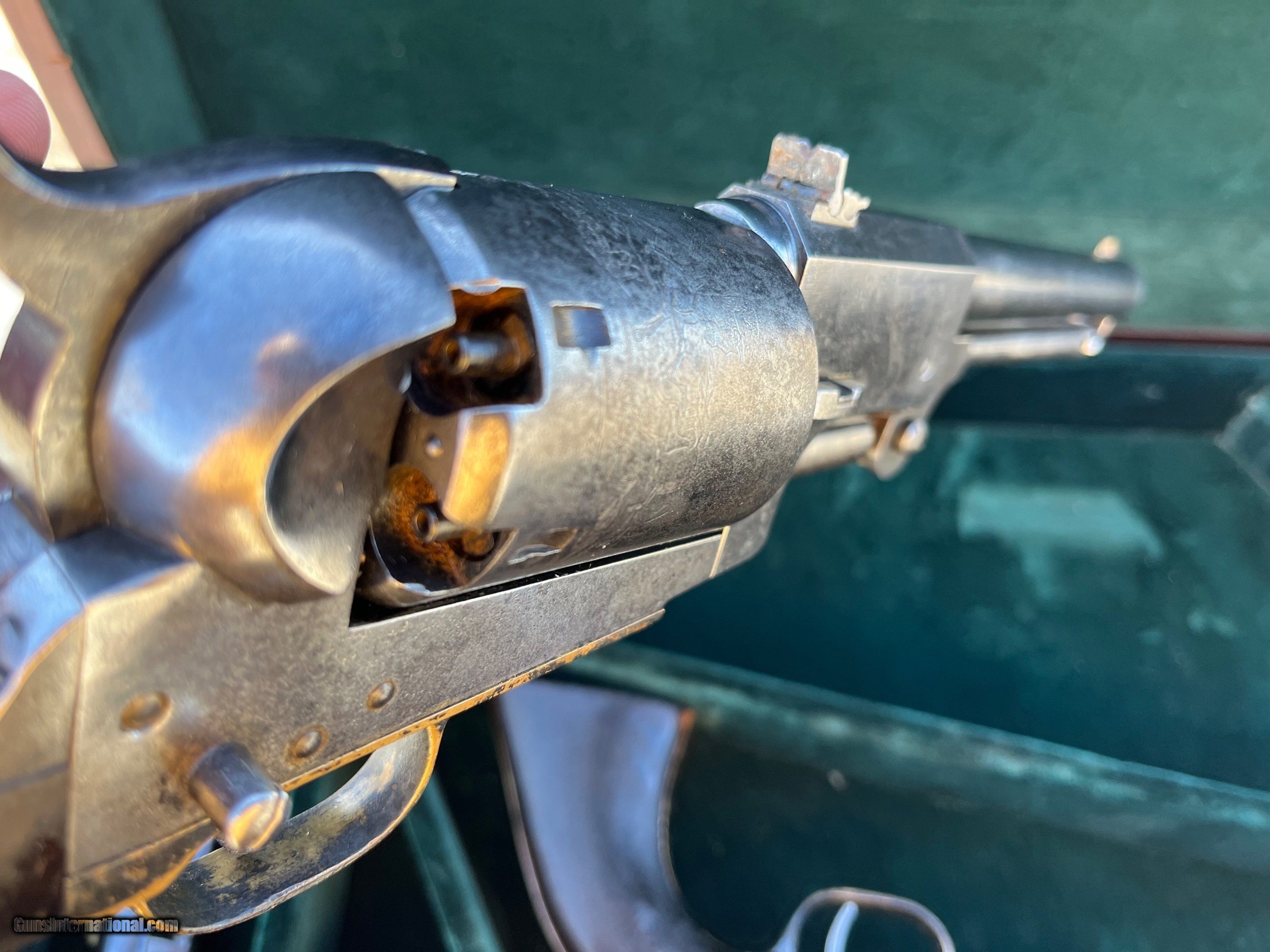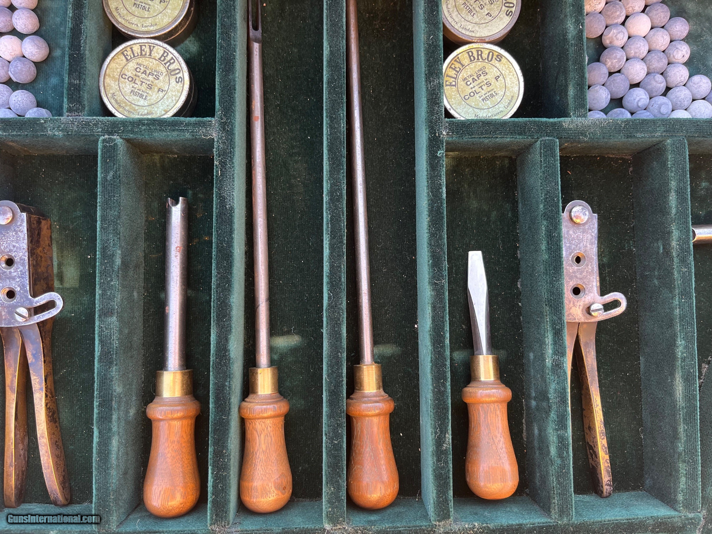 Description: For sale are two martially marked third-model Colt Dragoons with shoulder stock. These Dragoons are consecutively numbered and come with one of the more desirable cases I have ever laid my eyes upon in many years of collecting. To top it off, the accessories that come with the case are stunning. These pistols fall into the correct 17,000 serial number range to be martially marked with shoulder stock, two-leaf rear sight, and four screw frames. Research has found several previous sales of martially marked Dragoons all falling into the 17,000 number range which dates these pistols to 1858. The Case The case of this fabulous set is simply breathtaking. It is 18-inches deep, 20-inches wide, and 8-inches tall. Two heavy-duty brass handles flank each side of the case, allowing one to carry it. The case has a very old and very mysterious brass nameplate attached to the top with the initials; "M.F.F". I can only assume that this is the initials of the gentleman to whom the case belonged too. The case has two chambers; a top area, which is accessed via opening the lid. This top area has seven compartments that house the two consecutive Dragoons, the shoulder stock, an extra barrel, two extra cylinders and a US Army percussion cap tin. The green felt is in absolutely wonderful shape for its age. Opening the lid reveals smells of gun oil and old tobacco (sweet). The lower drawer of the case houses all the accouterments. *It is important to note that the lower drawer, can not be "UNLOCKED" without first opening the lid. Opening the lid then releases an internal lock, which allows the drawer to pull out freely. Otherwise, the drawer remains locked in place so as not to come out. I have to admit, it was a bit of a puzzle to figure this out, and adds to the uniqueness of this case. It is simply stunning that a 170-year-old wooden box could house an internal locking mechanism. The lower drawer pulls out to reveal 17 different compartments filled with: two powder flasks, two bullet molds, two nipple wrenches, five cap tins, lead balls, loaded paper cartridges, a portable cap tin, four tools with wooden handles and brass brushes. Accessories The accessories are numerous and stunning. In no particular order there is a United States Army Percussion cap tin in the top chamber, then starting from bottom to top in the bottom drawer there are two proper Colt Dragoon Powder flasks, both with Colts Patent on them, a full box of loaded paper cartridges, a union metallic percussion cap tin, a brass inline capper, brass brushes, two nipple wrenches, two bullet molds, both stamped colts patent. There are four tools with wooden handles, a screwdriver, a nipple wrench driver, a rod for brushes and a rod for patches. There are four Eley Bros cap tins and two large compartments with lead balls. In our assessment, the eley bros cap tins are modern reproductions as well as the in-line capper and the brass brushes. Everything else is 100% first-generation authentic. Pistols The two pistols are consecutively serial numbered 17121 and 17122. With each pistol, there is an extra cylinder one numbered 17121 and one 17122. There is also an additional barrel that bears both serial numbers stamped on it. The stock is also serial numbered to both pistols and fits on both pistols perfectly. There is a random number; 2194 stamped on the shoulder stock, which doesn't match anything. The bore on the extra barrel is average to good with frosting and light pitting as expected with age. The walnut grips are both shrunken and or sanded down and revarnished; no sign of a cartouche which leads me to believe they have been sanded. They are rounded at all edges commensurate with use. The action on SN 17121 is decent. The main spring has been replaced on both pistols. The action on SN 17122 is average at best. It half cocks and indexes fine, but it does need some help along. It is almost as if the internals are somewhat rusted. But it does function and will lock up tight when fully cocked. All serial numbers match on barrel, frame, trigger guard, backstrap, and cylinder. No serial number on the wedge. Our assessment of these pistols is that they are a mix of reproduction parts and original parts. Some items like the cylinders are replacements. Some areas have been restamped or stamped with the incorrect font. These pistols are not 100% original, and as such the price reflects that. Price We will consider trades plus cash for the purchase of this once-in-a-lifetime set. We buy sell and trade all 1st and 2nd Generation Colt Percussion Pistols, as well as Colt Single Action Army's and Colt 1911's. Please give us a call and make an offer! We would love to hear form you. The asking price is $10,000 delivered. We can also entertain meeting you halfway so shipping can be avoided. We live near the Colorado, Kansas, Oklahoma, Texas border. Thank you SOLD Antique: Yes Manufacturer: Colt Model: Third-Model Dragoon Serial Number: 17121 |