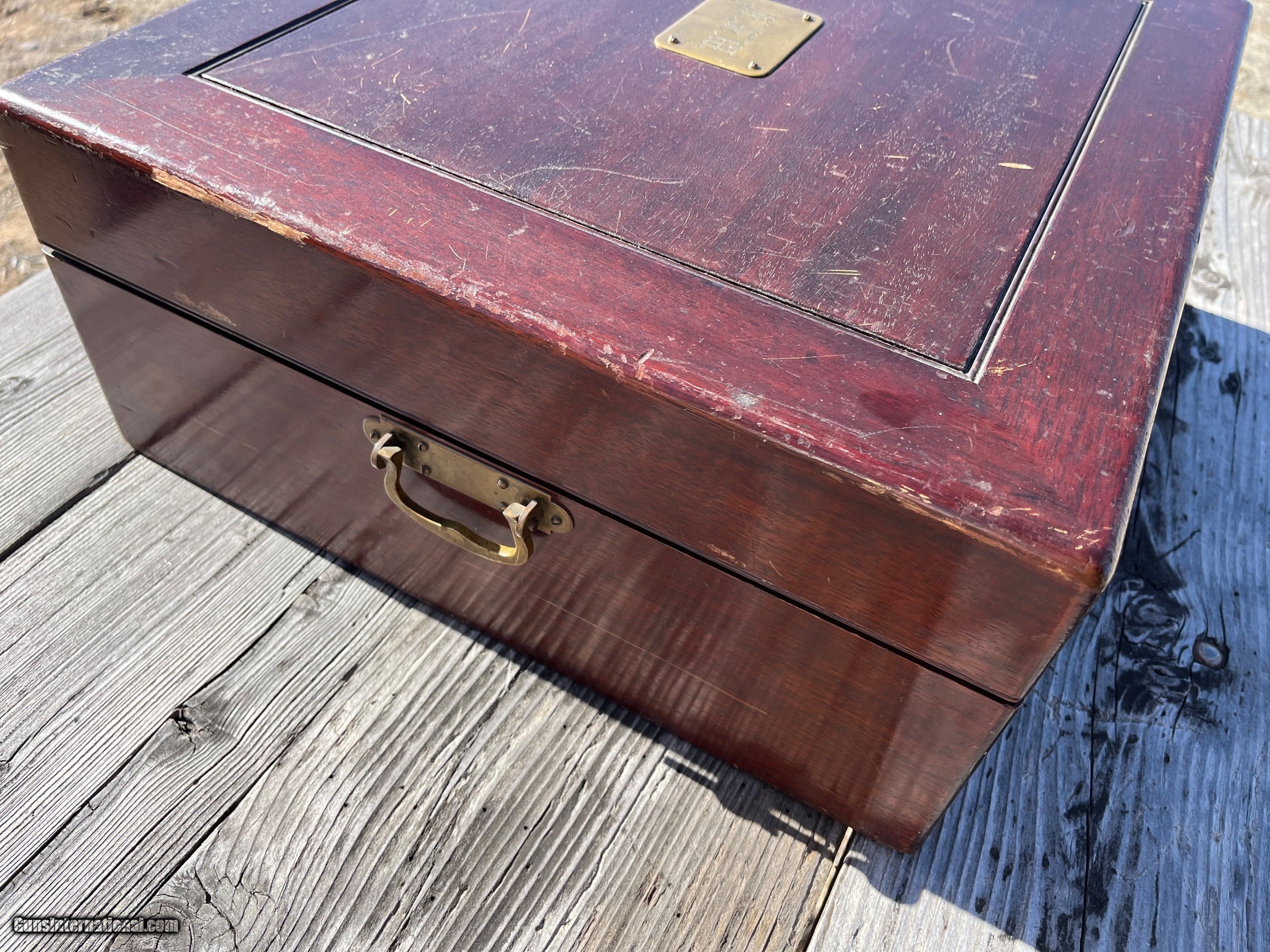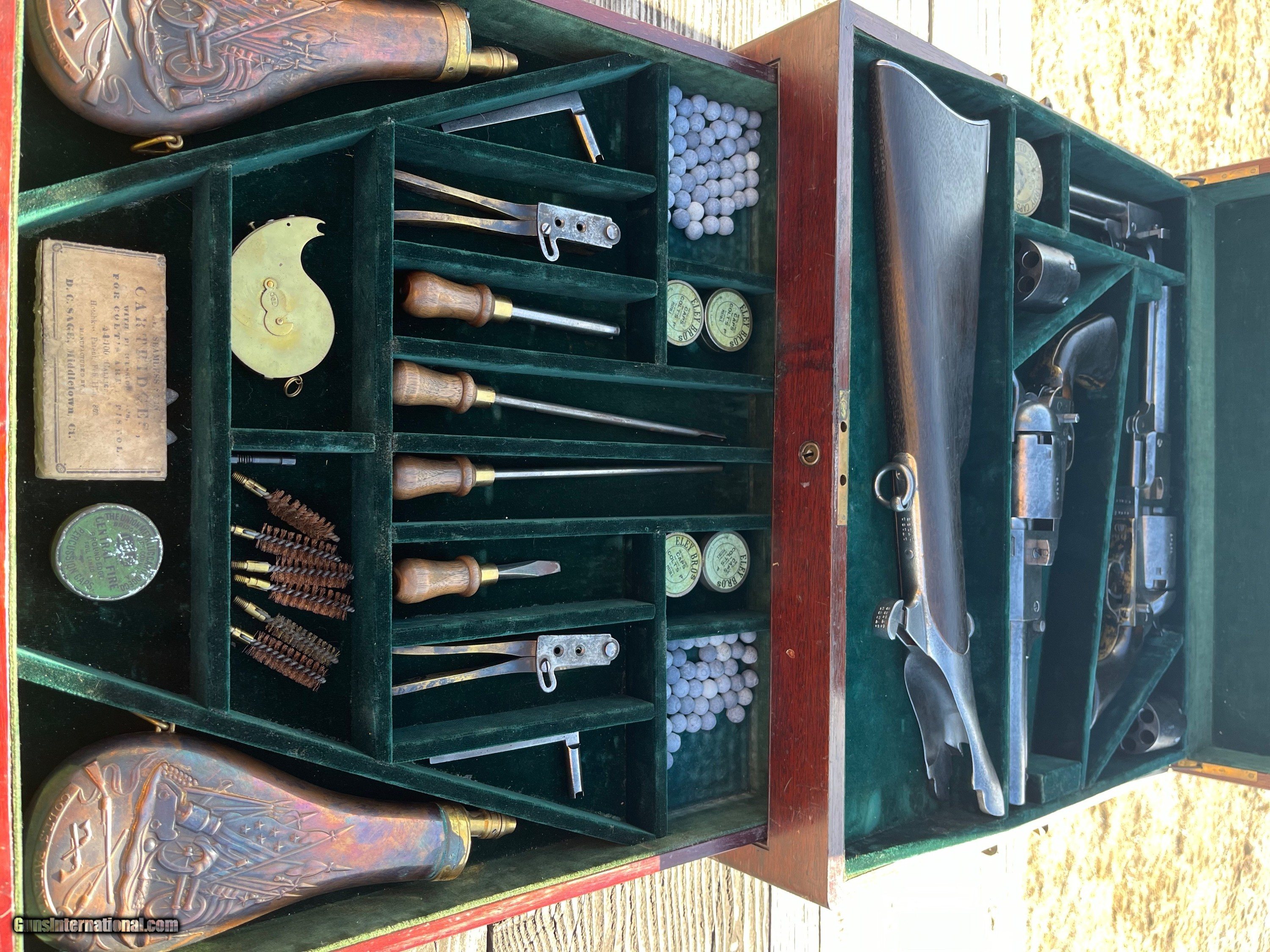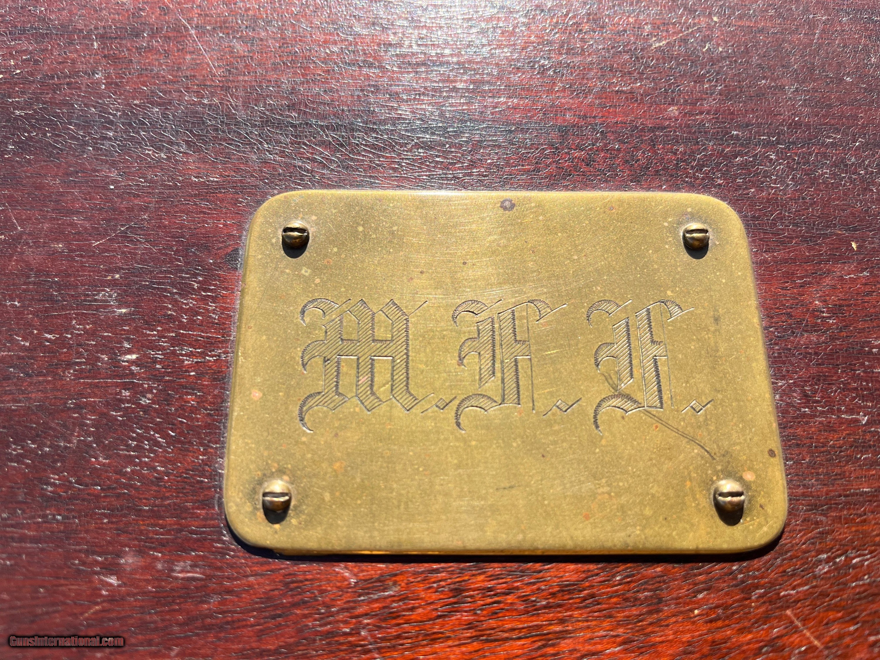 Description: For sale are two martially marked third-model Colt Dragoons with shoulder stock. These Dragoons are consecutively numbered and come with one of the more desirable cases I have ever laid my eyes upon in many years of collecting. To top it off, the accessories that come with the case are stunning. These pistols fall into the correct 17,000 serial number range to be martially marked with shoulder stock, two-leaf rear sight, and four screw frames. Research has found several previous sales of martially marked Dragoons all falling into the 17,000 number range which dates these pistols to 1858. The Case The case of this fabulous set is simply breathtaking. It is 18-inches deep, 20-inches wide, and 8-inches tall. Two heavy-duty brass handles flank each side of the case, allowing one to carry it. The case has a very old and very mysterious brass nameplate attached to the top with the initials; "M.F.F". I can only assume that this is the initials of the gentleman to whom the case belonged too. The case has two chambers; a top area, which is accessed via opening the lid. This top area has seven compartments that house the two consecutive Dragoons, the shoulder stock, an extra barrel, two extra cylinders and a US Army percussion cap tin. The green felt is in absolutely wonderful shape for its age. Opening the lid reveals smells of gun oil and old tobacco (sweet). The lower drawer of the case houses all the accouterments. *It is important to note that the lower drawer, can not be "UNLOCKED" without first opening the lid. Opening the lid then releases an internal lock, which allows the drawer to pull out freely. Otherwise, the drawer remains locked in place so as not to come out. I have to admit, it was a bit of a puzzle to figure this out, and adds to the uniqueness of this case. It is simply stunning that a 170-year-old wooden box could house an internal locking mechanism. The lower drawer pulls out to reveal 17 different compartments filled with: two powder flasks, two bullet molds, two nipple wrenches, five cap tins, lead balls, loaded paper cartridges, a portable cap tin, four tools with wooden handles and brass brushes. Accessories The accessories are numerous and stunning. In no particular order there is a United States Army Percussion cap tin in the top chamber, then starting from bottom to top in the bottom drawer there are two proper Colt Dragoon Powder flasks, both with Colts Patent on them, a full box of loaded paper cartridges, a union metallic percussion cap tin, a brass inline capper, brass brushes, two nipple wrenches, two bullet molds, both stamped colts patent. There are four tools with wooden handles, a screwdriver, a nipple wrench driver, a rod for brushes and a rod for patches. There are four Eley Bros cap tins and two large compartments with lead balls. In our assessment, the eley bros cap tins are modern reproductions as well as the in-line capper and the brass brushes. Everything else is 100% first-generation authentic. Pistols The two pistols are consecutively serial numbered 17121 and 17122. With each pistol, there is an extra cylinder one numbered 17121 and one 17122. There is also an additional barrel that bears both serial numbers stamped on it. The stock is also serial numbered to both pistols and fits on both pistols perfectly. There is a random number; 2194 stamped on the shoulder stock, which doesn't match anything. The bore on the extra barrel is average to good with frosting and light pitting as expected with age. The walnut grips are both shrunken and or sanded down and revarnished; no sign of a cartouche which leads me to believe they have been sanded. They are rounded at all edges commensurate with use. The action on SN 17121 is decent. The main spring has been replaced on both pistols. The action on SN 17122 is average at best. It half cocks and indexes fine, but it does need some help along. It is almost as if the internals are somewhat rusted. But it does function and will lock up tight when fully cocked. All serial numbers match on barrel, frame, trigger guard, backstrap, and cylinder. No serial number on the wedge. Our assessment of these pistols is that they are a mix of reproduction parts and original parts. Some items like the cylinders are replacements. Some areas have been restamped or stamped with the incorrect font. These pistols are not 100% original, and as such the price reflects that. Price We will consider trades plus cash for the purchase of this once-in-a-lifetime set. We buy sell and trade all 1st and 2nd Generation Colt Percussion Pistols, as well as Colt Single Action Army's and Colt 1911's. Please give us a call and make an offer! We would love to hear form you. The asking price is $10,000 delivered. We can also entertain meeting you halfway so shipping can be avoided. We live near the Colorado, Kansas, Oklahoma, Texas border. Thank you SOLD Antique: Yes Manufacturer: Colt Model: Third-Model Dragoon Serial Number: 17121 |