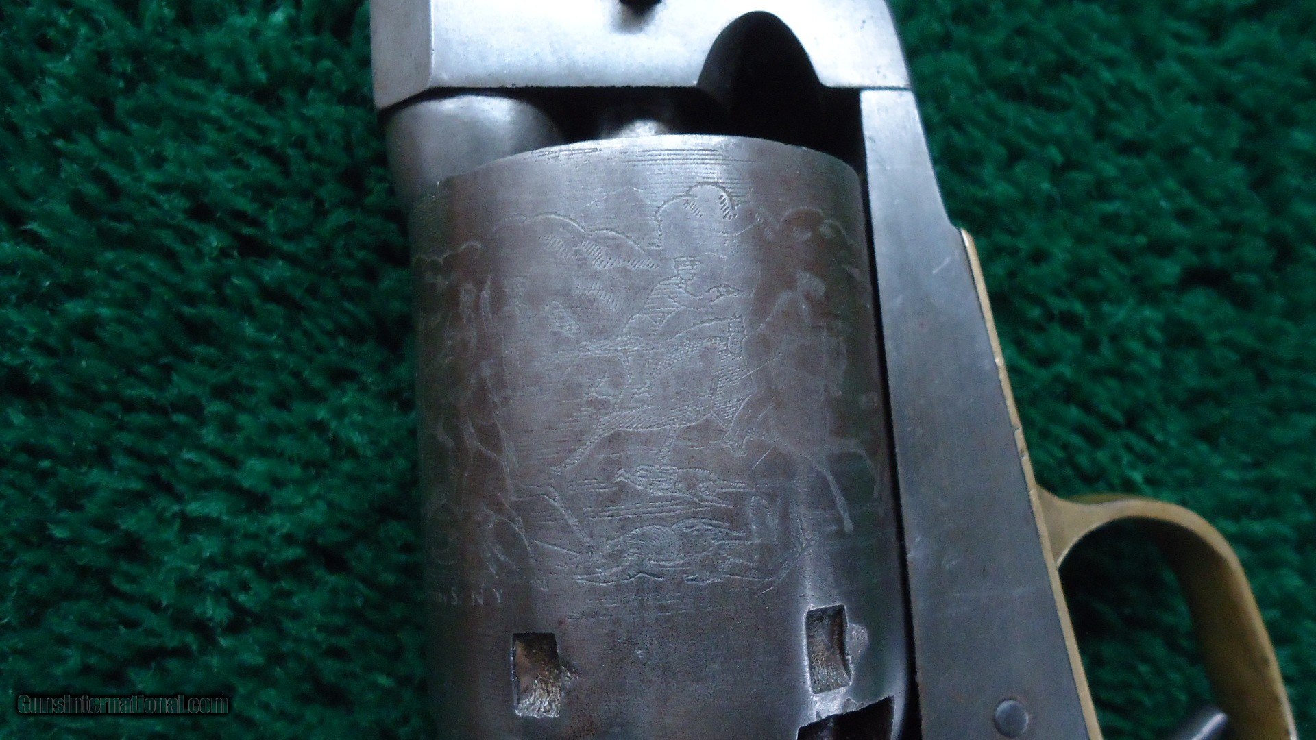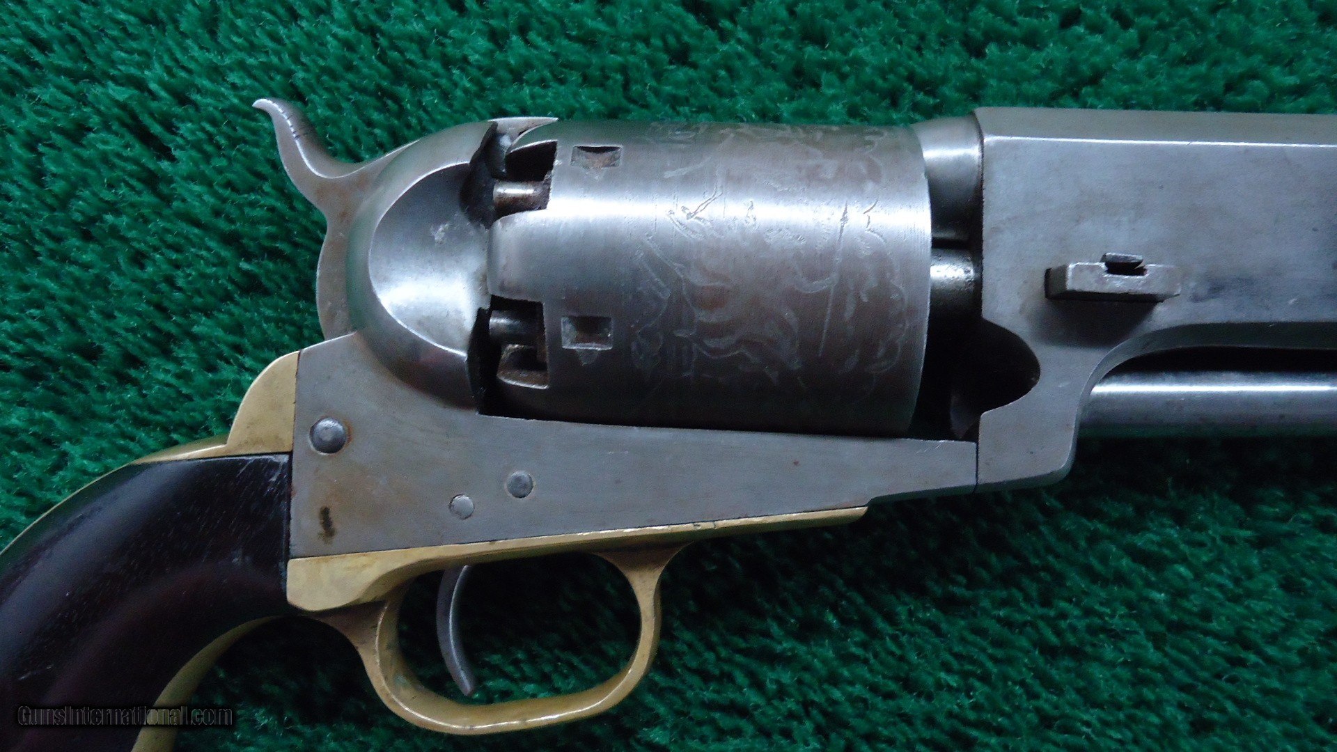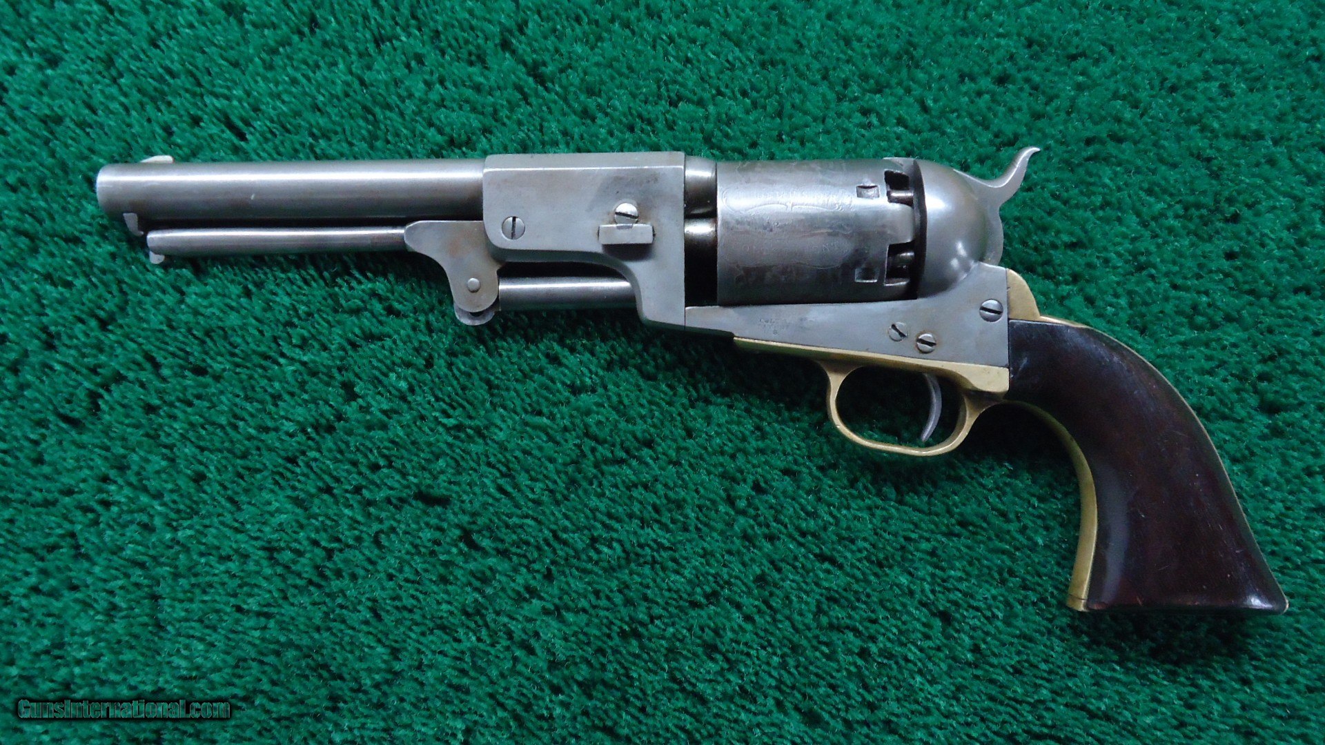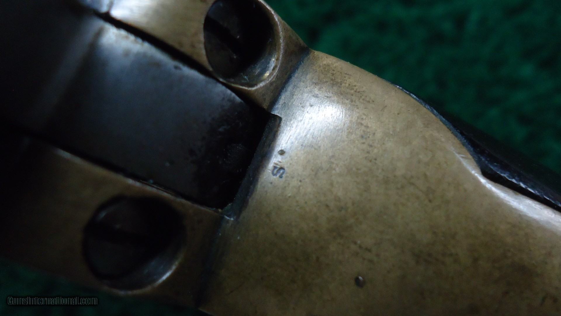 Description: 6 Shot Percussion Revolver with 7-1/2 inch round and part octagon barrel chambered in 44 caliber. Bore has gain twist rifling. Overall metal has been cleaned some time ago and has aged to a gray/brown patina. Good Texas Ranger and Indian fight cylinder scene. Brass backstrap. Nice action. Nice grips that appear to be original with a small piece grafted in on the right side. All matching numbers. These were made from 1851-1861. Leroy Merz Antique Firearms specializes in antique and vintage Winchesters and other fine American firearms. Since 1965 Mr. Merz has taken part in the world of firearms and has been a contributor to many well known reference books. We have hundreds of additional guns in every price range at our home online. Search for Merz Antiques in google. SOLD Antique: Yes Handgun Caliber: .44 |
