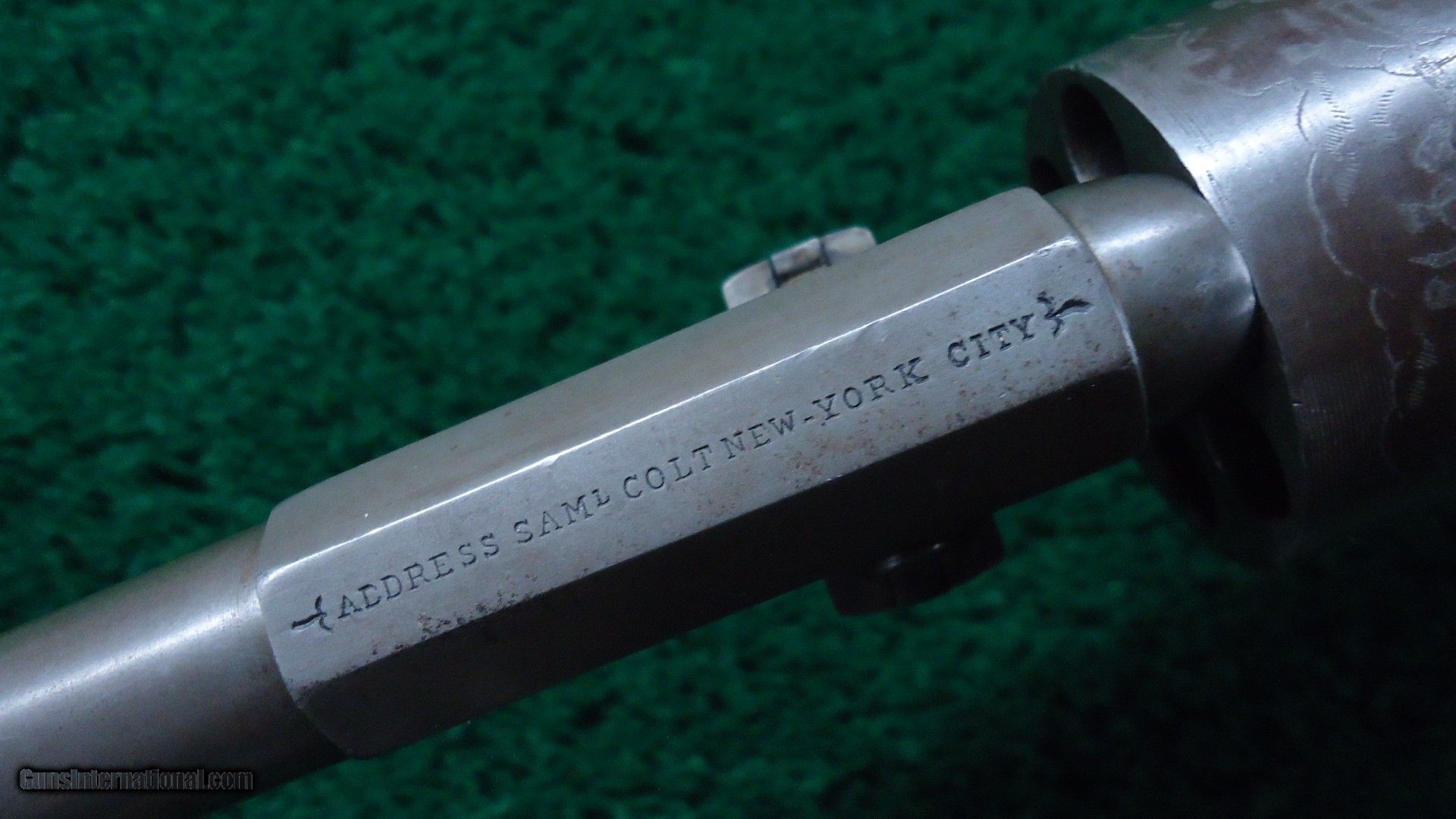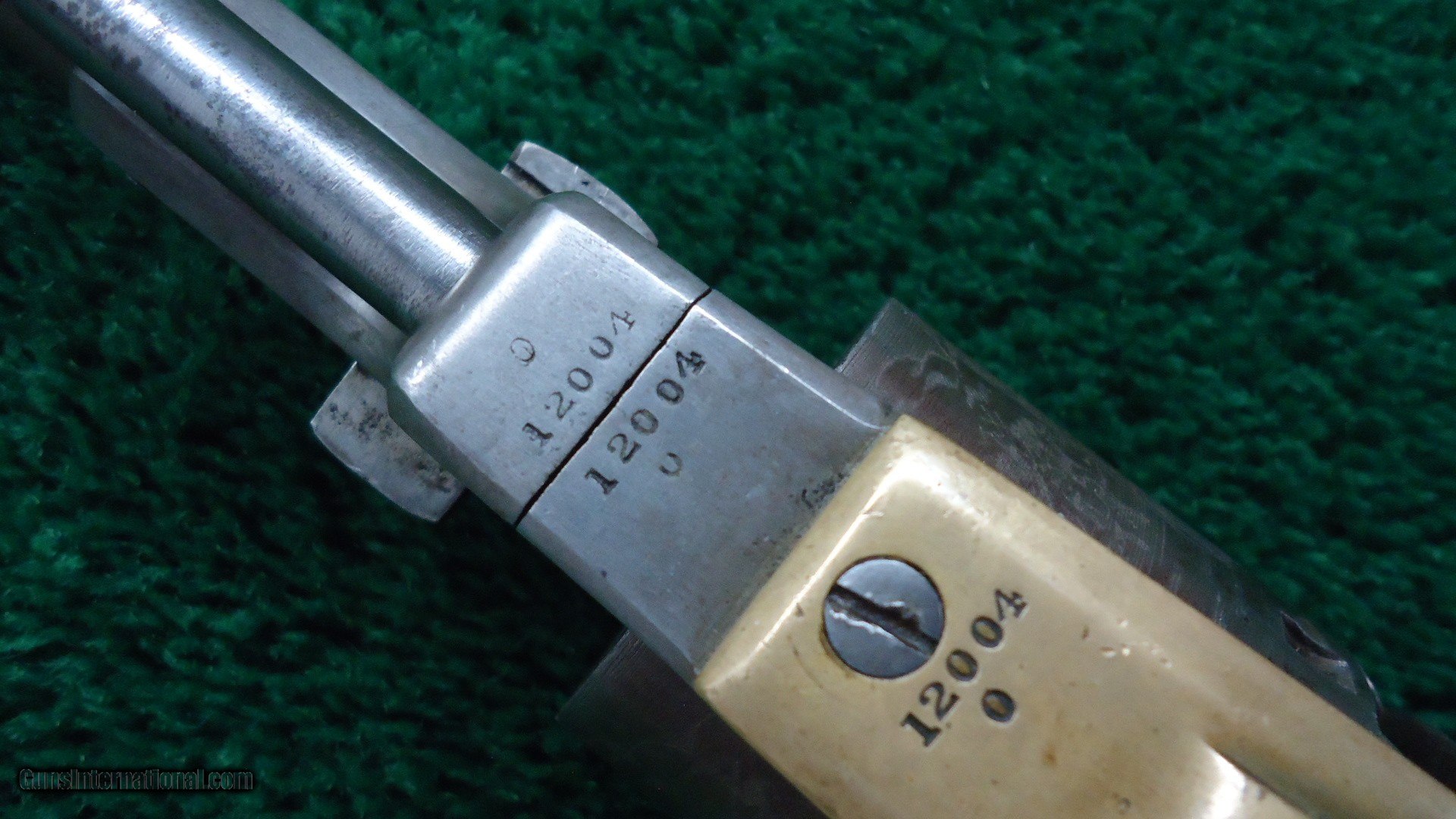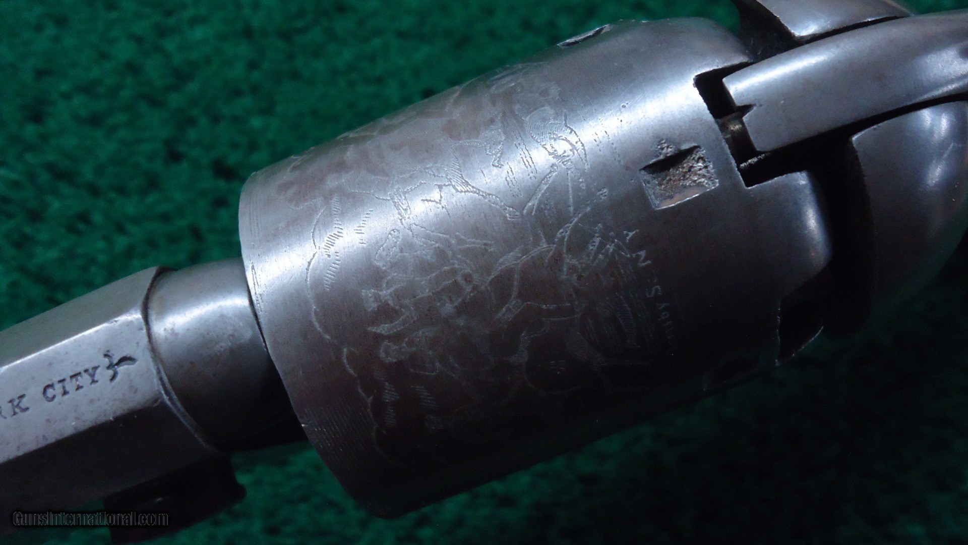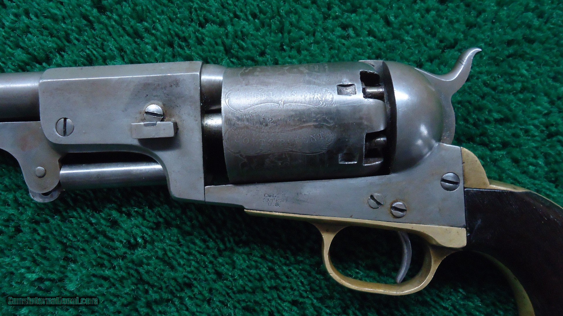 Description: 6 Shot Percussion Revolver with 7-1/2 inch round and part octagon barrel chambered in 44 caliber. Bore has gain twist rifling. Overall metal has been cleaned some time ago and has aged to a gray/brown patina. Good Texas Ranger and Indian fight cylinder scene. Brass backstrap. Nice action. Nice grips that appear to be original with a small piece grafted in on the right side. All matching numbers. These were made from 1851-1861. Leroy Merz Antique Firearms specializes in antique and vintage Winchesters and other fine American firearms. Since 1965 Mr. Merz has taken part in the world of firearms and has been a contributor to many well known reference books. We have hundreds of additional guns in every price range at our home online. Search for Merz Antiques in google. SOLD Antique: Yes Handgun Caliber: .44 |