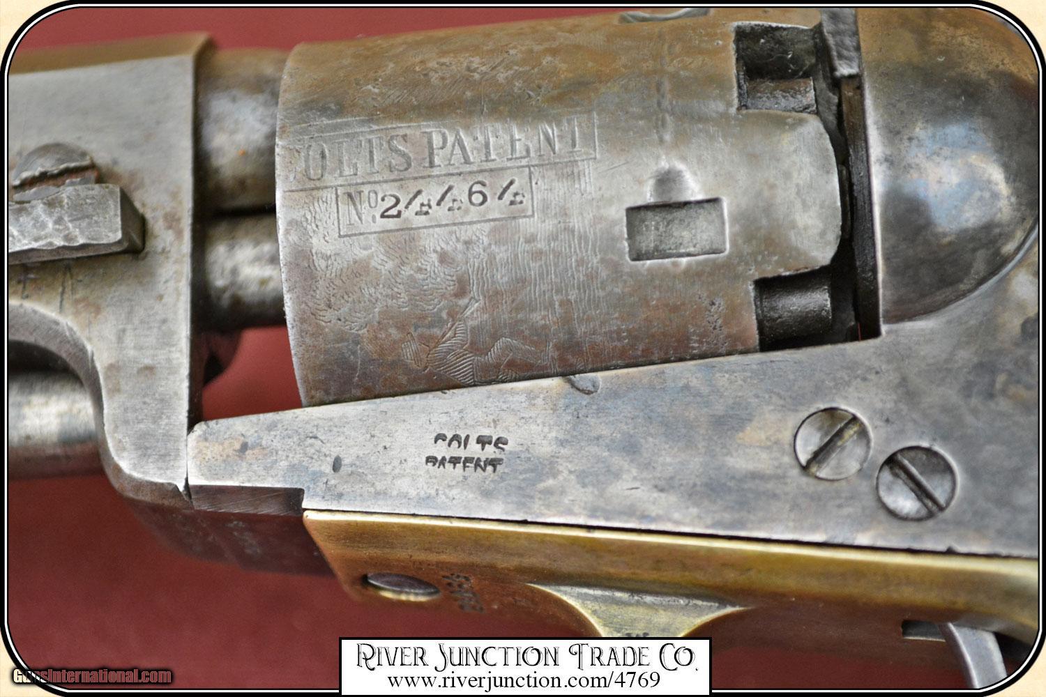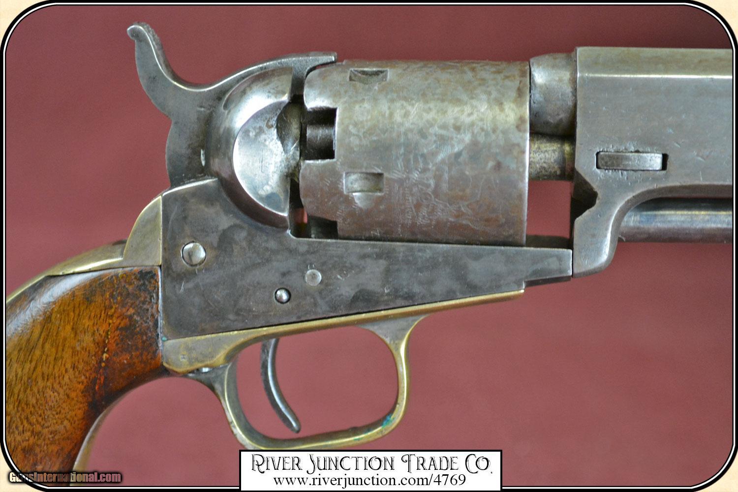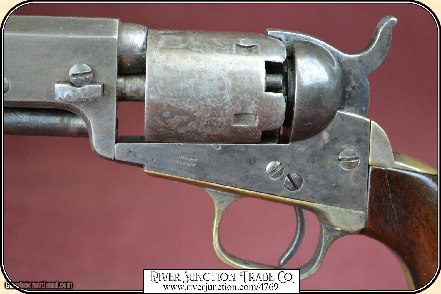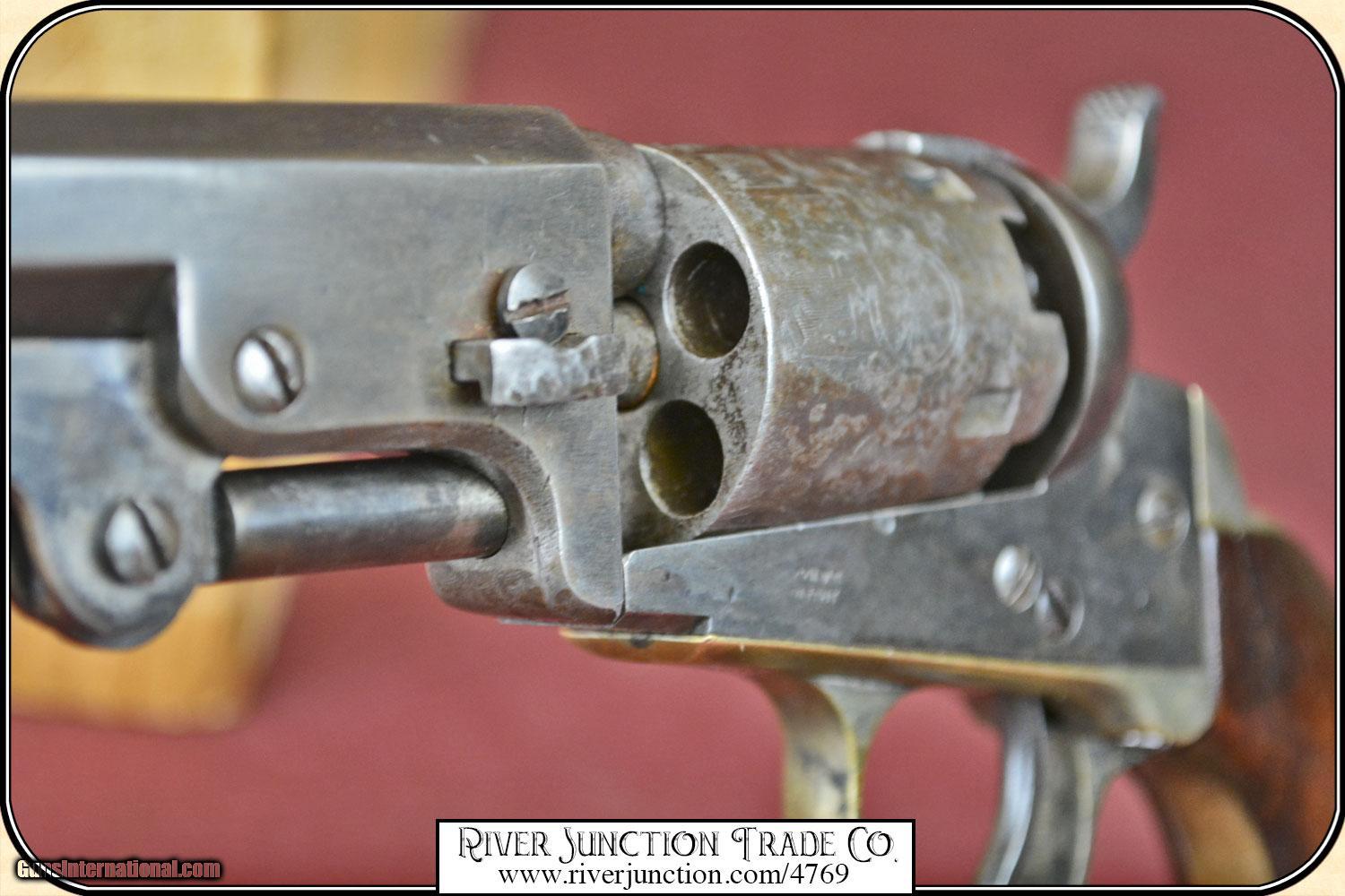 Description: Colt, 1849, 31cal belt model, serial #24464 manufactured in 1851 the second year of production. all numbers matching including cylinder and wedge, cylinder scene is very clear, original blue turning to plum brown, uncommon 5" barrel, walnut grips with 80% original varnish. Very very nice. Manufactured in 1851, .31 caliber percussion, 5 shot single action revolver, with loading lever, Weight = 27 ounces Cylinder engraved with the Stagecoach Holdup scene Markings on barrel in one line - ADDRESS COL SAML COLT U.S. AMERICA This Civil War time period 49 is in fine condition with a bore that shows as mirror bright. I rate it a 10. There is no pitting on the cylinder, barrel and frame. The metal surface is smooth throughout. The mechanically perfect action is tight and correct. The trigger guard and back strap are well patina-ed. The original grips have no cracks. Overall condition fine. This is an ANTIQUE and can be shipped WORLD WIDE directly to you. Sold as an Antique ~ no guarantees, warranties, or liabilities for any actual usage. Payment Cash, postal money order, cashiers check, personal & business checks. Can be ordered with a credit card or paypal at wxx.riverjunction,cxx just type in the number 4769 in the search box. SOLD |