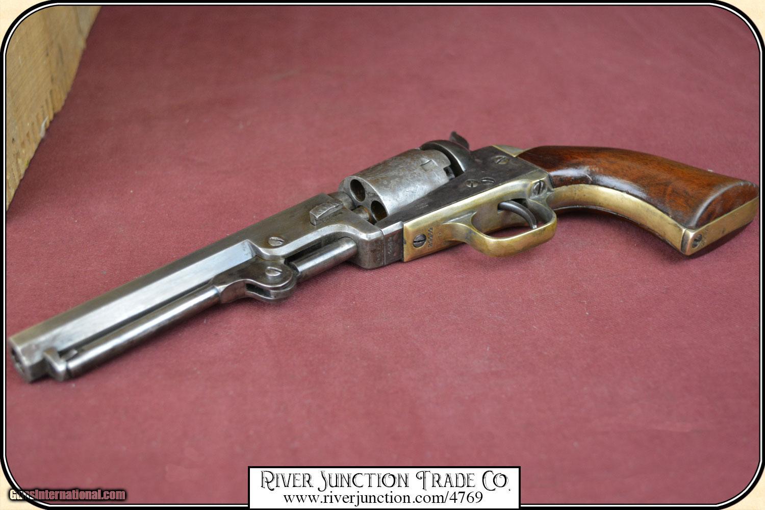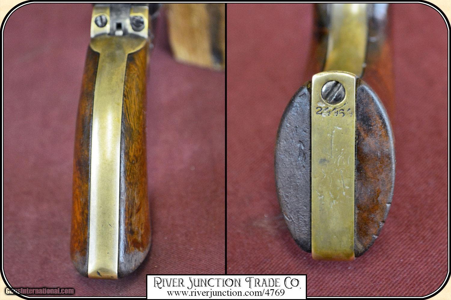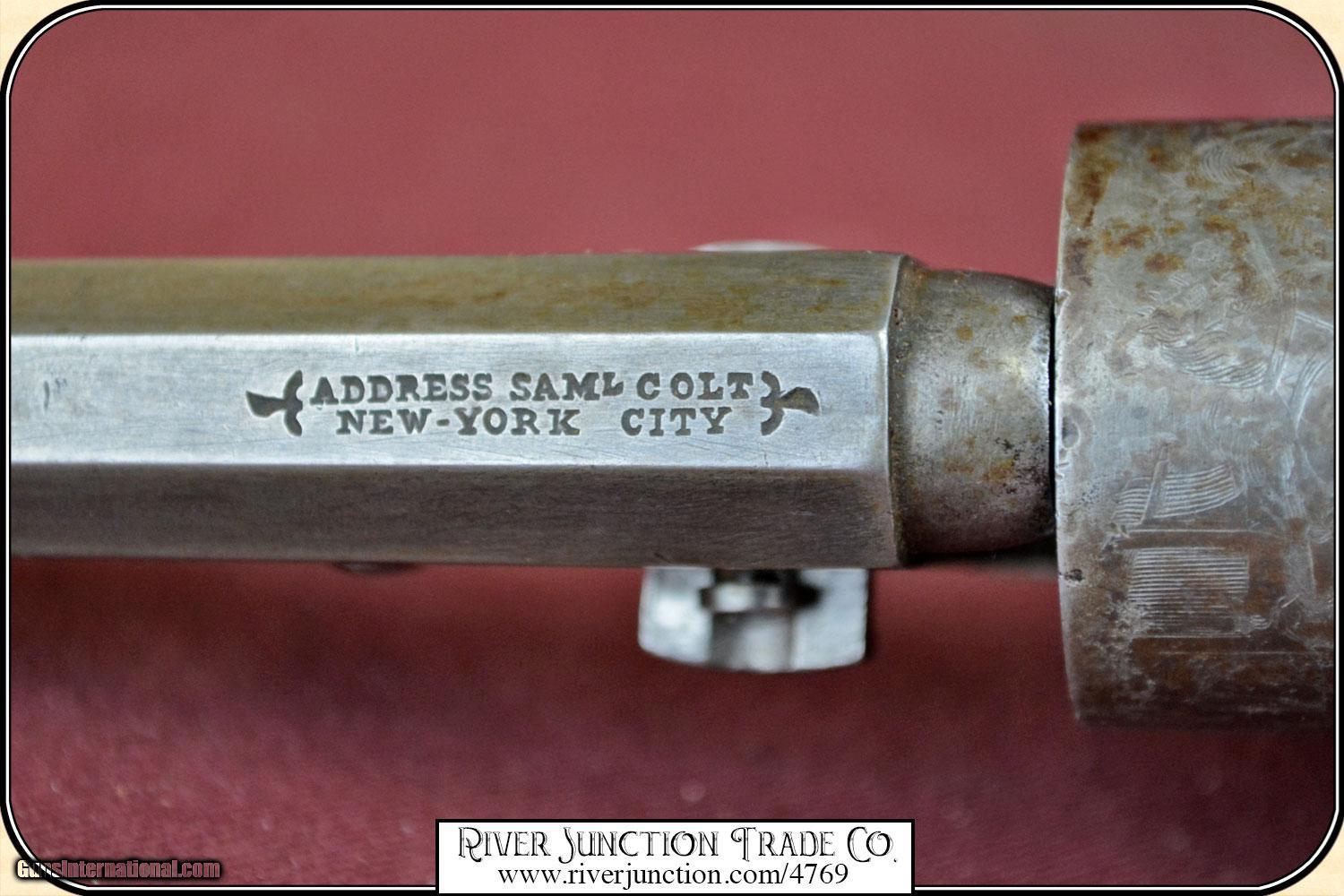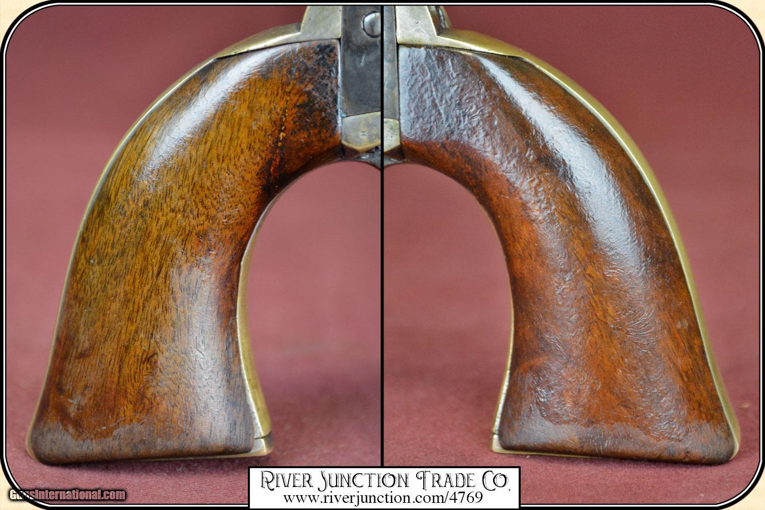 Description: Colt, 1849, 31cal belt model, serial #24464 manufactured in 1851 the second year of production. all numbers matching including cylinder and wedge, cylinder scene is very clear, original blue turning to plum brown, uncommon 5" barrel, walnut grips with 80% original varnish. Very very nice. Manufactured in 1851, .31 caliber percussion, 5 shot single action revolver, with loading lever, Weight = 27 ounces Cylinder engraved with the Stagecoach Holdup scene Markings on barrel in one line - ADDRESS COL SAML COLT U.S. AMERICA This Civil War time period 49 is in fine condition with a bore that shows as mirror bright. I rate it a 10. There is no pitting on the cylinder, barrel and frame. The metal surface is smooth throughout. The mechanically perfect action is tight and correct. The trigger guard and back strap are well patina-ed. The original grips have no cracks. Overall condition fine. This is an ANTIQUE and can be shipped WORLD WIDE directly to you. Sold as an Antique ~ no guarantees, warranties, or liabilities for any actual usage. Payment Cash, postal money order, cashiers check, personal & business checks. Can be ordered with a credit card or paypal at wxx.riverjunction,cxx just type in the number 4769 in the search box. SOLD |