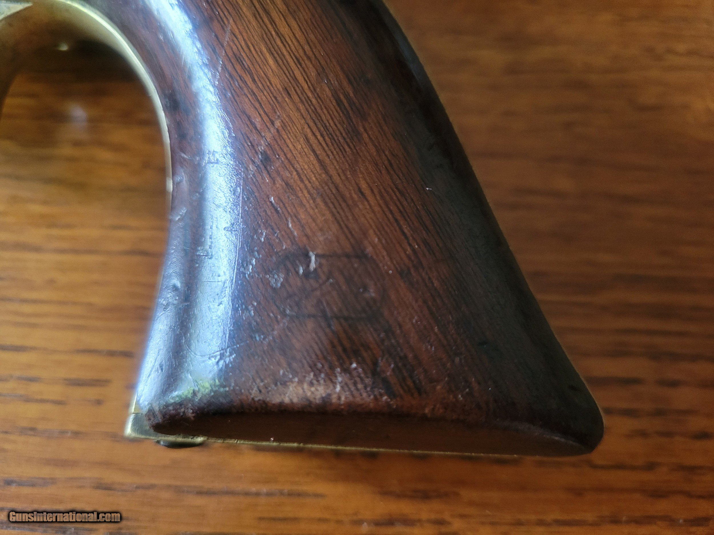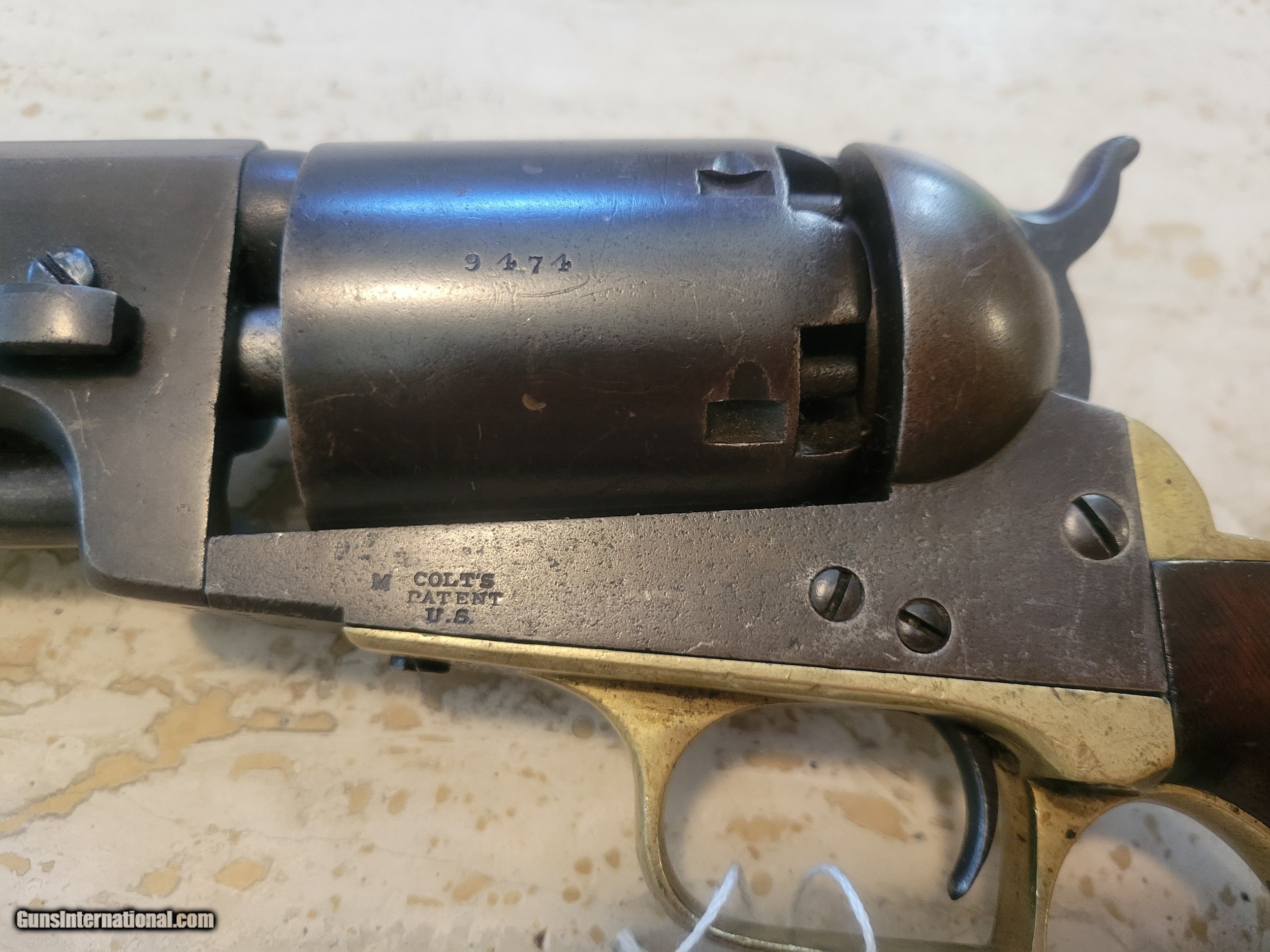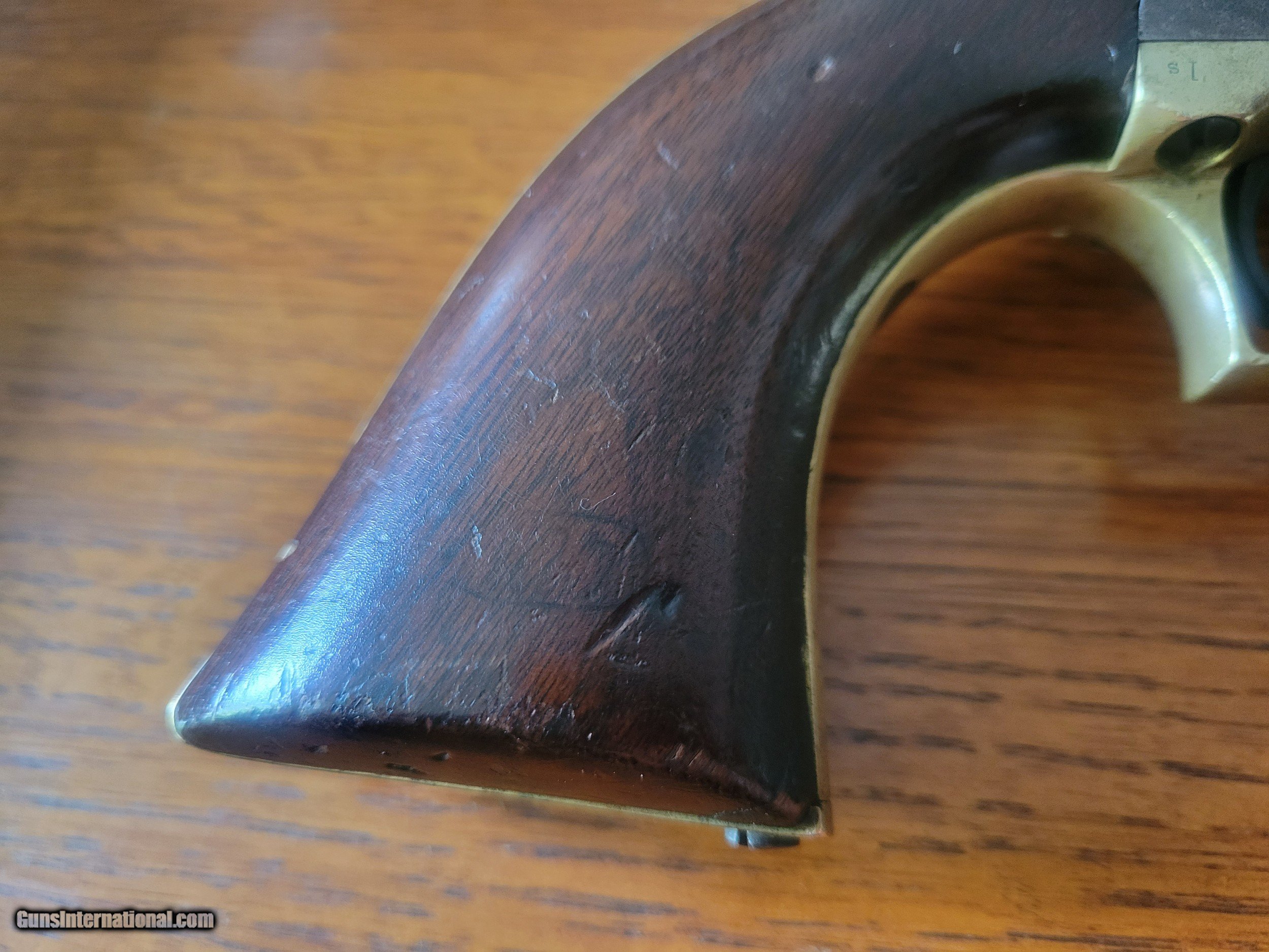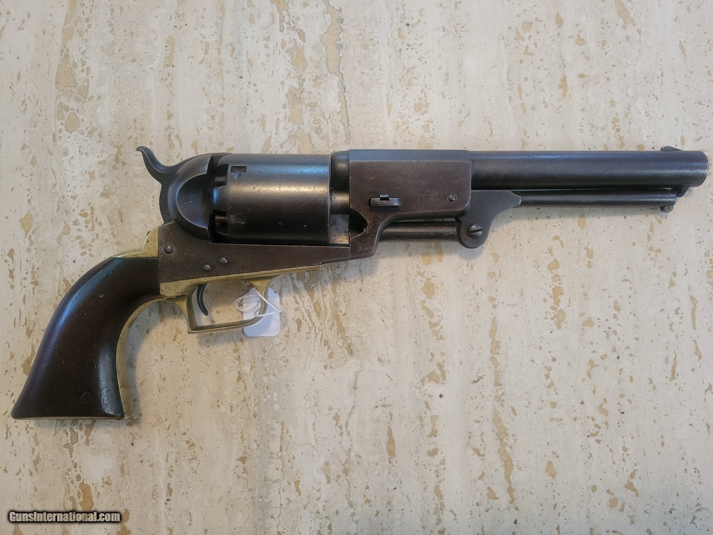 Description: This is a beautiful Colt Second Model Dragoon Revolver. It is a military issue with "U.S." marking. Cylinder scene faint, mismatched number on cylinder, and I don't see a number on the wedge. Overall, an outstanding example for any collection. Functions properly. Thanks for looking. John Added several pictures showing cartouches on the grips and a stamp on right side of trigger guard. Serial number on the cylinder is 9474, well within 2nd Model range. Shipping and insurance to you is included (lower 48). PLEASE NOTE: I do not recommend firing the antique guns that I sell. If you decide to do so, you do it at your own risk! This includes working the actions (locks, hammers, triggers, etc.) Old guns (pre-1899) have old parts, including old springs and other internals (we are talking about 150+ years old, on average!). These parts can and do break. You are not buying a new gun; this is an antique/collectible and it is catagorized as such for that reason. SOLD Antique: Yes |