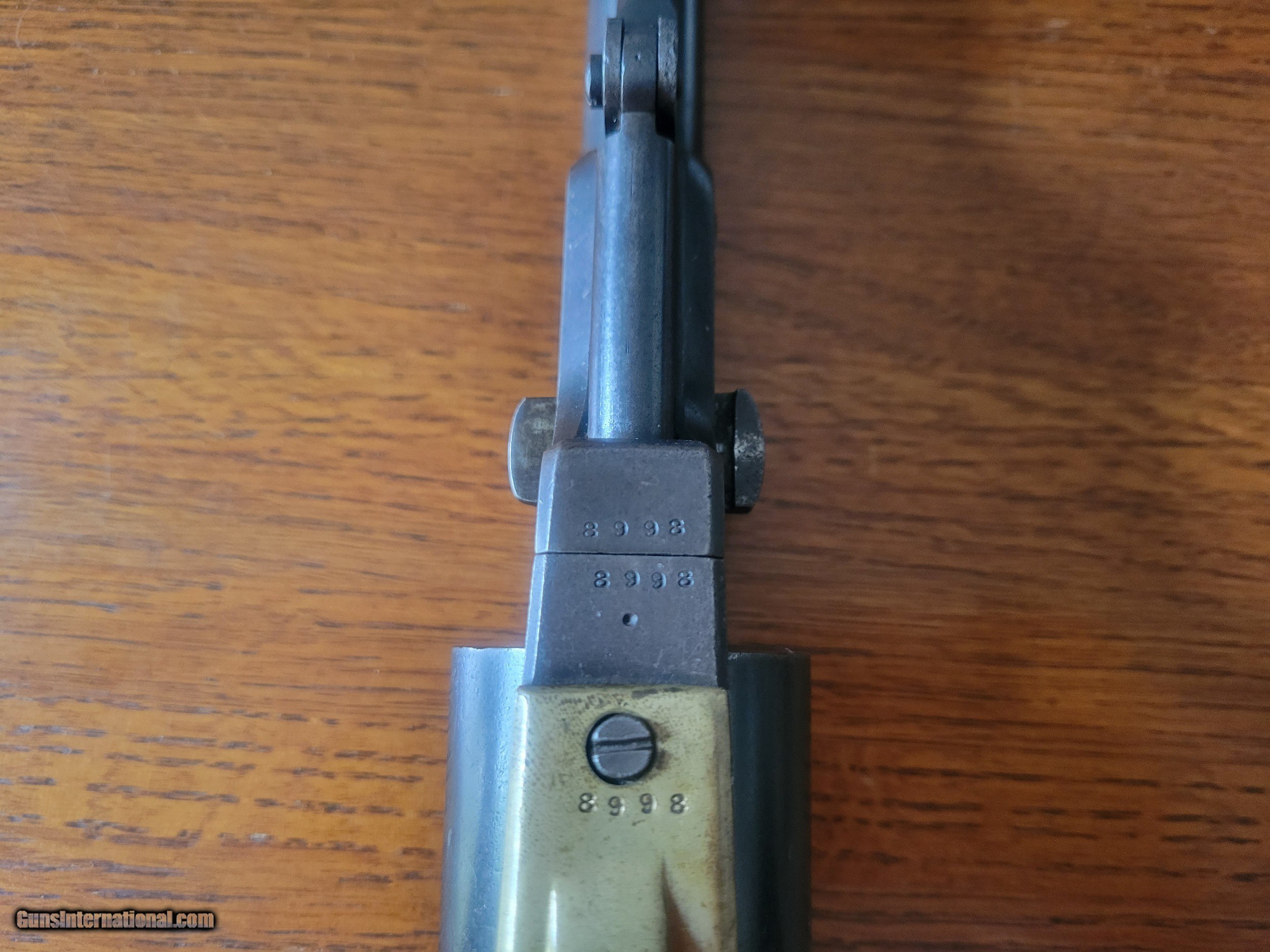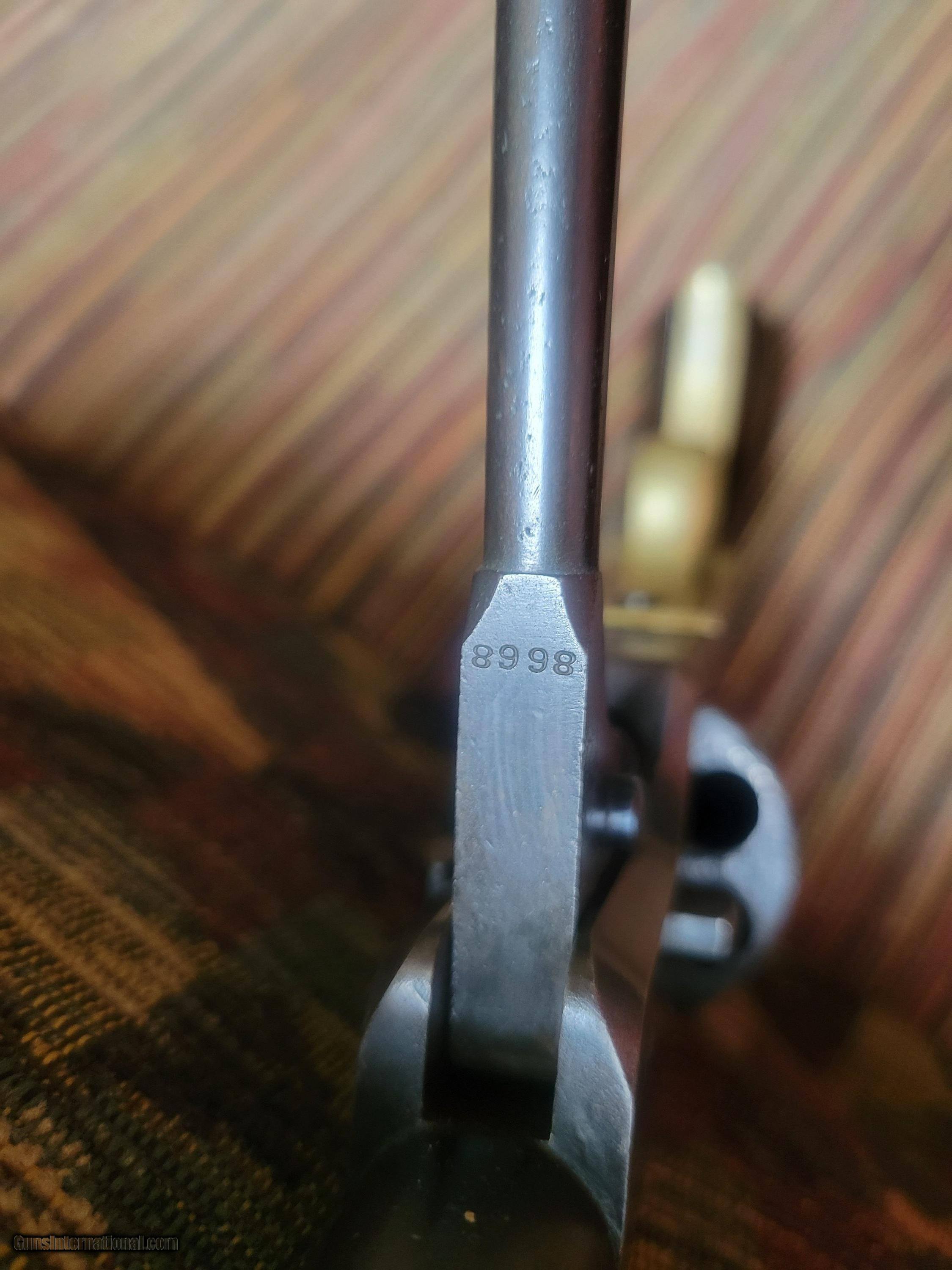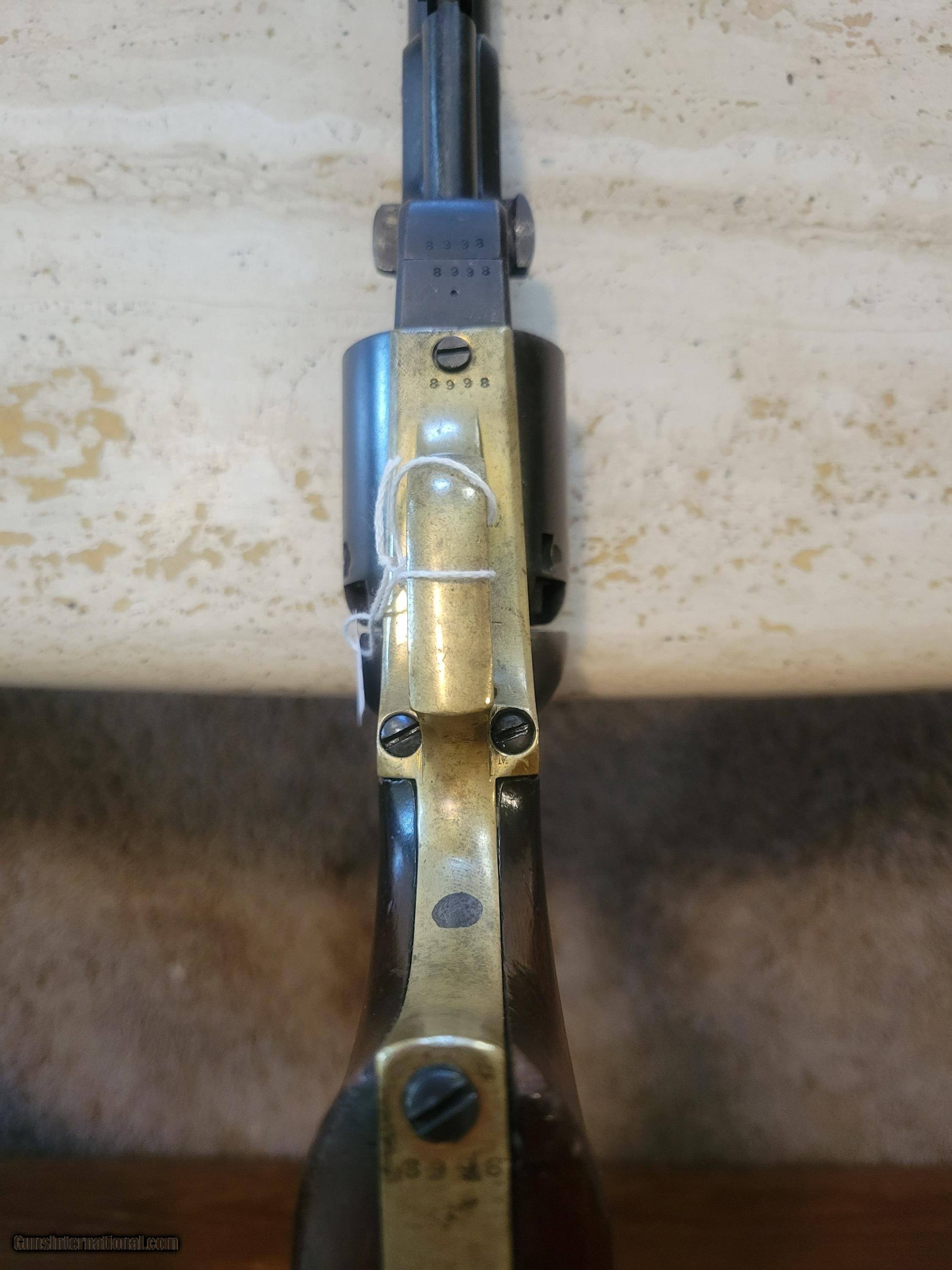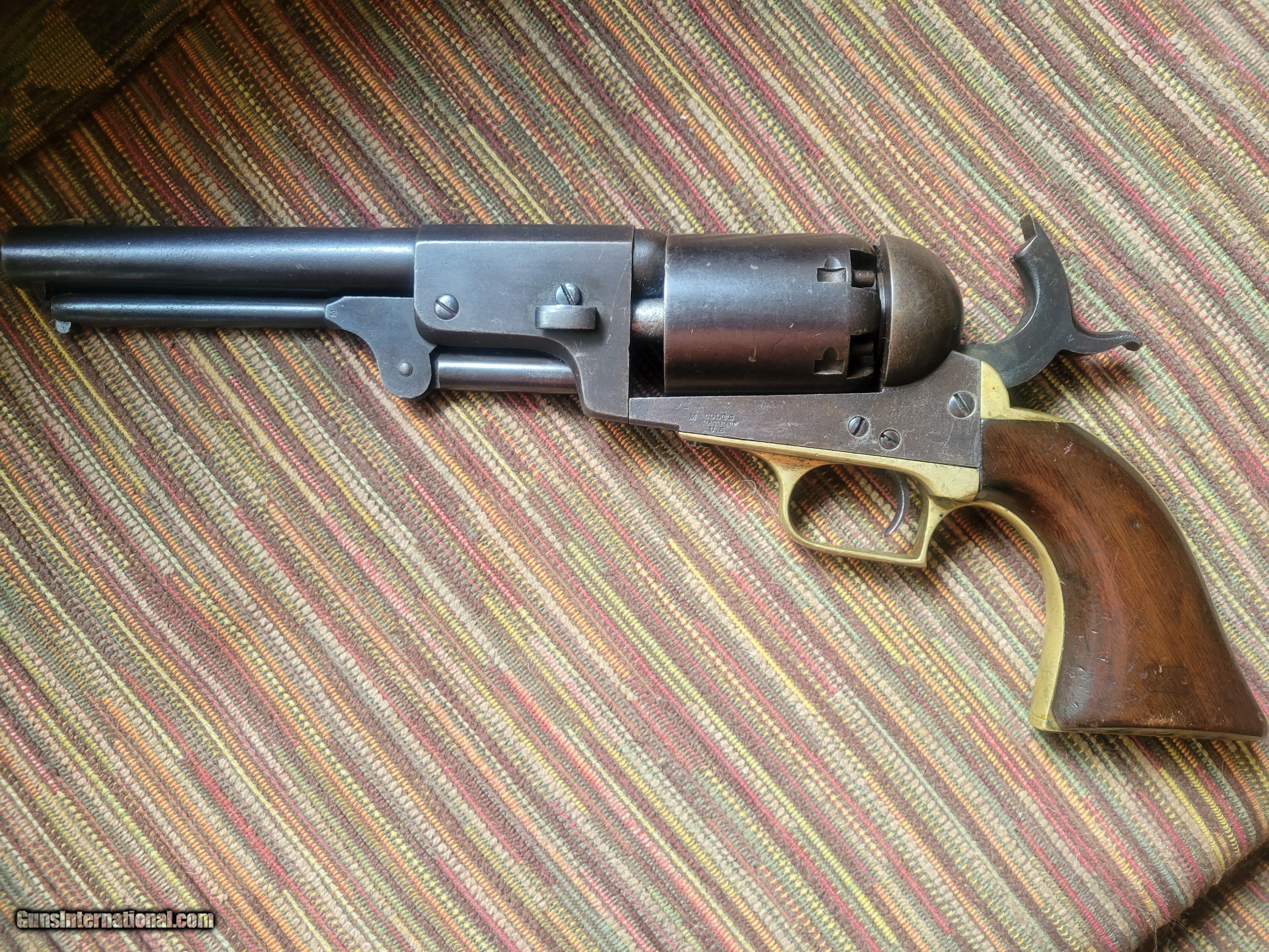 Description: This is a beautiful Colt Second Model Dragoon Revolver. It is a military issue with "U.S." marking. Cylinder scene faint, mismatched number on cylinder, and I don't see a number on the wedge. Overall, an outstanding example for any collection. Functions properly. Thanks for looking. John Added several pictures showing cartouches on the grips and a stamp on right side of trigger guard. Serial number on the cylinder is 9474, well within 2nd Model range. Shipping and insurance to you is included (lower 48). PLEASE NOTE: I do not recommend firing the antique guns that I sell. If you decide to do so, you do it at your own risk! This includes working the actions (locks, hammers, triggers, etc.) Old guns (pre-1899) have old parts, including old springs and other internals (we are talking about 150+ years old, on average!). These parts can and do break. You are not buying a new gun; this is an antique/collectible and it is catagorized as such for that reason. SOLD Antique: Yes |