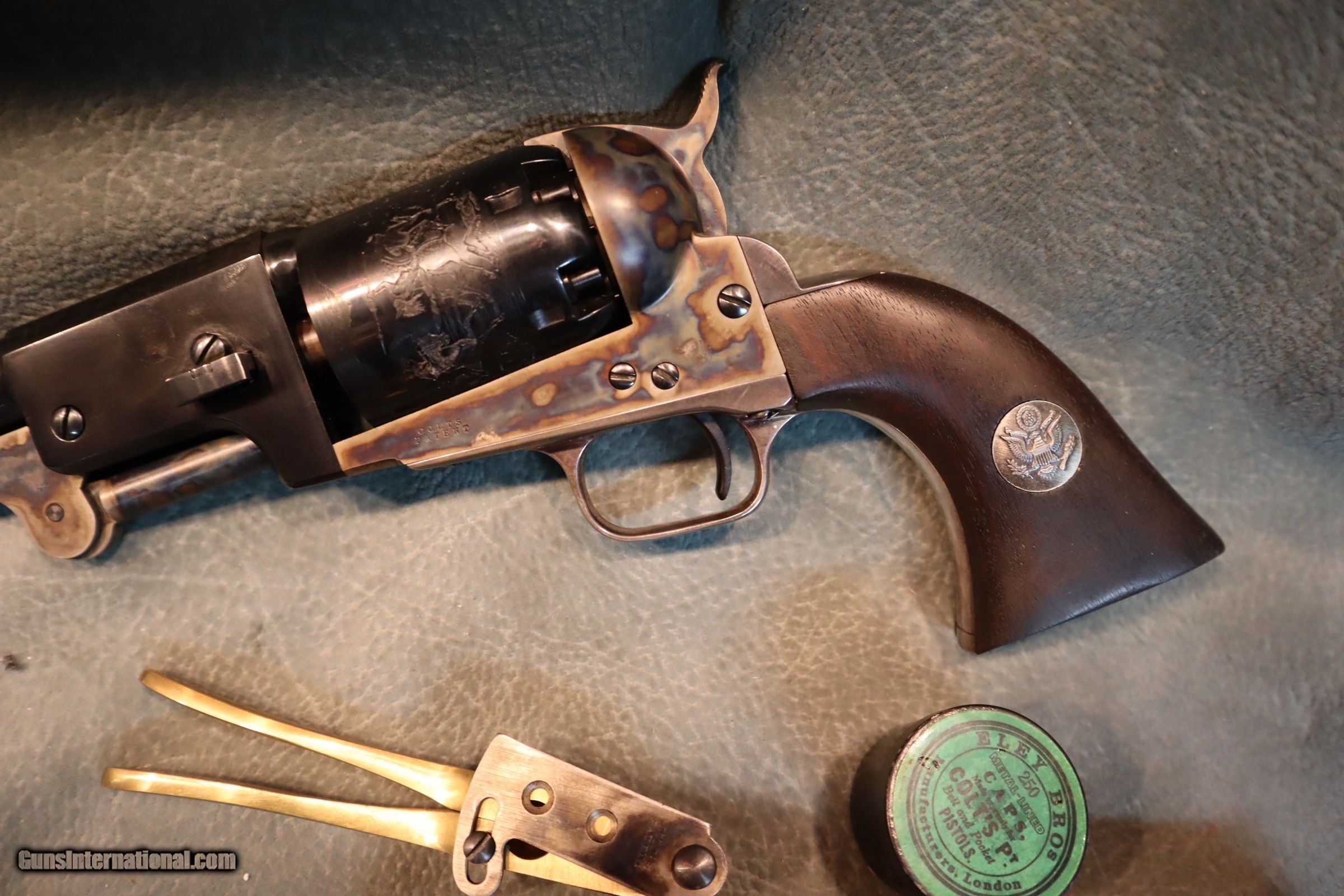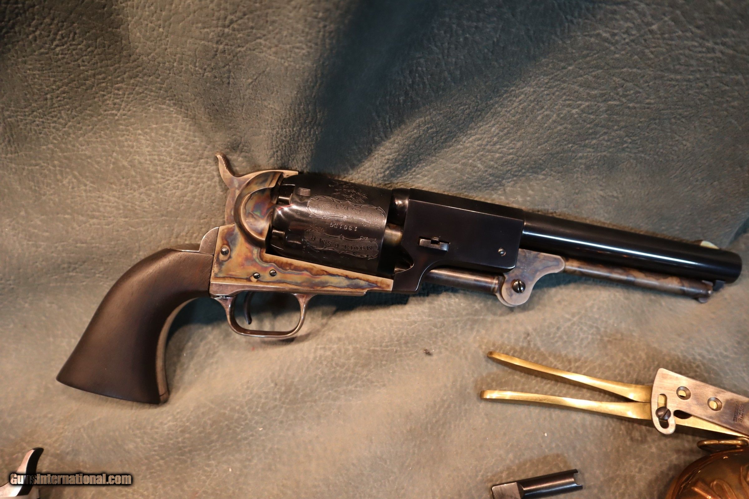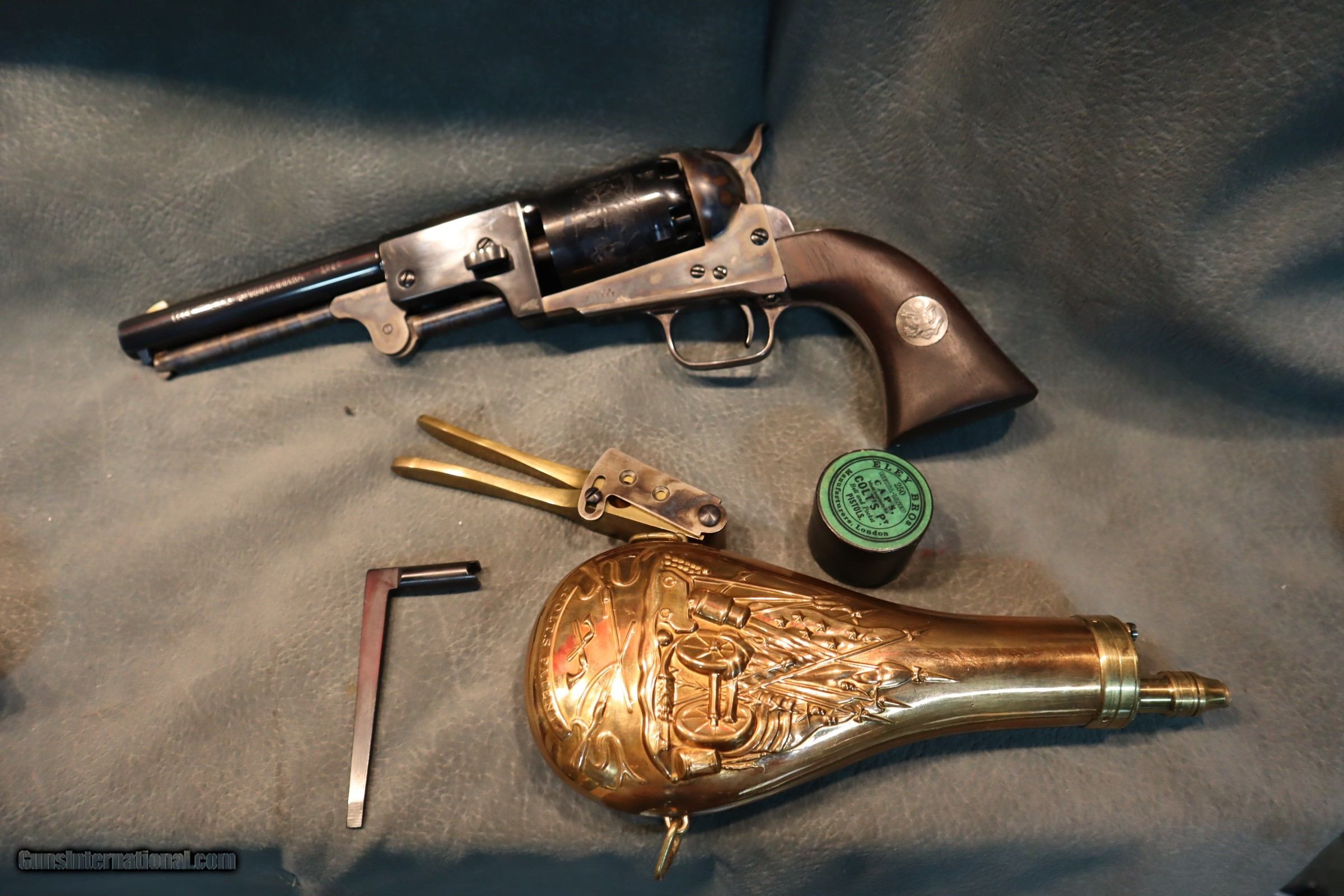 Description: Colt Dragoon 44 Bicentennial 7 1/2" barrel,blue/casecolored,engraved,serial #1301DG,made in 1976,never fired with flask,mold,tool and primer tin. GUN COLLECTIONS WANTED FOR CASH! We buy, sell, consign and trade new and used firearms. This is our 48th year in business. We offer 90 day layaways with 20% down. No return on layaways. Firearms will need to be transferred through a FFL dealer. Prices reflect a cash discount. There will be 3% added to credit card sales. We trade for gold and silver. THANK YOU! SOLD |