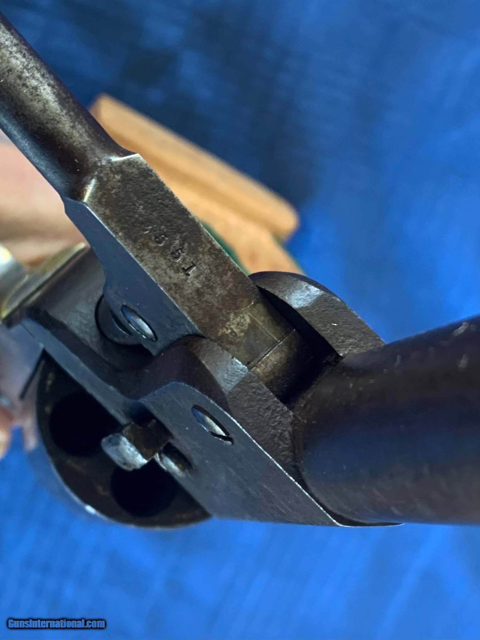 Description: Here's a Awsome Example of a Civil War Colt Dragoon with some Southern Flavor ! Serial number 18551 . Very rare 3rd Model with a 8" barrel. IDD to Pvt. James M. Underhill Florida 2nd Cavalry. Enlisted 2/1/ 1864 and stayed in till end of war ! Most all of the Dragoon production where made with a 7 1/2" barrel. Gun has 3 initials period applied on butt . Overall gun is in Very Good Plus Condition! The original finish had turned a very dark plum patina . Barrel markings are still strong . Cylinder had no scene left just traces . The back strap and brass trigger guard have some original Silver Finish still remaining ! Gun mechanically is in excellent condition. Original Walnut grips still have most of there original finish still remaining . Excellent Un-touched original example ! Please view my photos and email me with any questions? 3 day inspection as allways . Thank you for looking, Little Jo SOLD Antique: Yes Manufacturer: Colt Model: Dragoon Serial Number: 18551 Barrel Length: 8” |