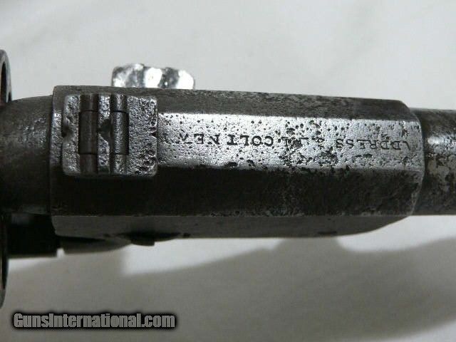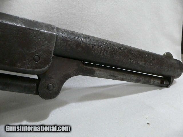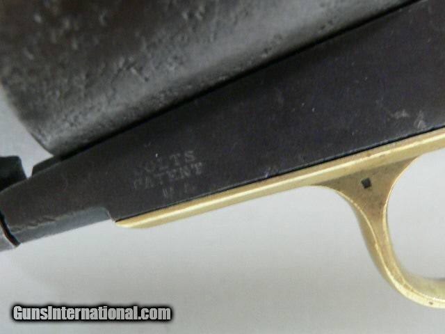 Description: Colt Dragoon This "US" marked martial Colt Dragoon, Manufactured in Hartford Connecticut in 1860 serial number 189xx, is cut for shoulder stock attachment and has the three position carbine sight on the barrel. It is one of the last Dragoons to have the improved horizontal latch on the rammer arm, which was changed in the early 17000 range. Manufactured in 1860, this gun was almost certainly carried during the Civil War and apparently saw use. It has a fine, untouched brown patina, original one piece walnut grips. Serial numbers, on the Frame Backstrap and Trigger Guard 18943 and on the Cylinder Barrel Loading Lever including the barrel wedge is 18944 only one digit difference the last digit. It has a perfectly functioning action and it locks up tight. There were only about 1,500 shoulder stocked Dragoons manufactured . Shipping is $50.00 SOLD Antique: Yes Handgun Caliber: .44 Manufacturer: Colt Model: 3rd Model Dragoon Serial Number: 18943 Barrel Length: 7 1/2 |