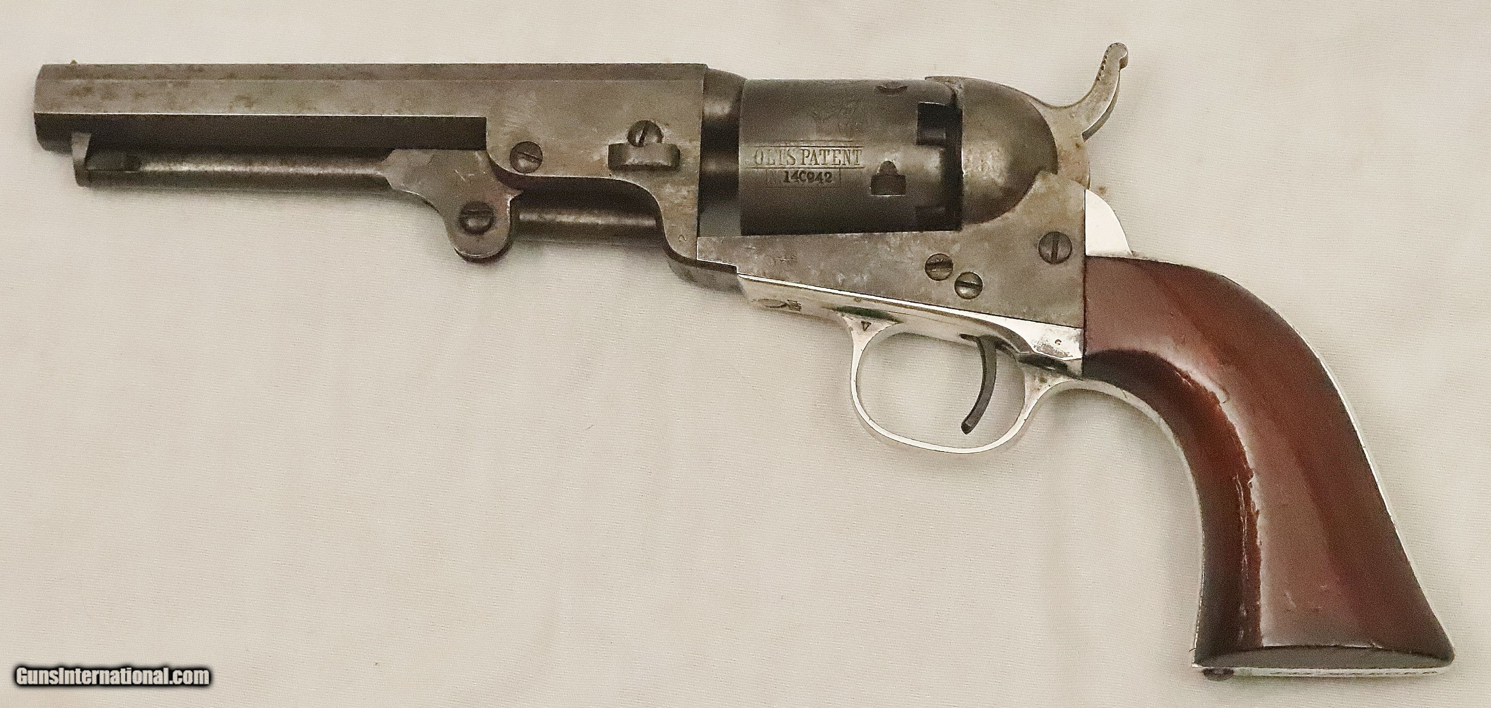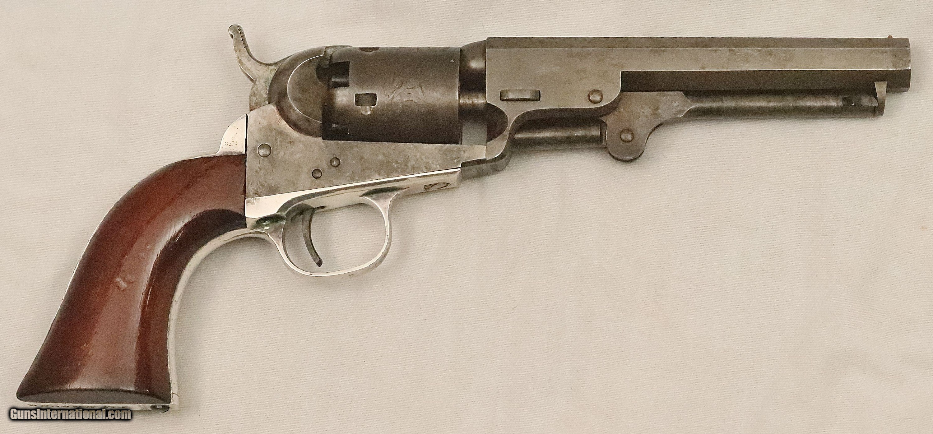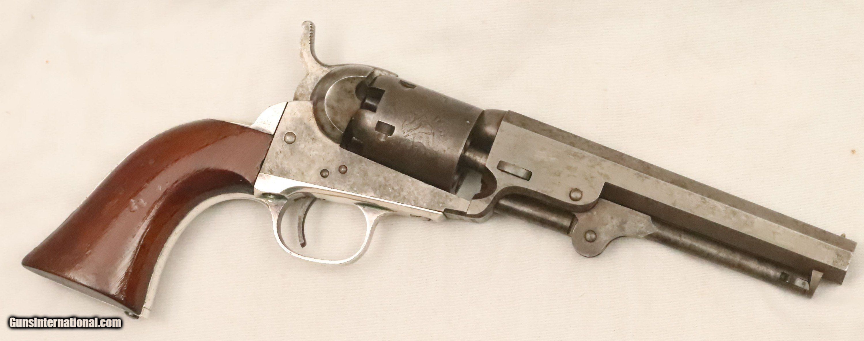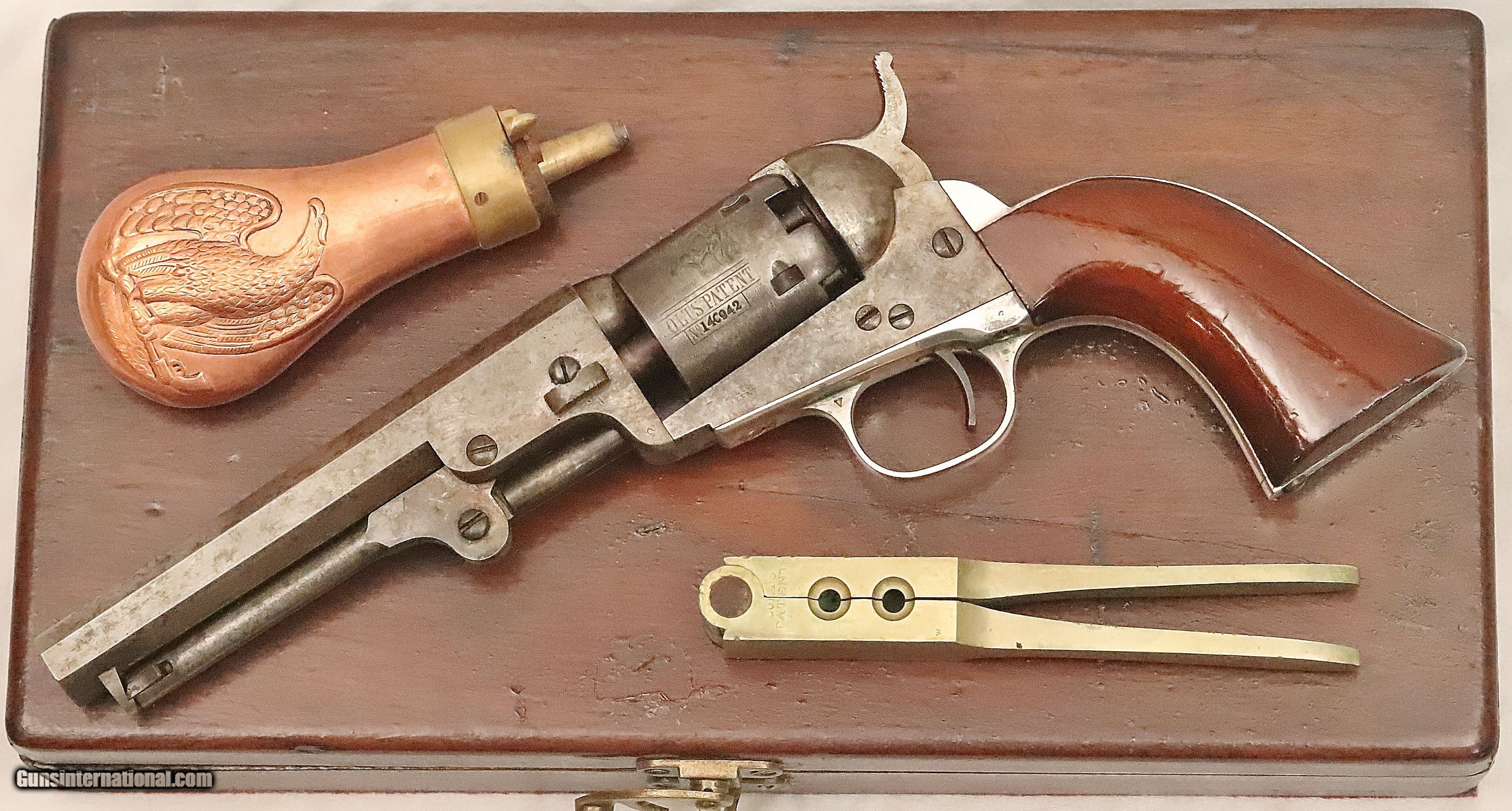 Description: *** PRICE REDUCED *** LAST PRICE REDUCTION BEFORE IT GOES BACK TO THE CONSIGNERS COLLECTION. *** NOTE *** The misplaced original copper Colt Powder flask has been found and added to this offering with no increase in cost. This 166-year-old Colt percussion revolver remains in excellent condition. The roll engraved cylinder scene is exceptional, very strong and legible. The half cock pins are all in place and the cylinder bore is smooth and clean. The bore is strong and bright with only several spots of storage corrosion. Overall, it appears to be little used. The barrel and frame markings are strong and legible. The blued and case hardened parts have turned brown but there is no pitting or corrosion anywhere. The trigger guard and backstrap retain most of the original silver plating that has been polished bright some time past. All parts but the wedge have matching serial numbers. Most interesting is the engraved name on the heel of the backstrap. “JAS. MERCER” is the name, limited research has uncovered no background information. The revolver is presented in the original restored case with two empty English percussion cap tins and a Colt bullet mold. The Colt early mold is clearly marked and shows a single ring on the conical bullet. Serial Number 140942, .31Cal. Percussion with a 5” Barrel. Antique, Proof of age & residence required. Beaver Creek Arms TERMS & CONDITIONS Objective: As a collector of 40 years and Licensed Firearms Dealer since 1989 I have a clear definition of a satisfactory transaction. I will be paid as we agreed and you will be satisfied with your purchase. My goal is to establish a client list of satisfied repeat customers who will recommend me to other collectors. It’s just that simple. Exiled Saudi princes with secret funds needing change from an over paid purchase need not apply. Photographs: It is easy to describe a NEW gun with pictures. Two blurry, poorly lit photos along with the description would suffice. Antique and Collectable firearms are rarely “new” condition. I make every effort to show the flaws in clear detail so that there are no “surprises”. Remember that a beautiful woman in a dark room at 10-foot distance may look different close up in the sunlight with scars, wrinkles, and warts. Notice: ALL Federal, State, & Local firearms laws will be followed. I will take NO shortcuts in the process of a legal sale or transfer, so please don’t ask. SHIPPING: Shipments are made via U.S.P.S. Priority Mail, Insured, with a return receipt. Packing, Shipping and Insurance cost for this handgun is $40.00. Checks are to be made out to “Steve Clark” Address: 380 Beaver Creek Road, Dillsburg, PA 17019 FIREARMS: Antique firearms, pre 1898 do not require a Federal License. For purchase, a copy of a Government Issued Identification (Driver’s License, Etc.), showing date of birth and current address will be required. GUARANTEE: Your complete satisfaction is assured, see objective above. If you are not satisfied, please contact me within 3 days of receipt. Please don’t fire the weapon, safety, function and accuracy are NOT Guaranteed. Any weapon offered by Beaver Creek Arms is never test fired nor is there any representation the gun is functional and safe to fire. These guns are sold for collectors and only represented as used firearms that must be checked by a competent person, observe all the necessary safety precautions prior to attempting to load and fire one of these weapons RETURNS: Returns must be made within 3 days of receipt. They must be received in exactly the same condition with no parts exchanged. If it has been altered, damaged, or fired, a refund will not be made. Packing, shipping and insurance cost will not be refunded. All layaway purchases are returnable for merchandise credit only. PAYMENT: Bank check, Personal check, and Money Orders are preferred. Visa and MasterCard are accepted with a 4% processing fee. LAYAWAYS: A 20% deposit is required. Balance is due in 30 days. Deposits are non-refundable and are forfeited after 40 days. Layaway sales are returnable for merchandise credit only. SALES TAX: Pennsylvania state sales tax is 6% for in state purchases. The payment of other states sales tax, if applicable, for shipped items is the buyer’s responsibility. DISCREET: Client information will remain Confidential. Your privacy is protected. SOLD Antique: Yes |