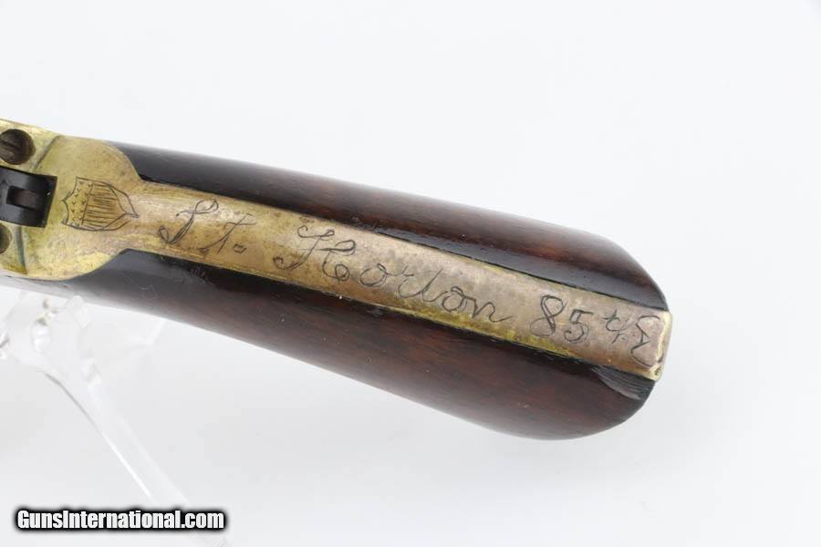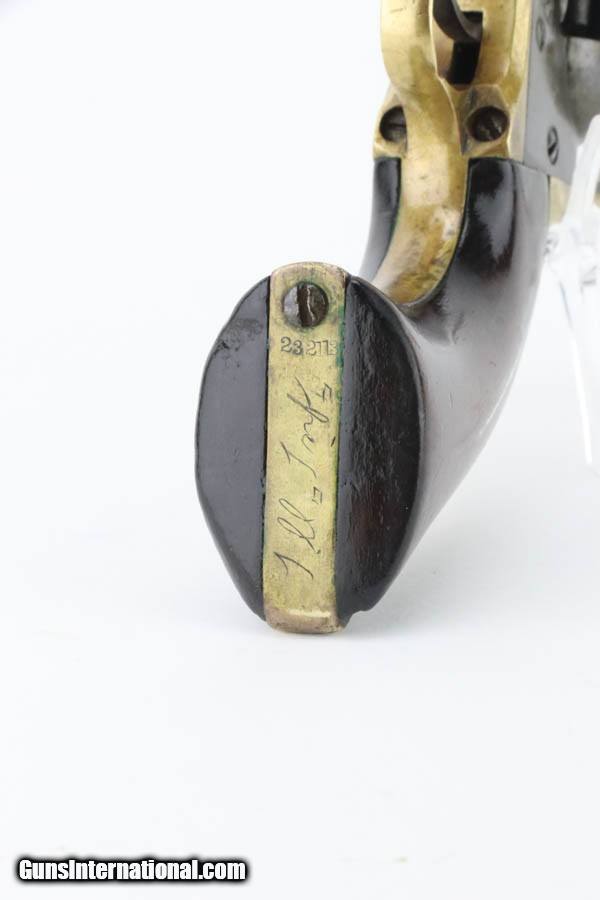 Description: This Colt Pocket Model 1849 revolver manufactured in 1863, chambered in .31 caliber, featuring a six-inch barrel. This example belonged to documented Civil War Lt. Andrew Jackson Horton of the 85th Illinois Infantry, and bears his original, hand-engraved inscription on the backstrap and butt. The markings include a union shield and his unit designation “Lt. Horton 85th” with “Ill. Inf." engraved on the backstrap. The revolver remains in good condition, reflecting its service while preserving its historic character. The original blue finish on the barrel and silver wash on the brass are absent, and there are areas of pitting here and there on the barrel, receiver, and cylinder. Markings are mostly crisp, but the stagecoach scene has faded somewhat, and the "Colt Patent" marking has smoothed and become less distinct. Mechanics are functional, but suboptimal. The loading lever catch spring is weak, cylinder lockup has some give to it, hammer is slightly loose on pullback, and the timing is off. Bore still has pronounced rifling, but is heavily pitted throughout. The grips are excellent, but do show show minor handling marks and edge rounding, with one small ding on the bottom of the right panel. Notably, the revolver's matched serial number dates its production to 1863, coinciding with Horton’s promotion to 2nd Lieutenant. This listing includes photocopies which thoroughly document Horton's service history and record. .................................................. Born in Ohio in 1835, Horton moved to Illinois with his family in 1853. Enlisting in August 1862, he joined Company H of the 85th Illinois Infantry, a regiment that saw extensive action in the Western Theater. Captured during a skirmish near La Vergne, Tennessee, Horton spent four months as a prisoner of war before his exchange in March 1863. Shortly afterward, he was promoted to 2nd Lieutenant and likely purchased this pistol, as officers were required to provide their own equipment. Horton rejoined his regiment in time for the grueling campaigns of 1864, including battles at Resaca, Dallas, Kennesaw Mountain, and Peachtree Creek, suffering heavy casualties in several engagements. The regiment played a critical role in Sherman’s Atlanta Campaign, the March to the Sea, and the Carolinas Campaign, culminating in the Battle of Bentonville and the capture of Raleigh. Horton was promoted to 1st Lieutenant in 1864, and later commanded Company B during the war’s final months. After participating in the Grand Review in Washington, the regiment was mustered out in 1865. Following the war, Horton returned to his Illinois farm, where he became a respected community member, serving on the county board and in local offices. He lived a long life, passing away in 1933 at the age of 98, and is buried alongside his wife in Fulton County. This revolver is more than a firearm; it is a relic of Civil War history, intimately tied to a Union officer who witnessed some of the war's most decisive campaigns. It stands as a testament to the personal and collective sacrifices of the soldiers who served. SOLD Antique: Yes Handgun Caliber: .31 |