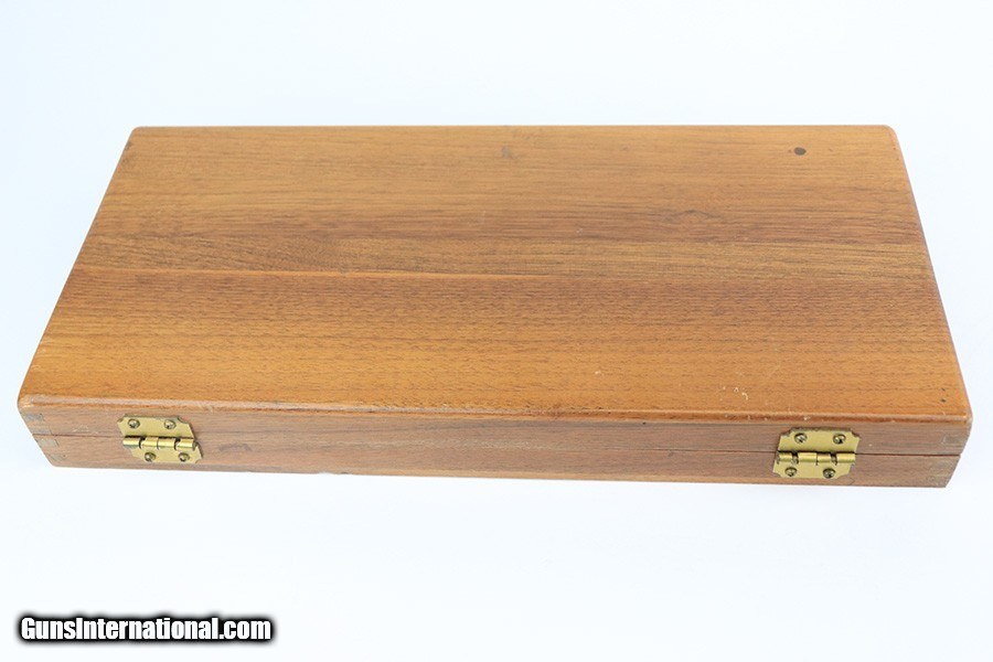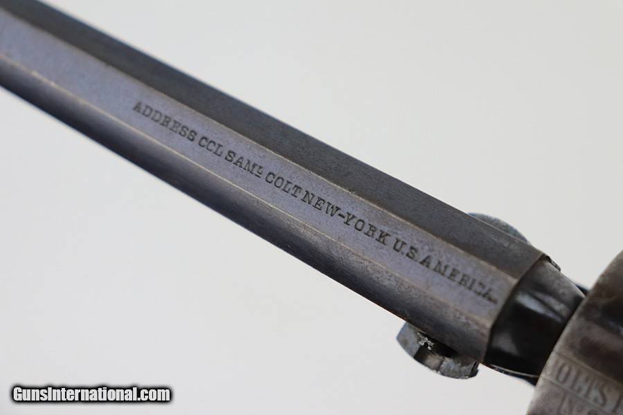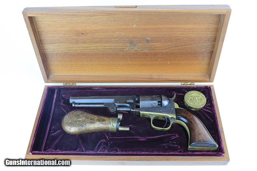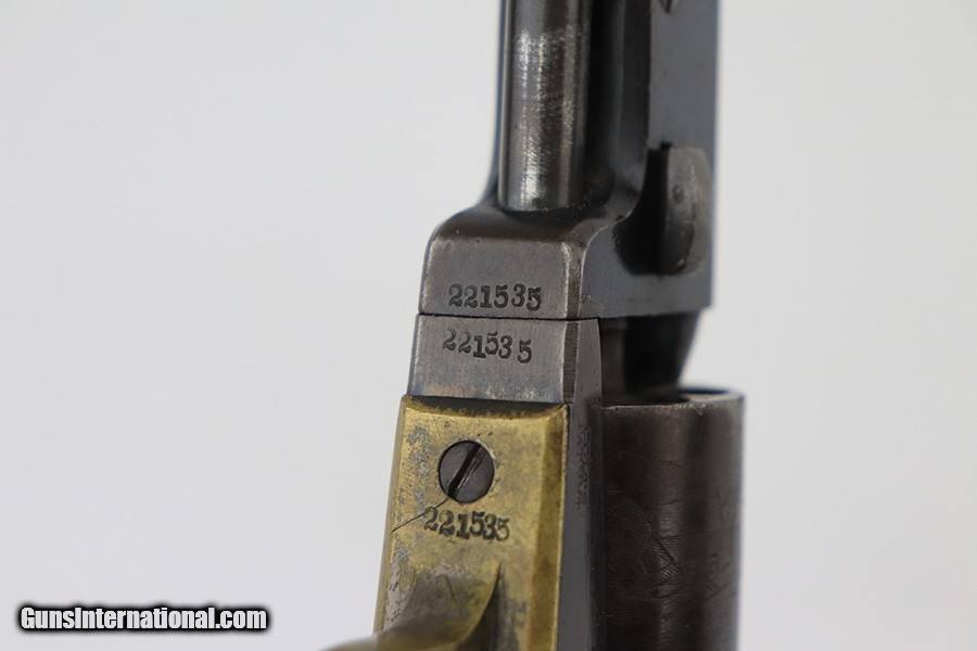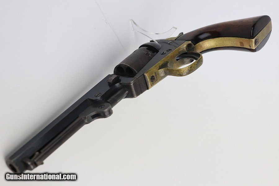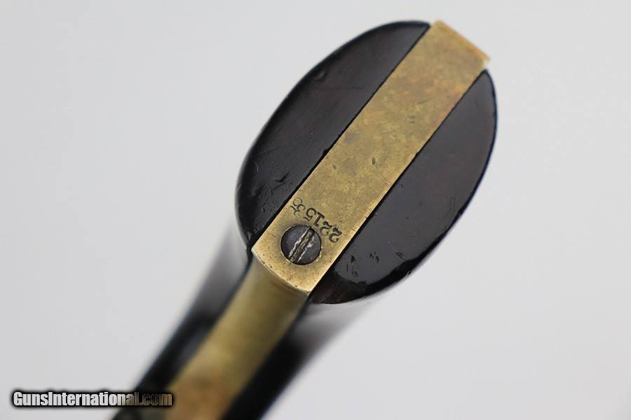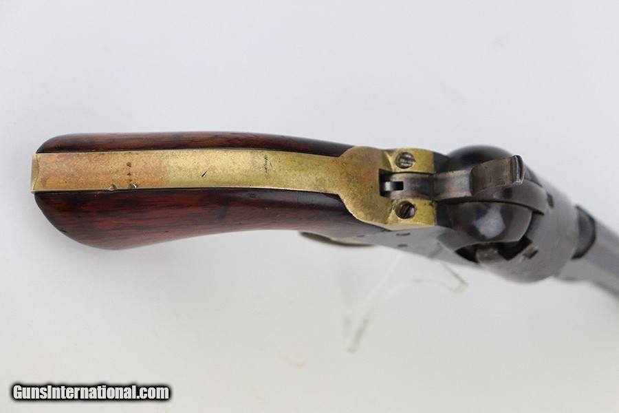 Description: This is a very nice example of an antique Colt Model 1849 Pocket Revolver, chambered in .31 Caliber and manufactured in 1862. The gun is all matching and has the iconic Colt stagecoach scene on the cylinder. It comes with a nice brass powder horn and a tin of Hick's percussion caps. The gun also comes in a really nice custom-made wood box that is lined with maroon velvet - we don't believe it is original to the gun. Overall, the gun is in very nice condition, retaining the majority of its finish. There is minor wear on the high edges in general. Light scratches and tiny pin-pricking on all surfaces of the barrel. Roll mark on the cylinder. There is spotty discoloration on the brass frame from age. The cylinder is tight. There is a scratch on the bottom of the frame around one of the screws. Comes with nice period-correct wood grips - small chip in the bottom corner of the right grip panel. The bore has decent rifling, but there is spotty oxidation throughout. SOLD Handgun Caliber: .31 Bore: 6/10 Condition: ~85% |