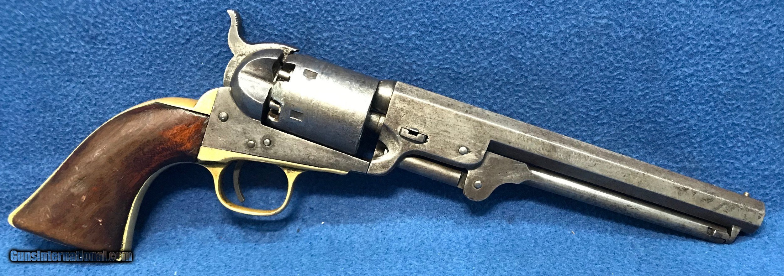 Description: Inv. 7226 Colt Mdl 1851 Navy, Cal .36 Perc. Ser 1360XX. Just a lovely old warhorse that came from an old estate and is nice condition for the collector that doesn't want to mortgage the ranch to own one. The gun has an overall aged silver patina.There is no real evidence it had any dings or rust other than just the usual slight patches of pin pricks. The cylinder scene has faded. The nipples and the chambers show very little if any use. The frame, cylinder rod, trigger guard, backstrap, barrel and loading lever all match. The brass parts have a similar soft aged patina and do not show any damage. The walnut grips have retained about 85+% of the original lacquer with no chips, dings or splits. The gun locks up tight, indexes and fires properly. The bore is quite bright with sharp well defined rifling and just a bit of light frost. A lovely example of a Civil War icon a great value and quite modestly priced for the less than the very critical collector or re-enactor. And as always we guarantee you will be pleased with your purchase...SHIPPED...$1895. To purchase this firearm or if you want to request more information contact us at: Email ckgunsymail Phone 201-512-0002 Cell 201-575-6838 FAX 201-215-4759 We accept most major credit cards. Prices shown are Discounted 3% for Cash or Check. The buyer must be familiar with all the laws governing the purchase and the ownership of firearms in their own city and state. The Yankee Armorer, Inc is not responsible for any failure to comply with or observe these laws. The Yankee Armorer, Inc will only ship after full payment and receipt of all required documents. Shipping: Add $35.00 for handguns, $45.00 for long guns. New Jersey buyers are subject to a 7% sales tax. The Yankee Armorer, Inc offers a 3 day inspection period with full refund upon return of intact firearm and in the original condition. The Yankee Armorer, Inc offers a no interest lay away program - 25% down; 25% in 30 days; 25% in 60 days; and full payment in 90 days. Any violation of this policy is subject to restocking and forfeiture of all payments. Any variation from this policy must be agreed to in advance. Unshipped Cancelled sales are subject to a 20% restocking fee. Be advised that all firearms sold by The Yankee Armorer, Inc. or the Gun Exchange, LLC (SELLER) are sold as collector’s items. They have not been fired or tested for safety and must be examined by a license gunsmith prior to use. By purchasing any item from the (SELLER), you are agreeing to hold the (SELLER) free from any damages or lawsuits of any nature. Any item left for transfer or storage will be charged to $25.00 per month, per item from the day of its receipt. Any variation from this policy must be agreed to in advance. Store hours 10:00 am to 5:00 pm Tuesday -Saturday. It's always best to call for appointment. Store 201-512-0002, cell 201-575-6838. SOLD Antique: Yes Manufacturer: Colt Model: 1851 Navy Serial Number: 1360XX Caliber Info: .36 Percussion |