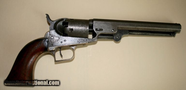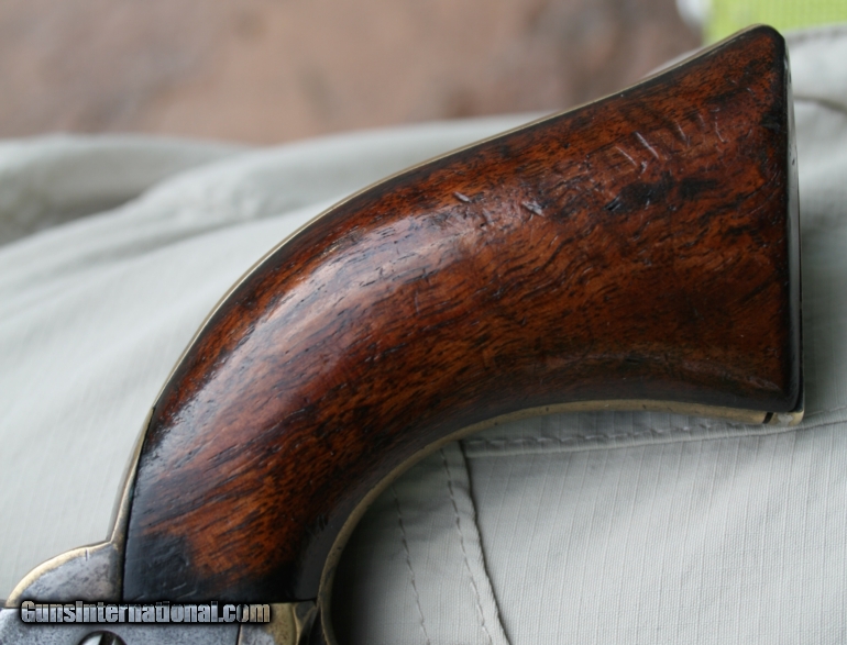 Description: Fine Colt Model 1848 Baby Dragoon, serial # 14169 (1850 manufacture). Fine condition, with 95% cylinder scene, 25% of the original silver plate, and fine plus grips with 95% of original varnish. All markings are sharp, and steel shows the beginning of salt and pepper erosion. All parts are original, including the usual squareback trigger guard. Photos show well the colors and surface conditions. The cylinder scene condition makes this a very rare example. I'm not a dealer but a private collector. Thanks for looking. SOLD Curio/Relic: Yes Antique: Yes |