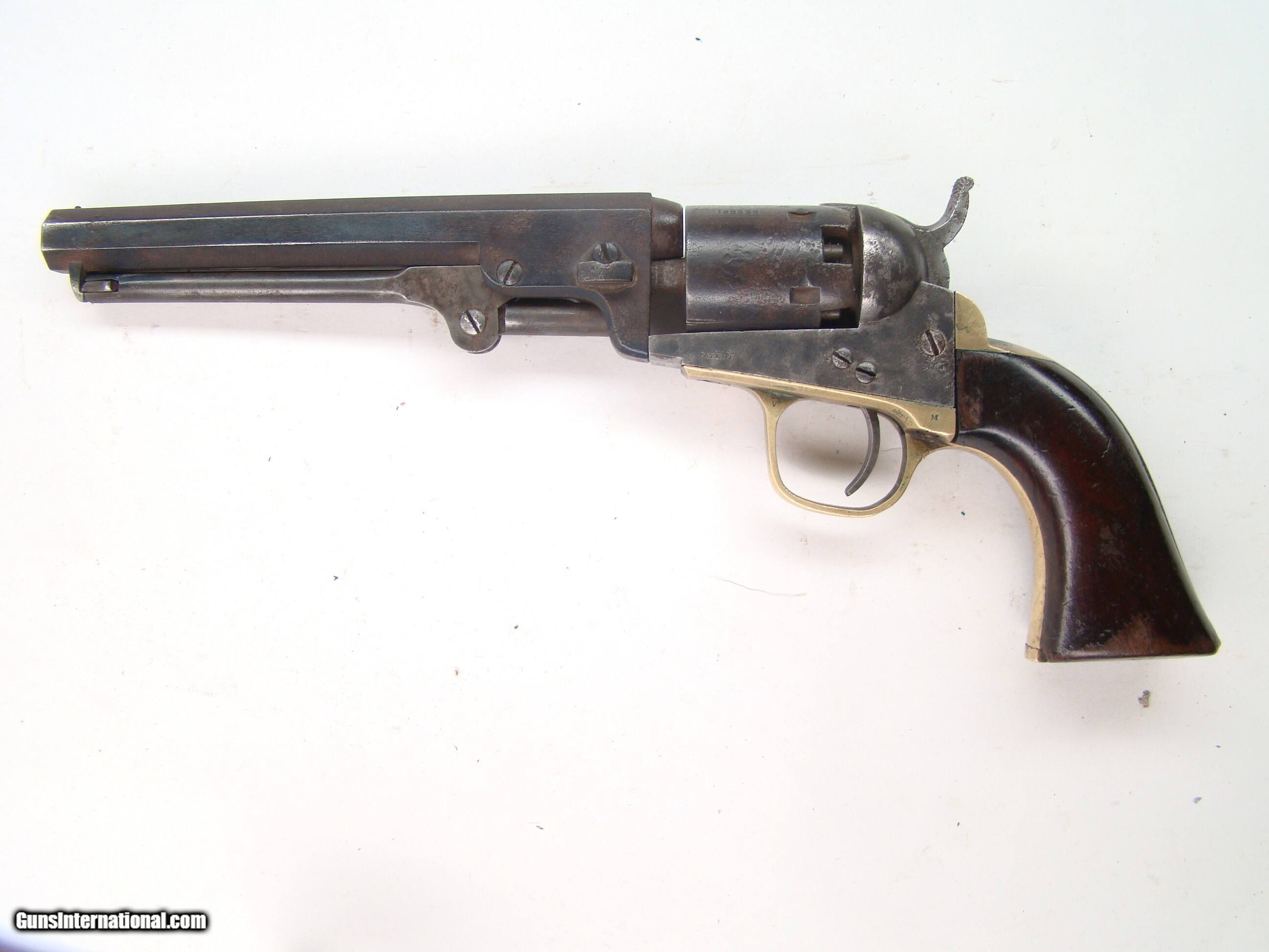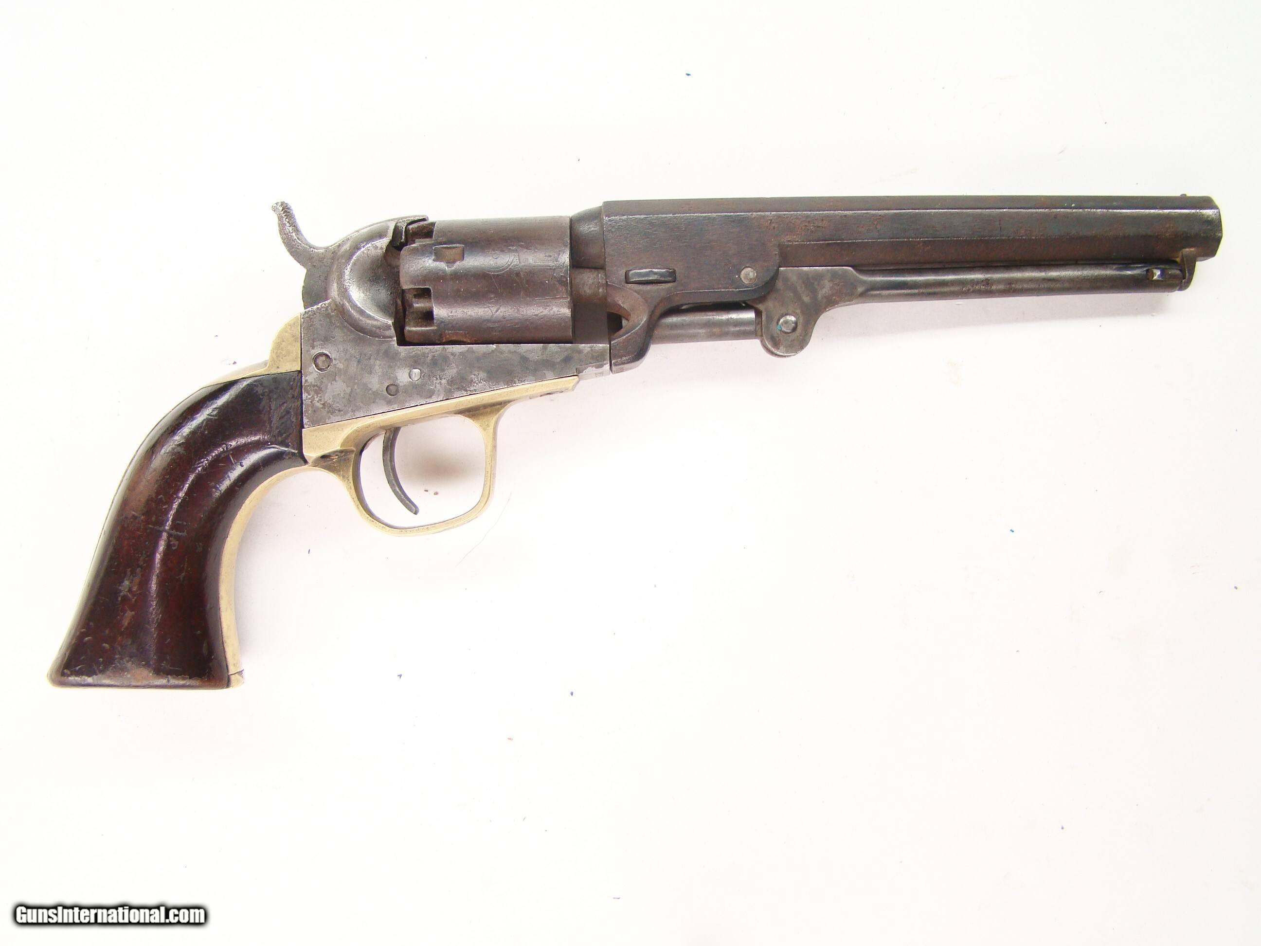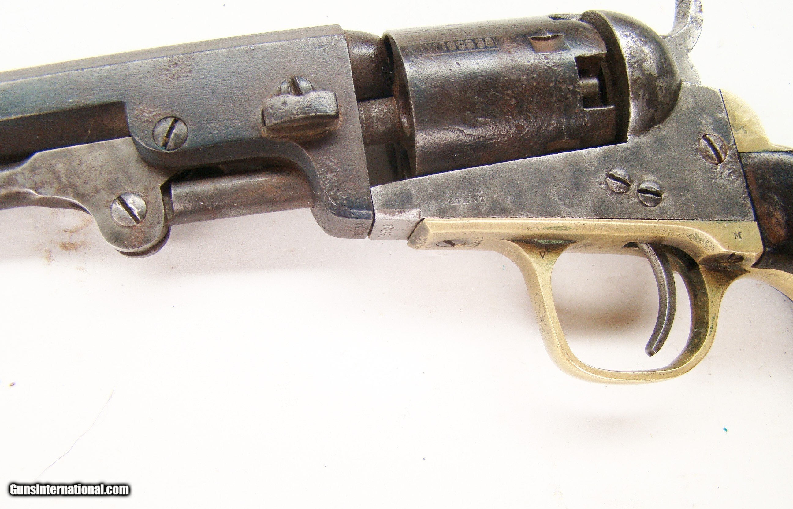 Description: Colt Model 1849 Pocket Percussion Pistol 6”bbl Mfg’d 1861 CIVIL WAR 31cal Bore VG, Mech Exc with tight lockup, Original wood grips with 75% original varnish. Has a 6” oct barrel with VG Colt address marking. The frame has the colts patent marking on the left side. The cylinder has 20% cylinder scene and matching serial#162338 Mfgd 1861. All numbers match including the wedge and ramrod. Metal overall has some fine pitting in areas ,a few dings on the cylinder showing it was used and has a dark aged patina finish.. The triggerguard has a couple inspector initials N and V on left side . Definitly Attic condition Antique: Yes Price: $995.00 Contact Seller |