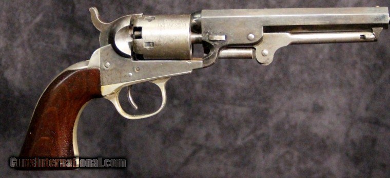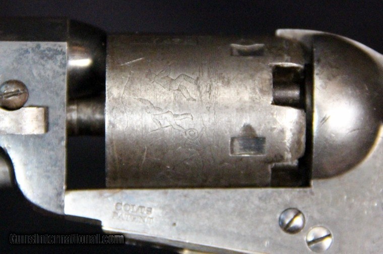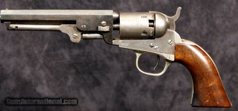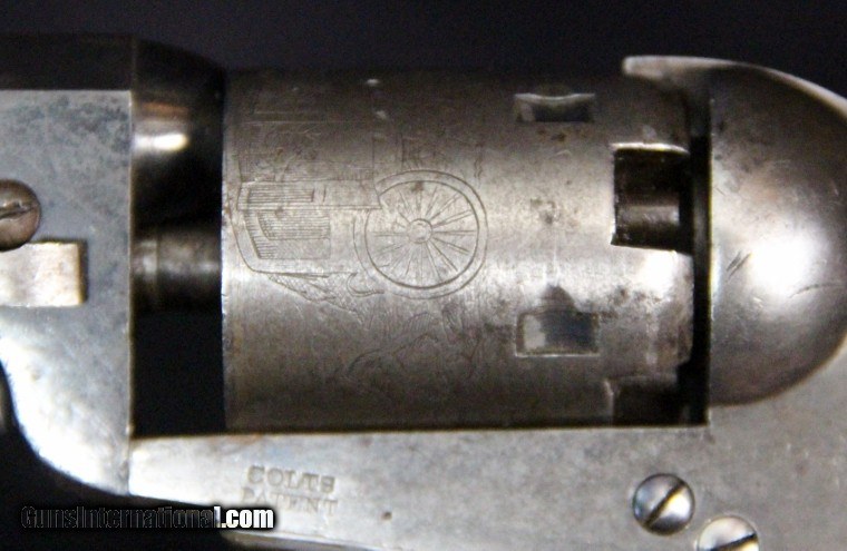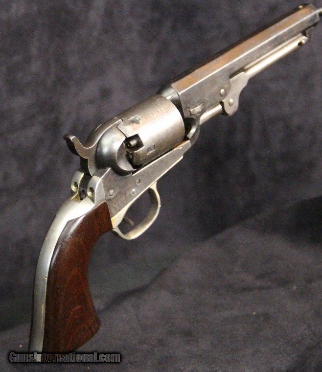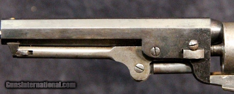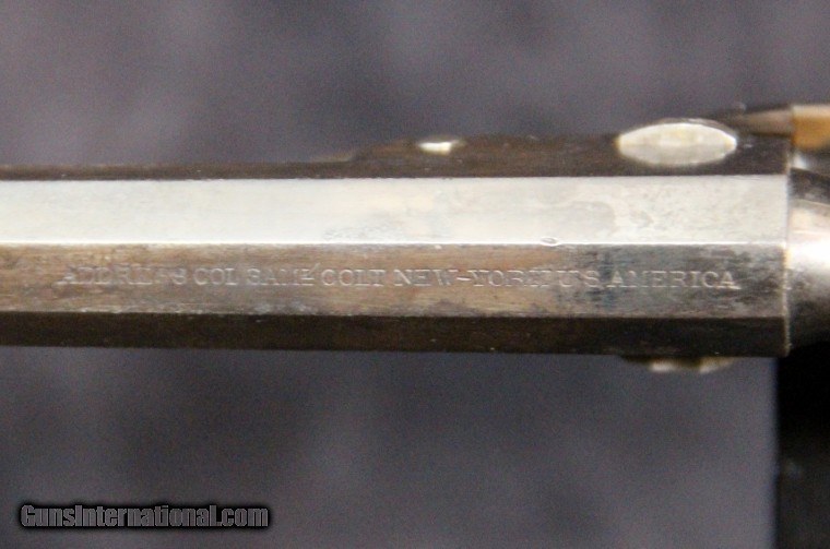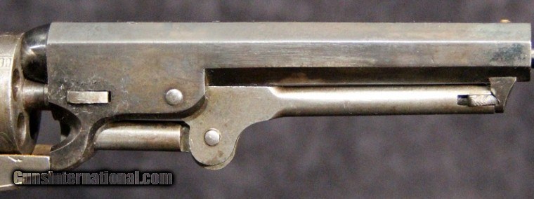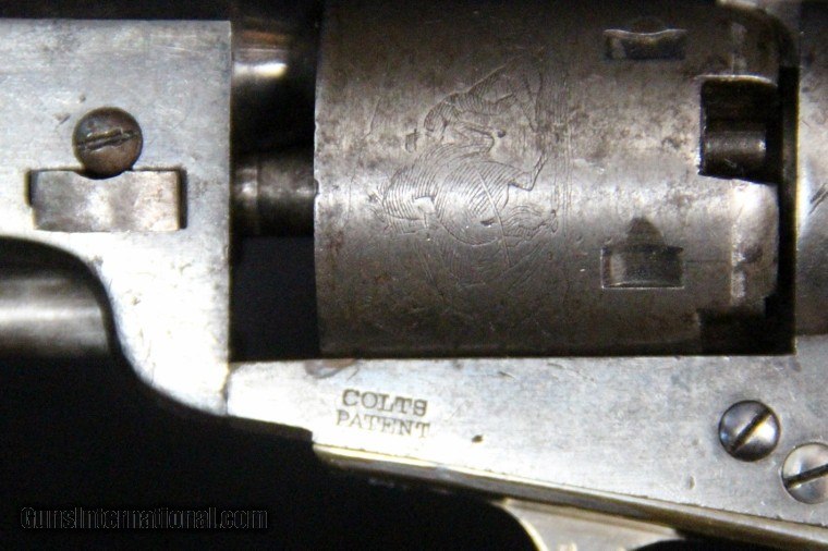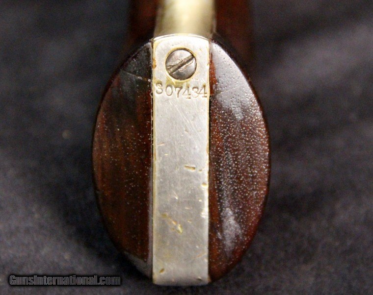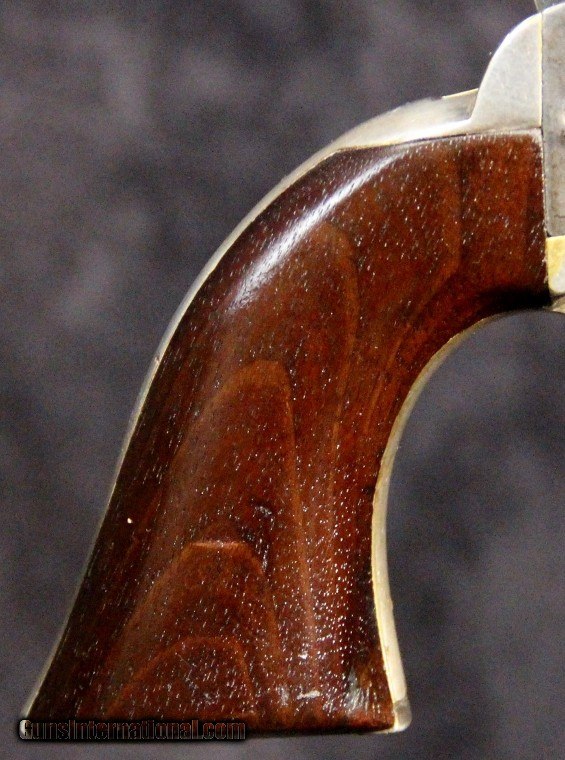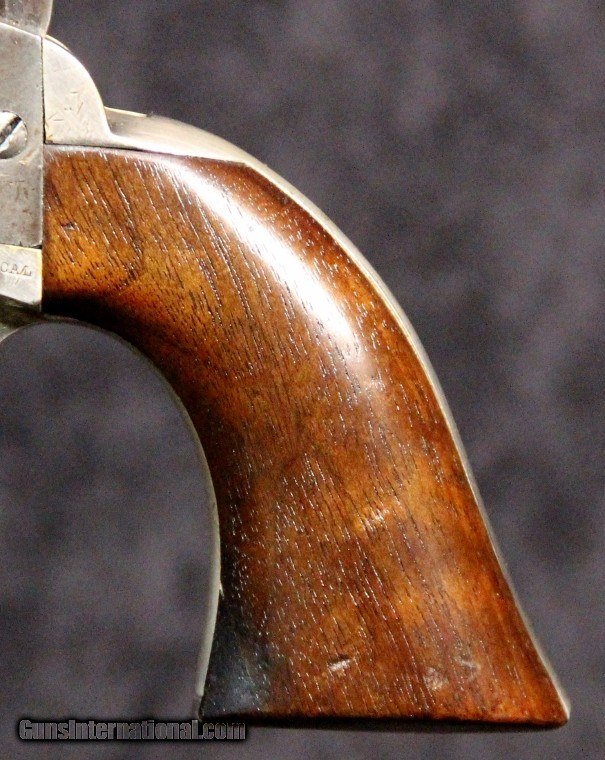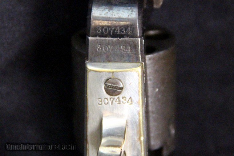 Description: .31 cal, #307434, 5 inch barrel, blue and case color finish, silver plate trigger guard and backstrap, one piece walnut grips, numbers match, 1868. Condition: excellent bright bore, 60% barrel blue, 99% cylinder scene, cylinder silver gray, touches of case colors on frame/loading lever/hammer, 95% silver plate on back strap and trigger guard, excellent grips, excellent mechanically, excellent marks. SOLD Antique: Yes |
