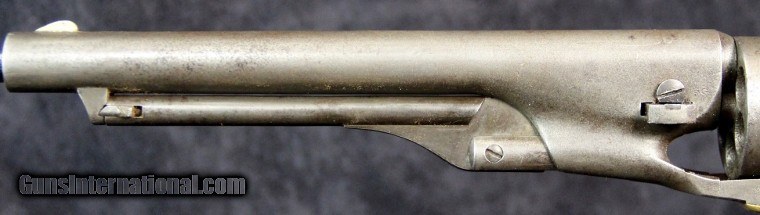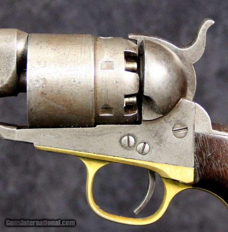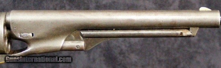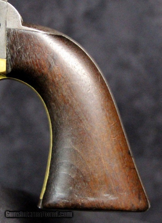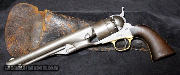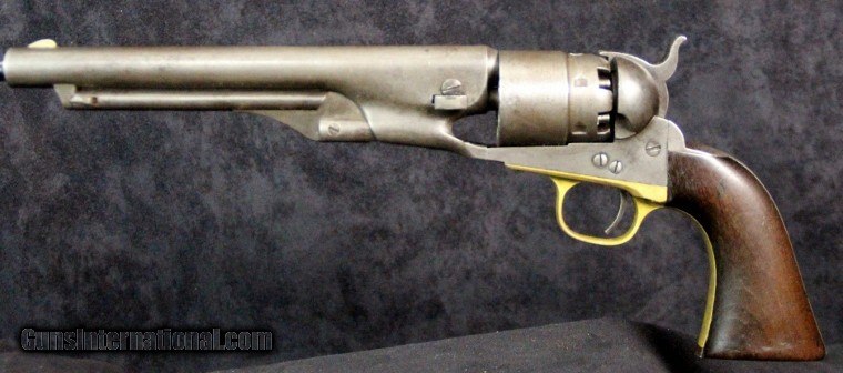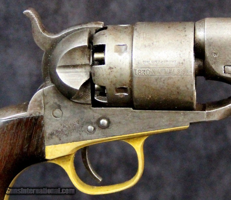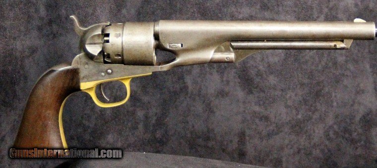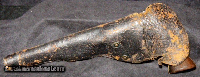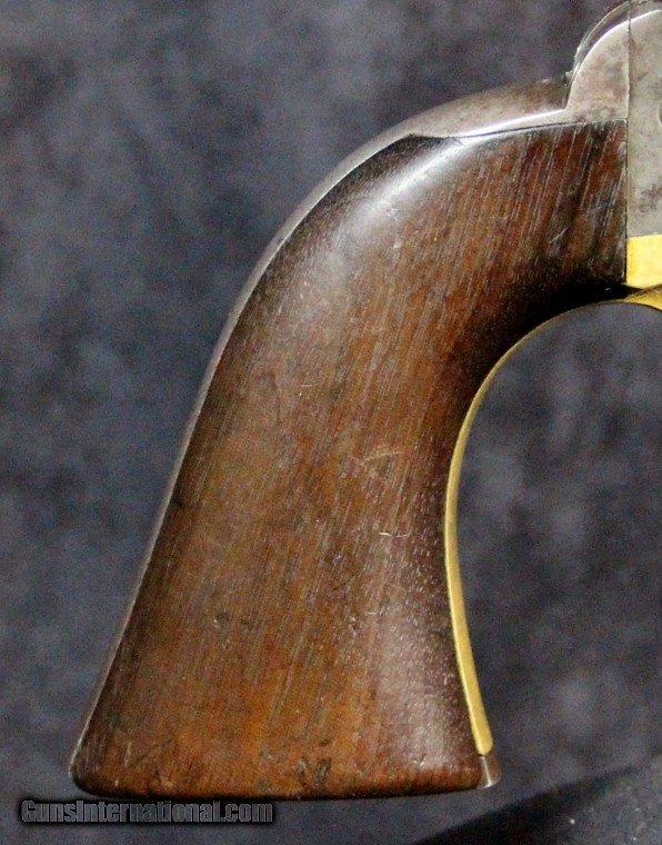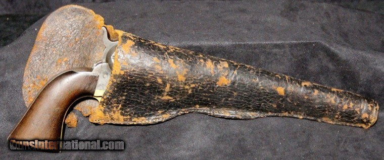 Description: .44 cal, #110281, 8 inch barrel, blue and case color finish, 1 piece walnut grips, all matching including wedge, with original holster. 1863 This is the second time I have had the pleasure of owning this revolver. It came from a small "local" museum in South Carolina. There was a tag attached that was hand labeled "PVT. John Lyon/South Carolina/2nd Cavalry Regiment/Company I/Edgefield Hussars". The tag was no longer with the revolver this time. Previous owners do not know what happened to it. I do have a copy of the tag from my records but the original seems to be lost. There is also a few pages of history on the Edgefield Hussars. Condition: strong rifling with scattered oxidation, iron is gun metal gray overall, 70% cylinder scene, trigger guard is smooth mustard color, grips are excellent with a small flat spot where the inspector's mark should be, excellent mechanically, excellent marks, holster shows its age but is still solid. SOLD Antique: Yes |