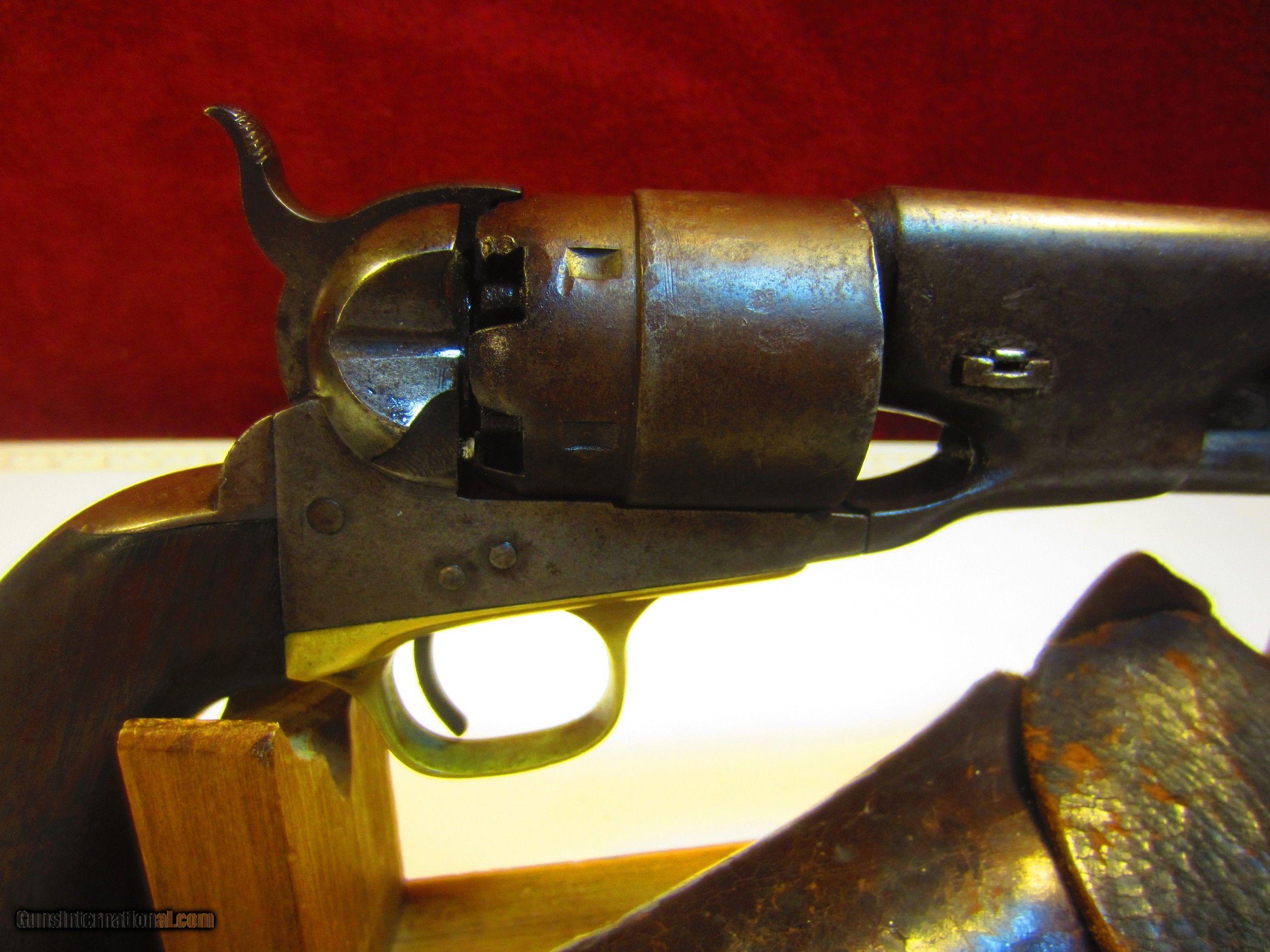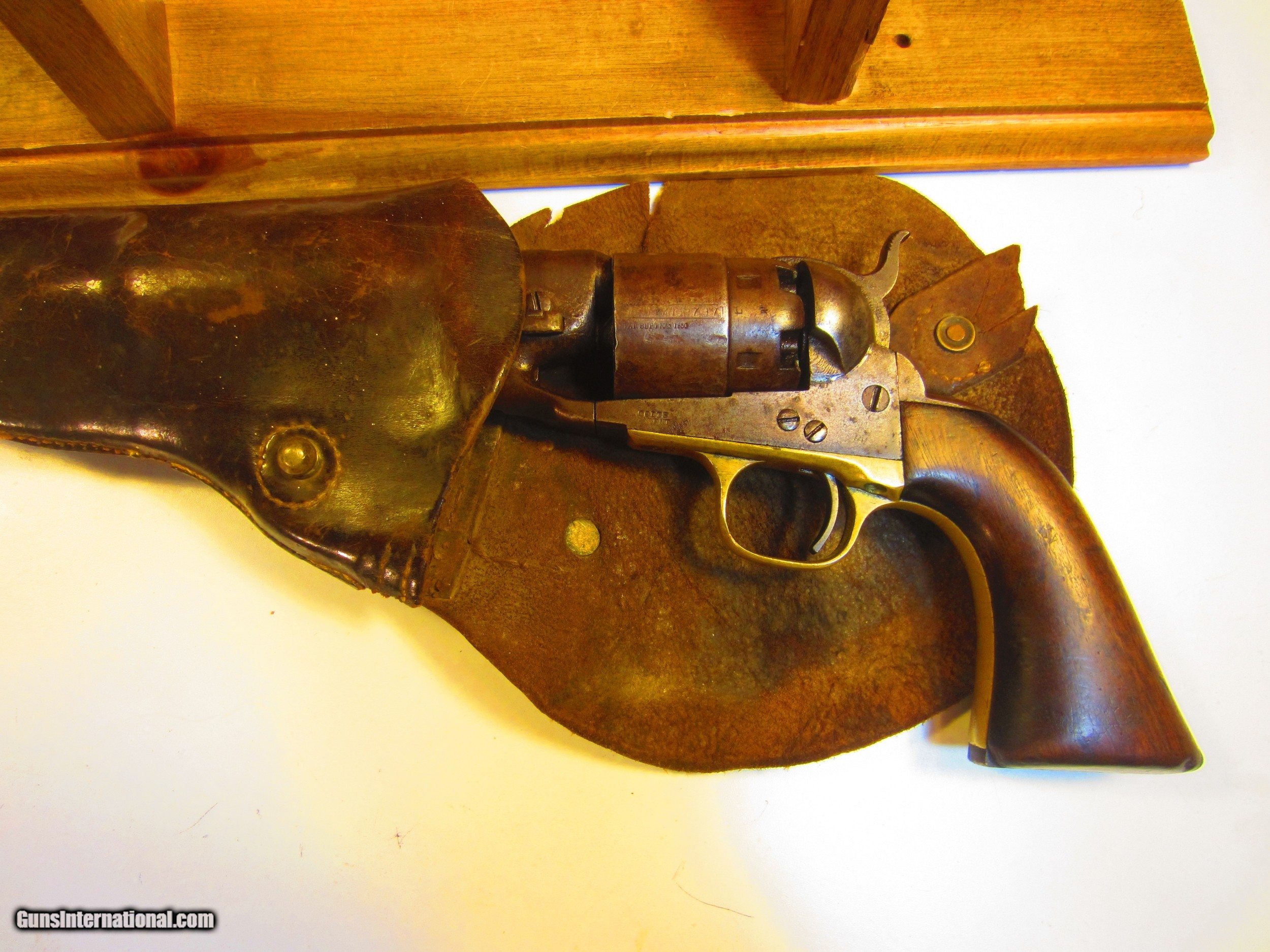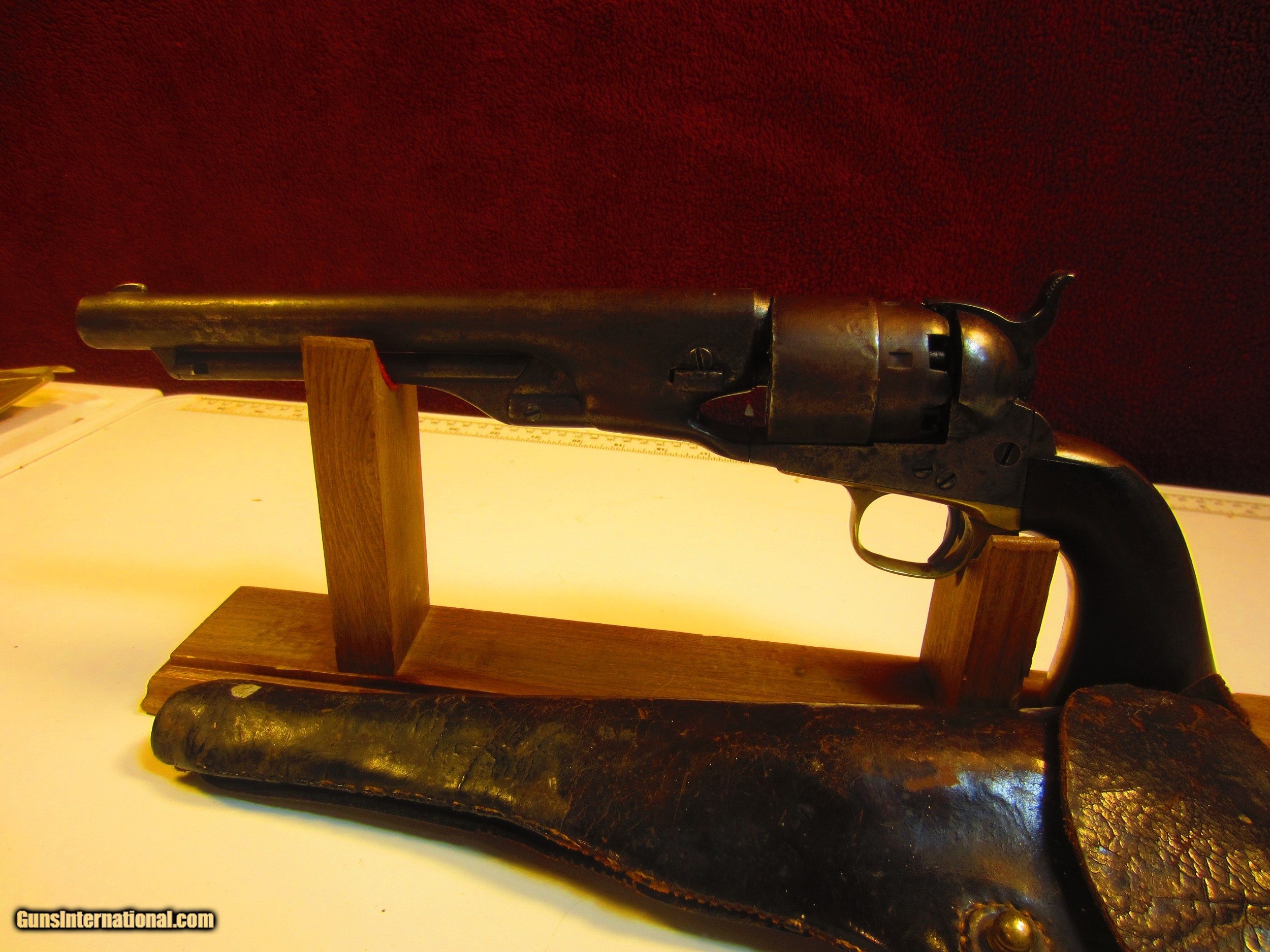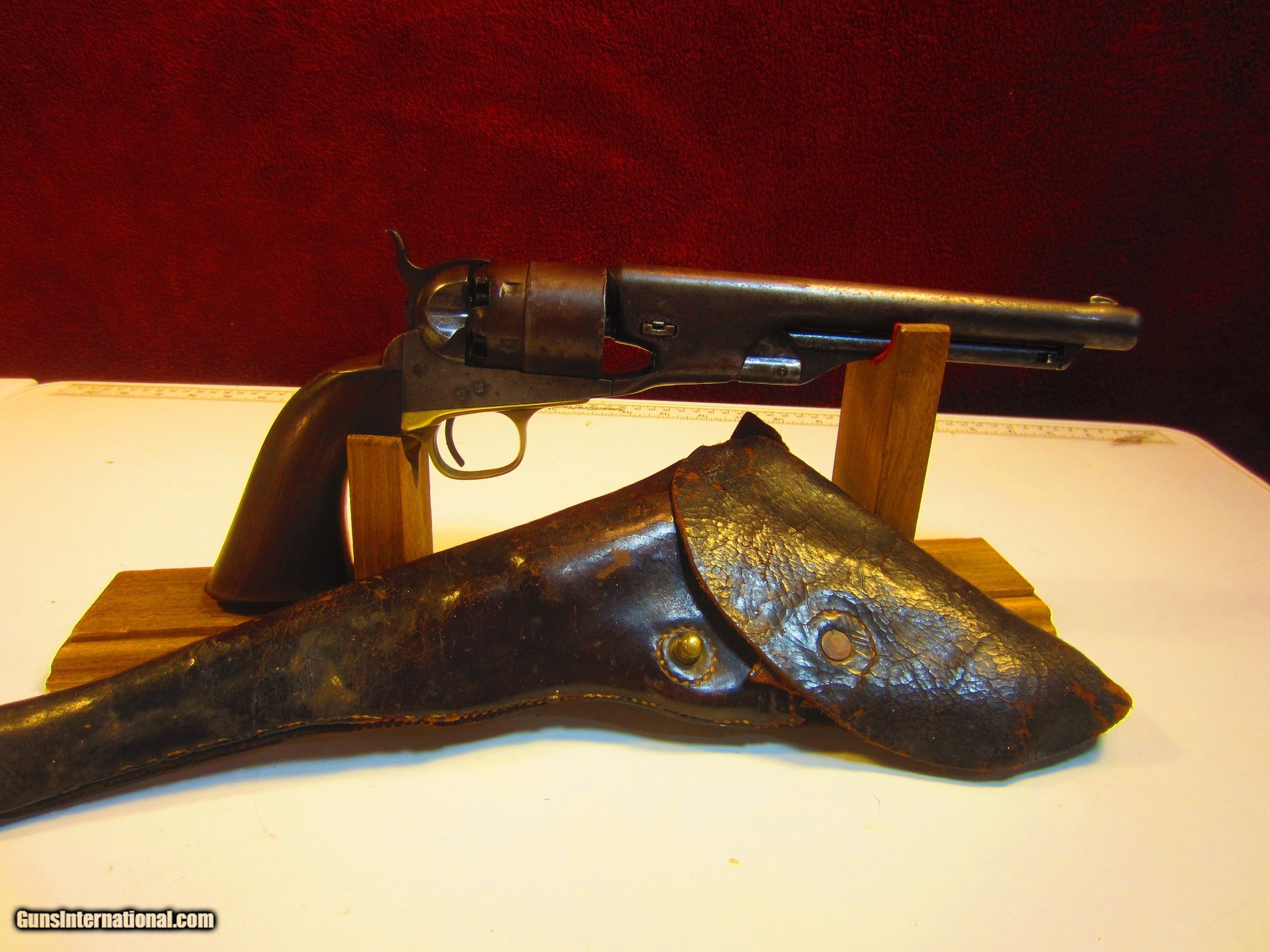 Description: COLT MODEL 1860 44 CALIBER MFG DATE 1862 ALL MATCHING SERIAL NUMBERS INCLUDING WEDGE AND CYLINDER. BORE VERY GOOD HOLSTER ORIGINAL TO REVOLVER CONDTION FAIR NEEDS STICHING AND PART OF STRAP MISSING. METAL PARTS ALL VERY GOOD CONDITION SOME VERY LIGHT PITTING. WANT TO PURCHASE CALL SHOP 716-941-3946 SOLD Antique: Yes |