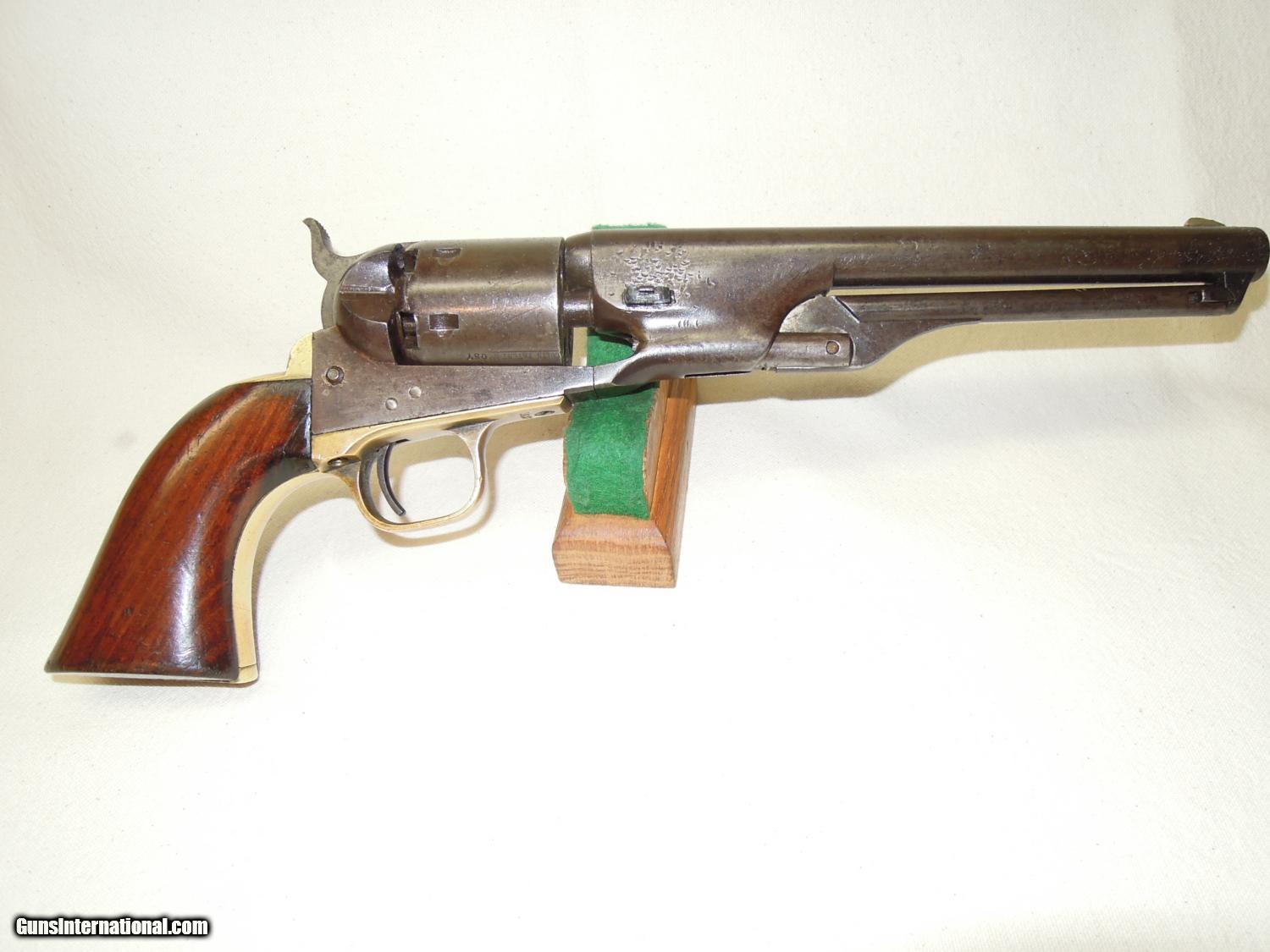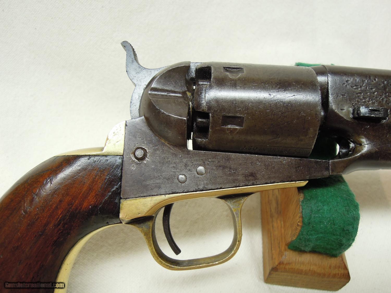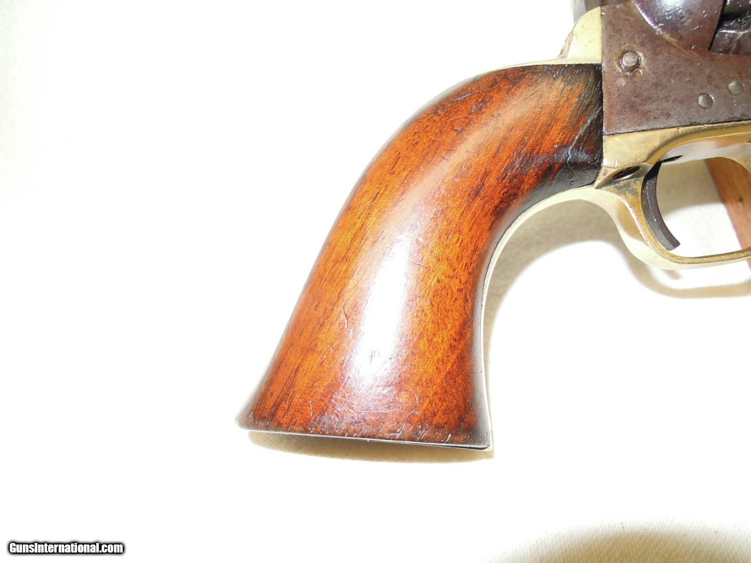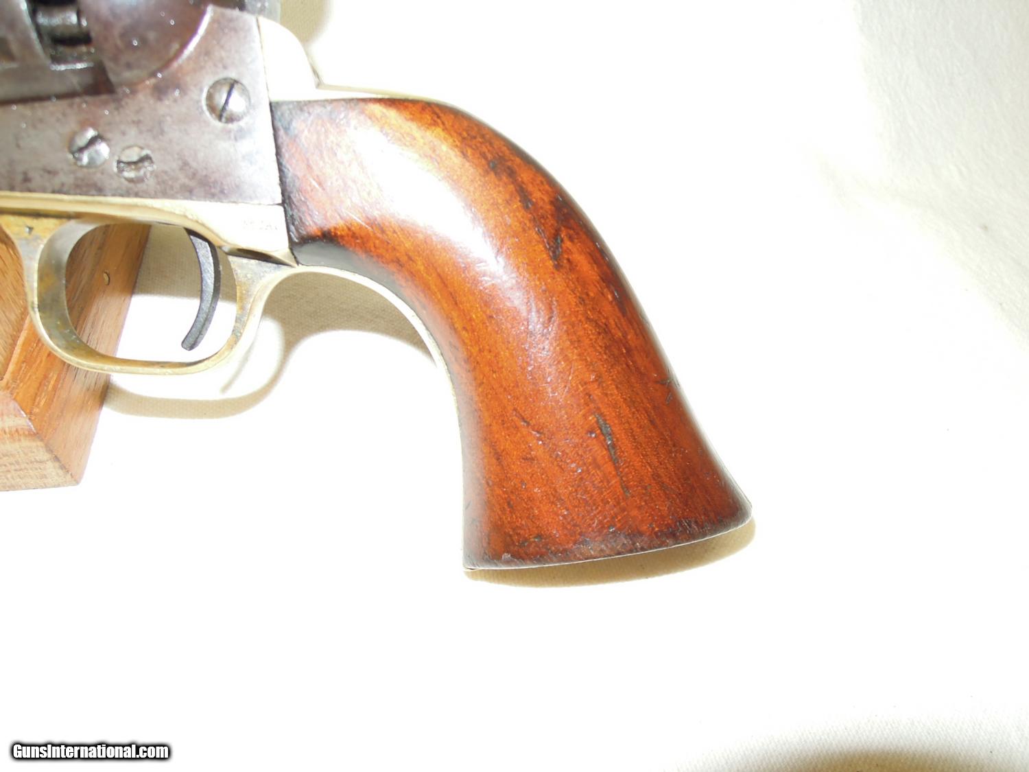 Description: SALE PENDING - Civil War Colt Model 1861 Navy Revolver - Cal. .36 - 7 1/2" Bbl. - SN 19037 (1864) - all matching, including wedge. Bore is VG+ or better and is bright with sharp rifling - shows some roughness and a few areas of moderate pitting - action is excellent with perfect timing and lock-up. Metal is excellent overall - no rust, pits, or corrosion -excellent nipples and screws. Barrel and cylinder retain about 65% to 70% thinning blue - cylinder has a light but clear and visible cylinder scene - frame shows 20% + darkening case color and the loading lever has drifted to a dark patina - the brass guard and backstrap have a nice mellow tone . Grips are excellent with good fit to frame and retain about 95% finish - the right grip shows a very nice small repair near the upper frame - shows use, but was well-maintained. A great example of a very popular and desirable Civil War revolver in perfect working order and in VG + to near Fine condition that will make a great addition to a Civil War collection - these 1861 Navy Colts are getting very hard to find in unaltered condition. SOLD Antique: Yes Manufacturer: COLT Model: 1861 NAVY Caliber Info: .36 |