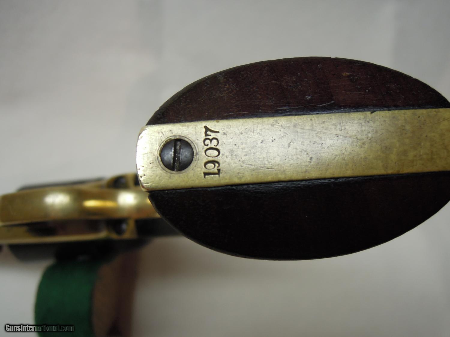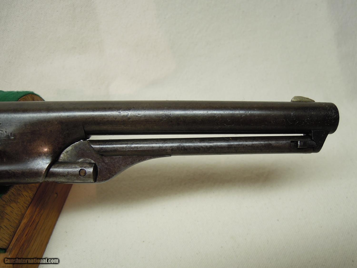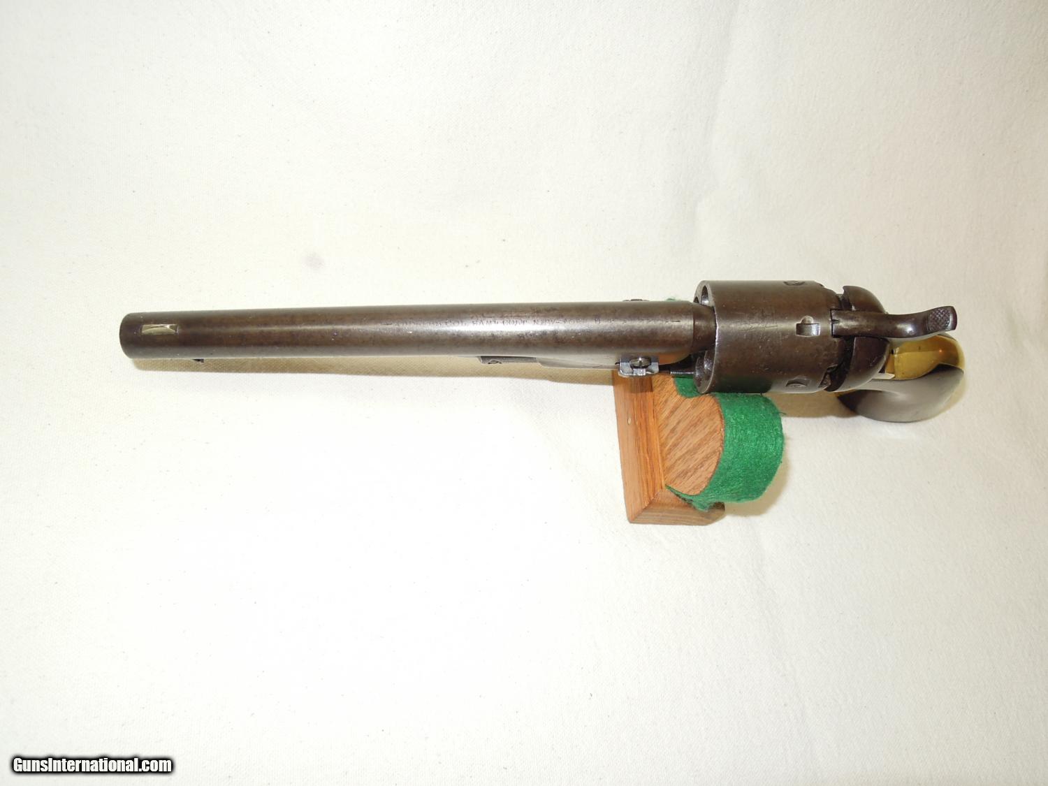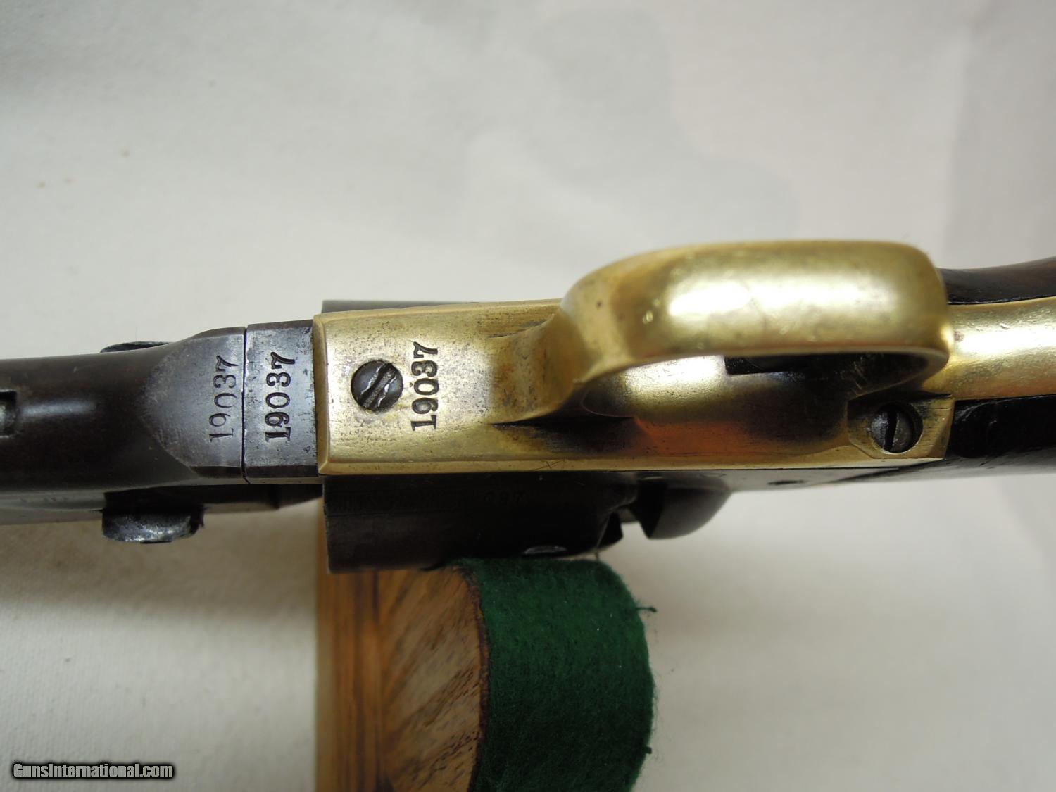 Description: SALE PENDING - Civil War Colt Model 1861 Navy Revolver - Cal. .36 - 7 1/2" Bbl. - SN 19037 (1864) - all matching, including wedge. Bore is VG+ or better and is bright with sharp rifling - shows some roughness and a few areas of moderate pitting - action is excellent with perfect timing and lock-up. Metal is excellent overall - no rust, pits, or corrosion -excellent nipples and screws. Barrel and cylinder retain about 65% to 70% thinning blue - cylinder has a light but clear and visible cylinder scene - frame shows 20% + darkening case color and the loading lever has drifted to a dark patina - the brass guard and backstrap have a nice mellow tone . Grips are excellent with good fit to frame and retain about 95% finish - the right grip shows a very nice small repair near the upper frame - shows use, but was well-maintained. A great example of a very popular and desirable Civil War revolver in perfect working order and in VG + to near Fine condition that will make a great addition to a Civil War collection - these 1861 Navy Colts are getting very hard to find in unaltered condition. SOLD Antique: Yes Manufacturer: COLT Model: 1861 NAVY Caliber Info: .36 |