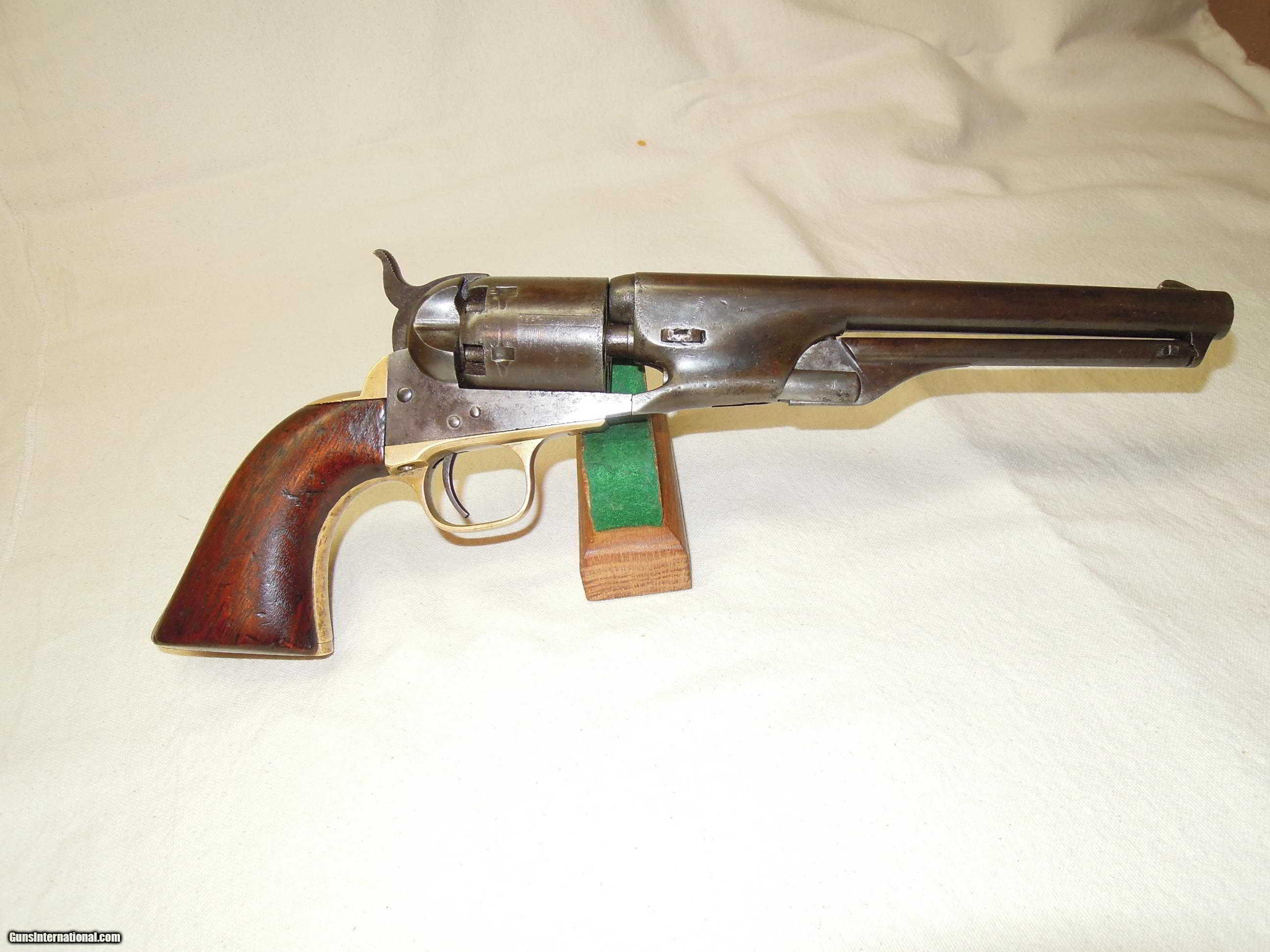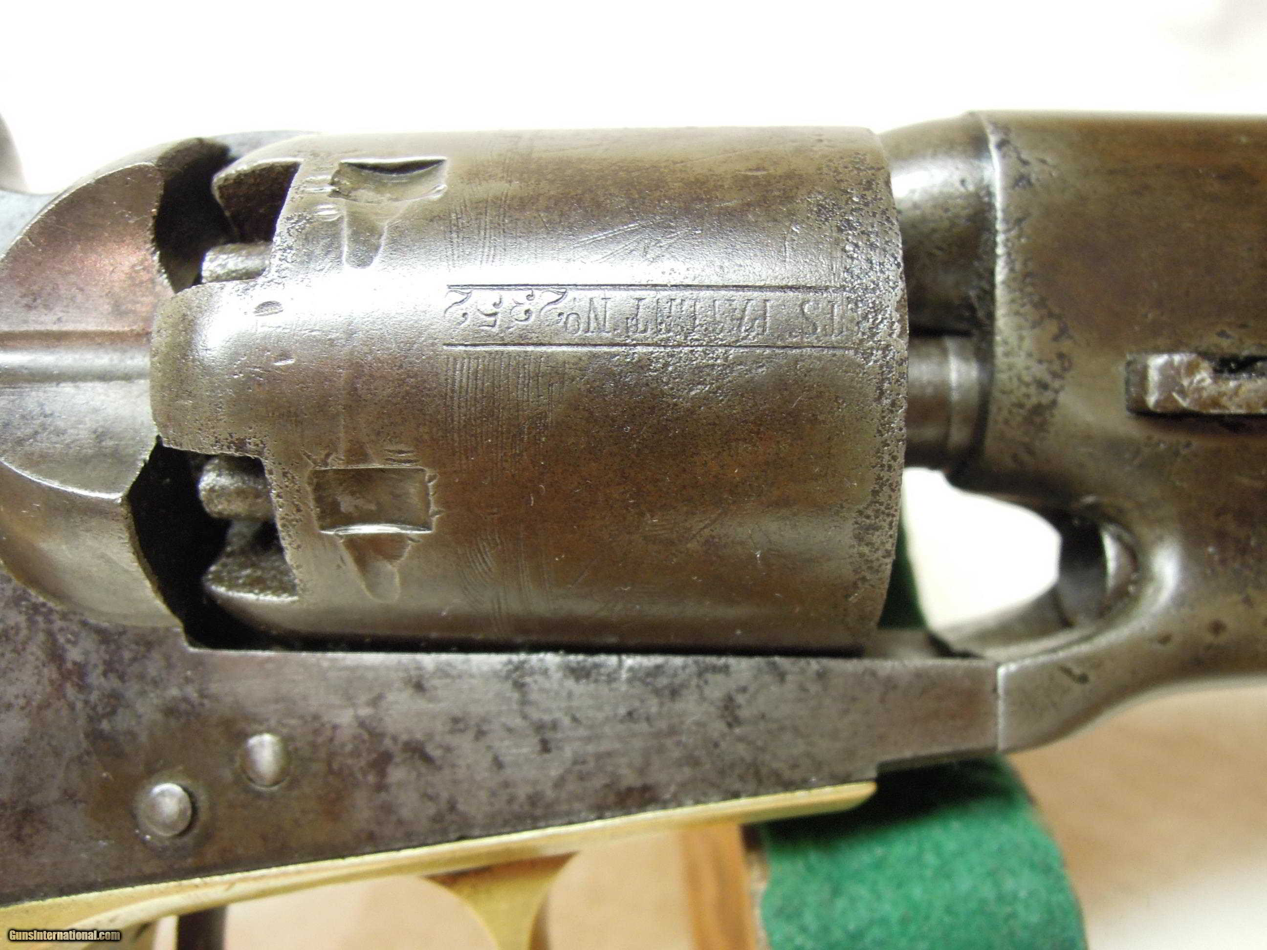 Description: Colt Model 1861 Navy Revolver - Cal. .36 - 7 1/2" Bbl. - SN 12352 (1864) - all matching incuding wedge. Excellent action with perfect timing and lock-up - bore is bright and shiny with crisp rifling but shows some light to moderate roughness. Metal is excellent overall with perfect screws and sharp markings - a few small areas of light pits on cylinder, barrel, and hammer. Barrel and lever retain about 75% -80% thinning blue with flashes of darker blue beneath - the cylinder has abou 75% thinning blue with light "browning" beneath - excellent nipples. The frame has drifted to a grayish patina and the brass guard and backstrap have a nice mellow tone. The walnut grips are VG - show some chipping on the left lower portion, evidence of a nice older chip repair on the lower right front, and a minor surface crack on the left side along with initials "C.S." stamped on butt - good fit to frame and retain about 80% finish. A nice early Civil War 1861 Navy that is unaltered in VG+ or better condition and has seen some service but has been relatively well maintained and will make a nice addition to a Civil War collection. SOLD Antique: Yes Manufacturer: COLT Model: 1861 NAVY Caliber Info: .36 |