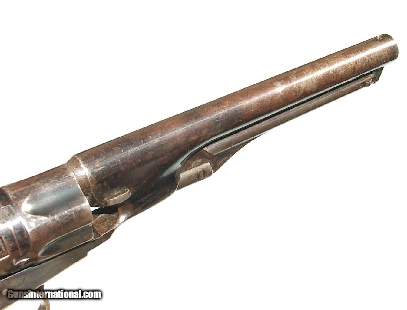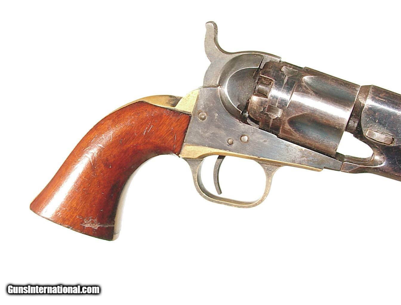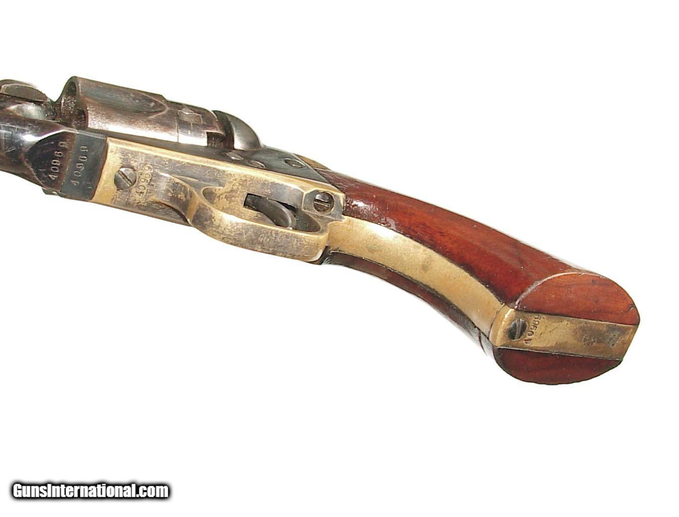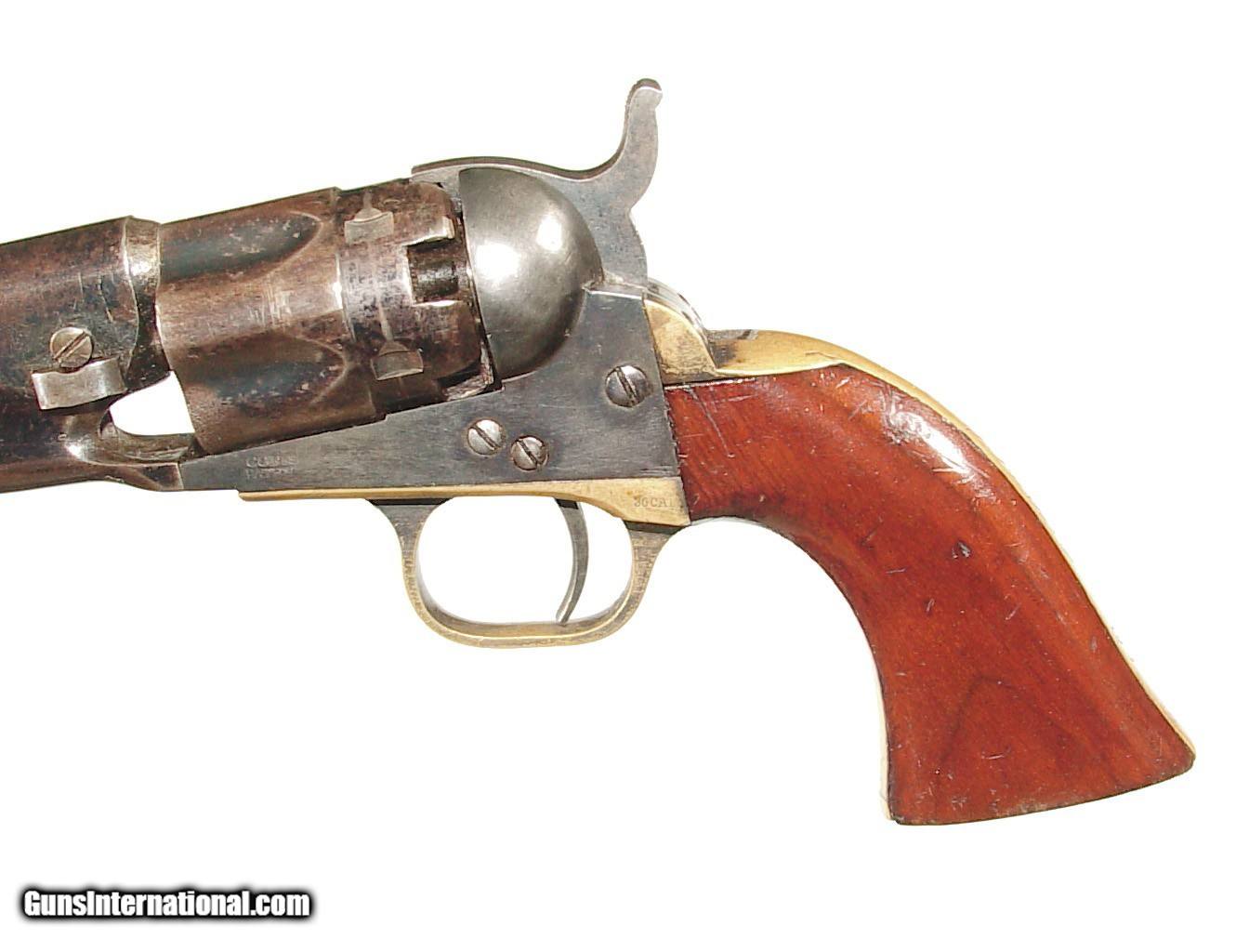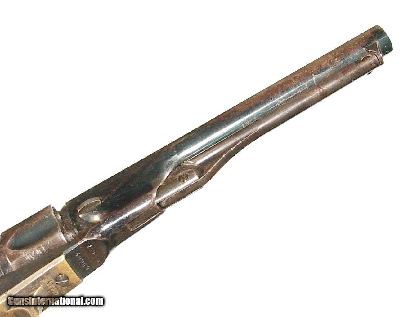 Description: .36 caliber, 6 1/2" barrel, blue and casehardened finish, fluted cylinder, and one piece varnished walnut grip. The barrel retains considerable original high polish blue with the remainder turning a smooth please gray/brown. The cylinder has generous amounts of blue with four of the six cylinder pins intact. Good strong casehardened finish remaining on the frame, hammer, and loading lever. The grips have good varnish with some handling marks and dings. The backstrap is inscribed "SGT. F.H. WILSON" I have not been able to find any information regarding him but further research may reveal some information. SOLD Antique: Yes |