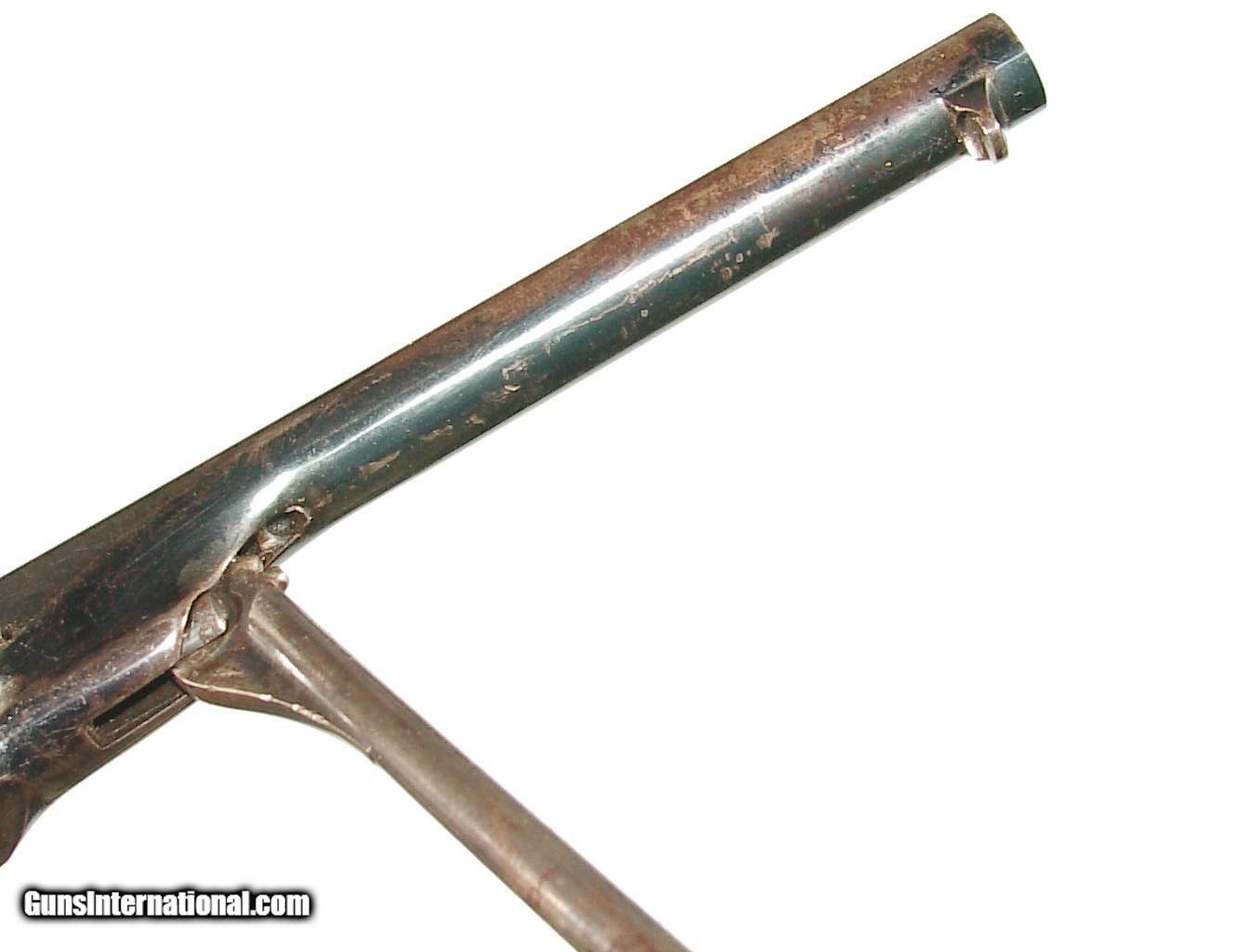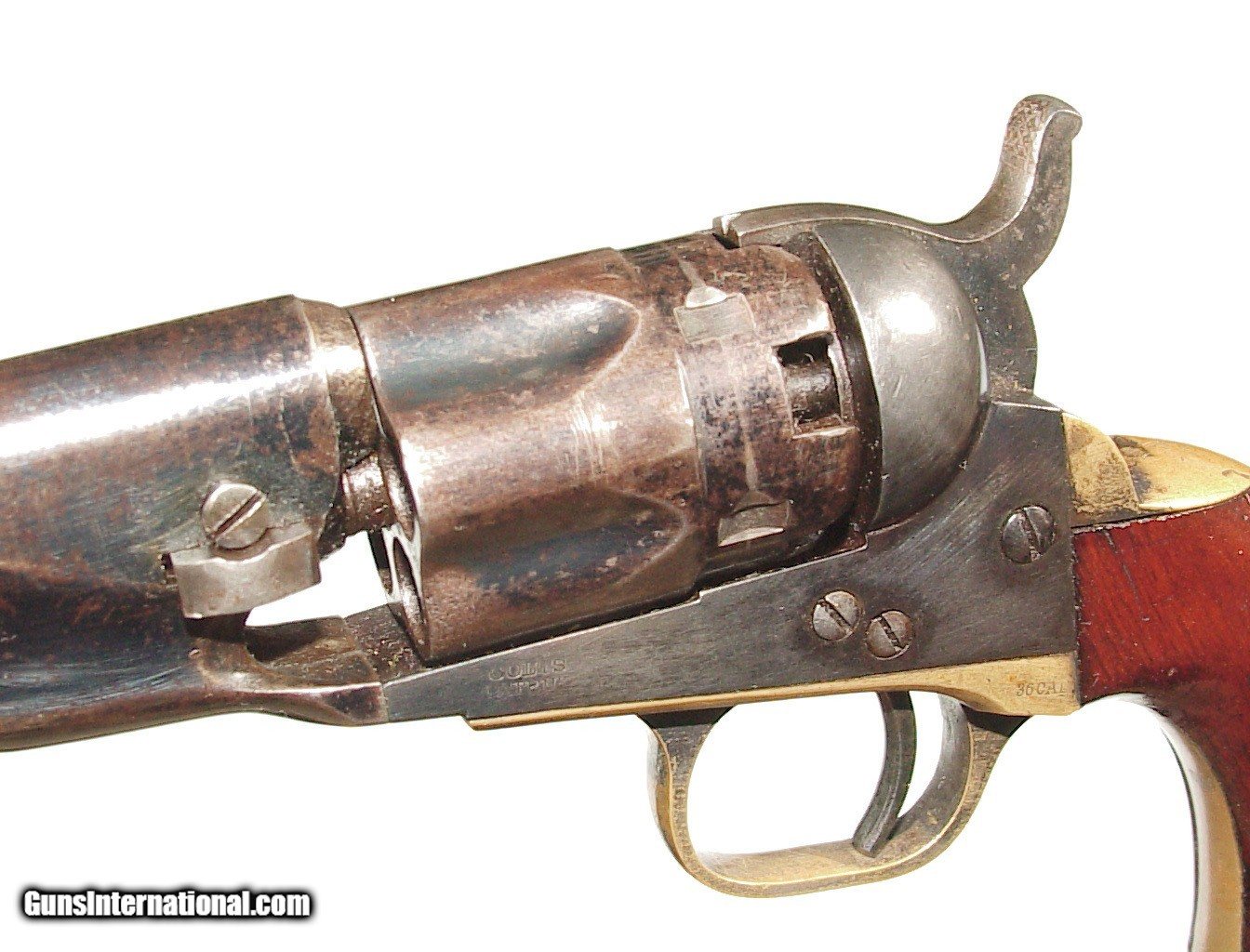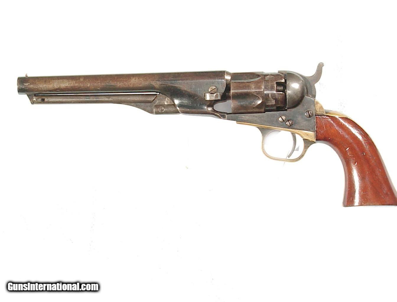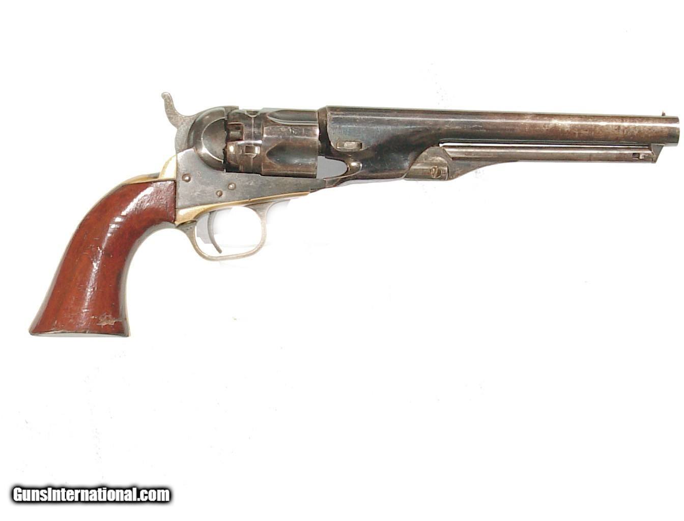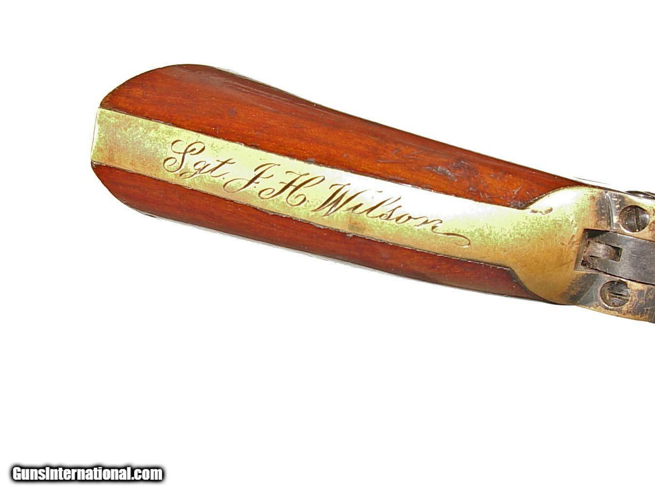 Description: .36 caliber, 6 1/2" barrel, blue and casehardened finish, fluted cylinder, and one piece varnished walnut grip. The barrel retains considerable original high polish blue with the remainder turning a smooth please gray/brown. The cylinder has generous amounts of blue with four of the six cylinder pins intact. Good strong casehardened finish remaining on the frame, hammer, and loading lever. The grips have good varnish with some handling marks and dings. The backstrap is inscribed "SGT. F.H. WILSON" I have not been able to find any information regarding him but further research may reveal some information. SOLD Antique: Yes |