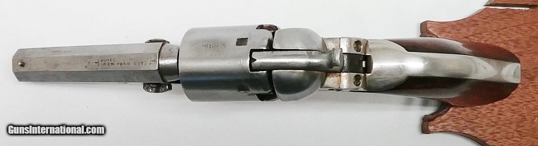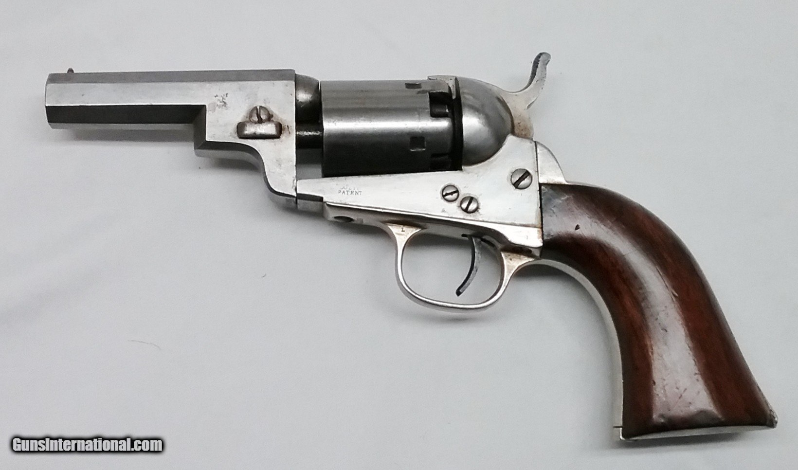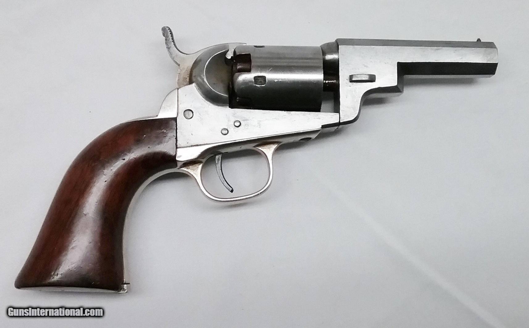 Description: P-36-18 Colt – Original 1849 – Wells Fargo - 36 Cal - Stk# P-36-18 This, original, numbers matching, Colt 1851 36 cal manufactured in 1849 has a 3” octagon barrel mounted with a brass pin front sight along with a notch in the hammer for the rear sight. Stamped in the top flat of the barrel is; -ADDRESS COL COLT NEW-YORK CITY-. The bore and cylinder are in good condition with the exception of minor pitting throughout. The cylinder pin is loose and the cylinder stop and hand are not in time. The Walnut grips mounted to the frame by a steel trigger guard and back strap are in good to very good condition. This revolver is in fair condition. The length is 8”, the weight is 1.4lbs. Our stock number is P-36-18. Please note: All numbers are matching. We will ship to anywhere in the United States. Buyer pays freight and insurance. SOLD Handgun Caliber: .31 Manufacturer: Colt Model: 1849 Wells Fargo Bore: Rifled Chambers: 6 Condition: Fair Metal Condition: Good Bore Condition: Good Barrels: One Barrel Type: Octagon Action: Percussion Triggers: 1 Weight: 1.4 lbs Sights: Fixed Item Location: OR - Oregon |