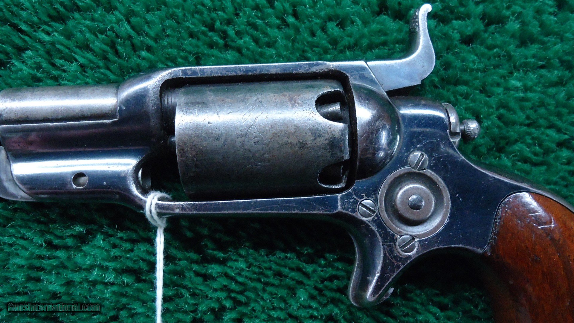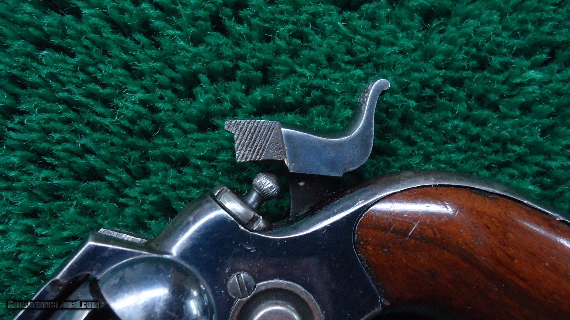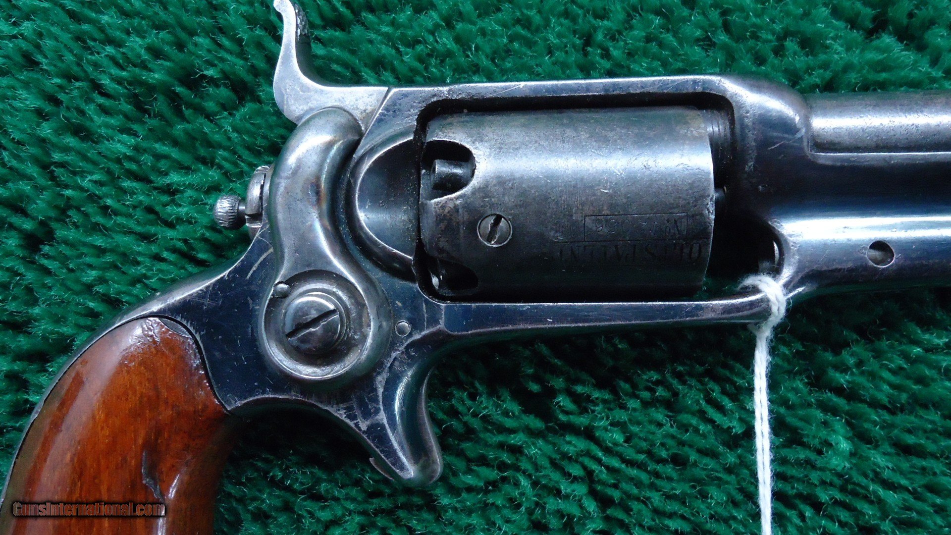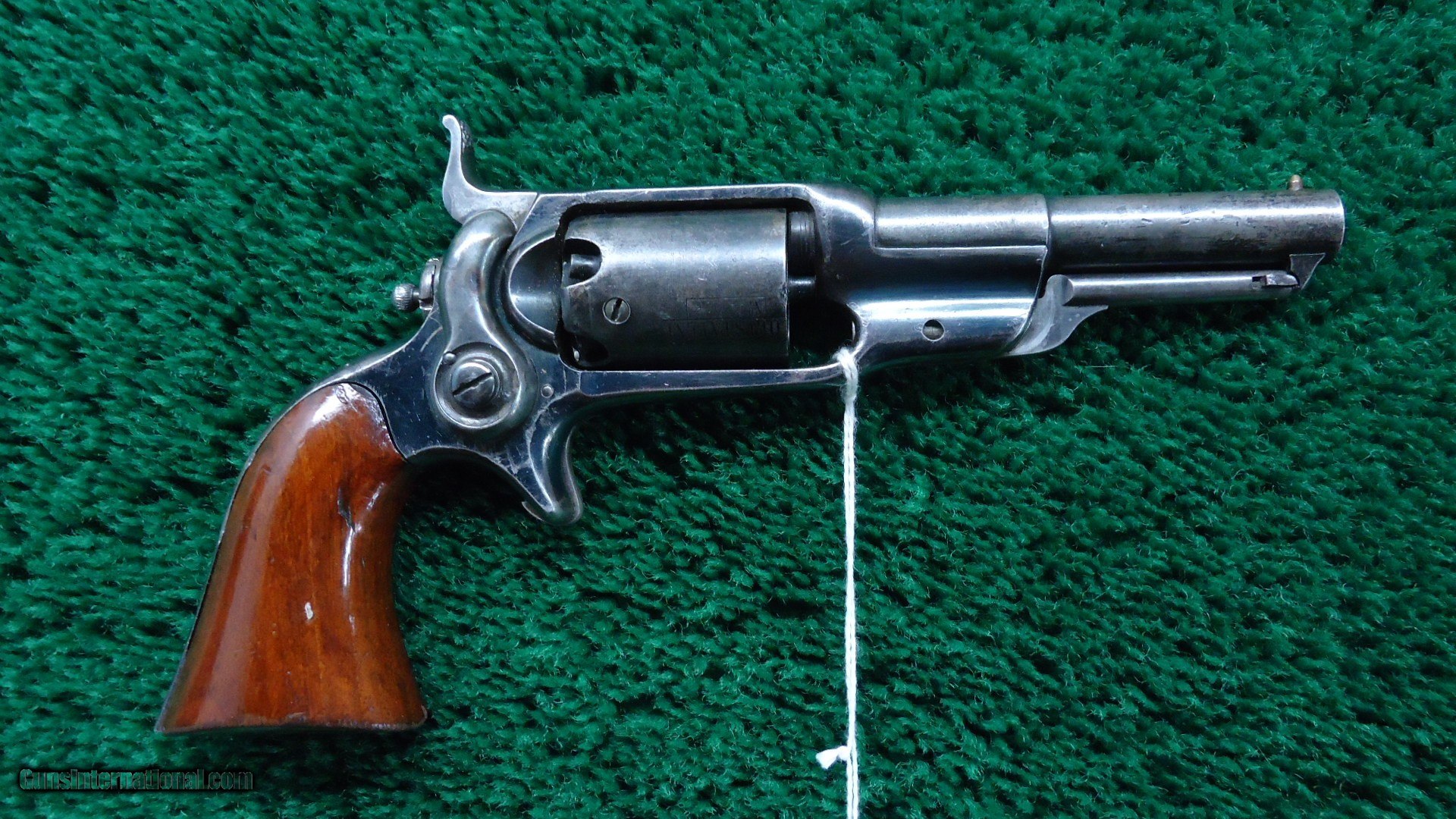 Description: Colt 1855 Sidehammer Pocket Model 7 features a 3-1/2 inch round barrel chambered in 31 caliber with a good bore. 5 shot revolver that is mechanically excellent. Cylinder pin is retained by a screw-in cylinder. 80%+ of the Stage Coach Hold-up cylinder scene is visible. 10-15% barrel and cylinder blue. 80% shiny frame blue. Good traces of case colors remain on hammer and trigger. Fine walnut grips with most all original varnish intact. A fine example. Leroy Merz Antique Firearms specializes in antique and vintage Winchesters and other fine American firearms. Since 1965 Mr. Merz has taken part in the world of firearms and has been a contributor to many well known reference books. We have hundreds of additional guns in every price range at our home online. Search for Merz Antiques in google. SOLD Antique: Yes Handgun Caliber: .31 |