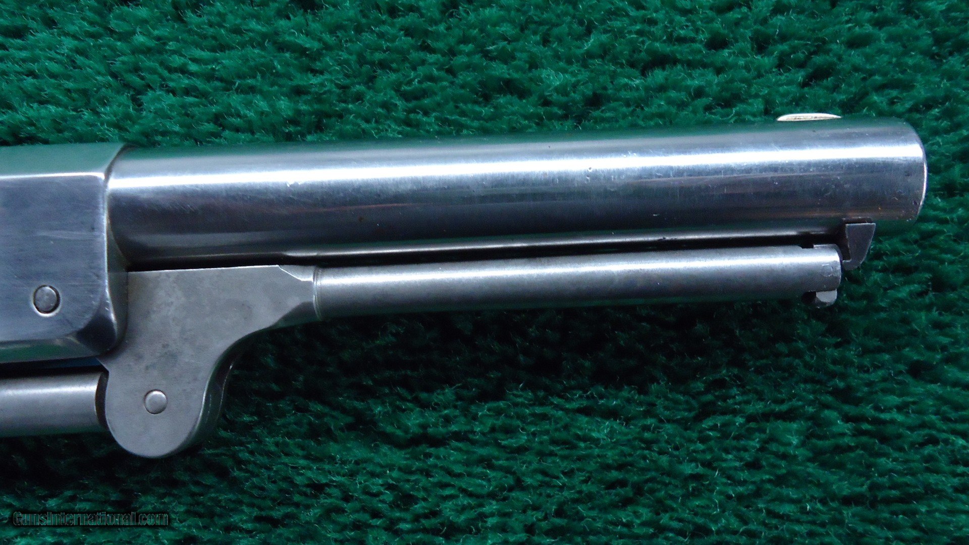 Description: Gun appears to have been prepared for a re-finish. It has been polished bright on the cylinder and the barrel. Sharp corners and excellent markings. Cylinder retains about 90% of the scene. All matching numbers except for the wedge. The square back trigger guard has about 50% of a black tarnished silver. The balance is a dull brass color. The frame has a trace of case colors showing. This is believed to be a civilian model. A good looking gun. Grips have a small chip out of the toe but are sound and solid. Not a bad looking Colt Dragoon. Leroy Merz Antique Firearms specializes in antique and vintage Winchesters and other fine American firearms. Since 1965 Mr. Merz has taken part in the world of firearms and has been a contributor to many well known reference books. We have hundreds of additional guns in every price range at our home online. Search for Merz Antiques in google. SOLD Antique: Yes |