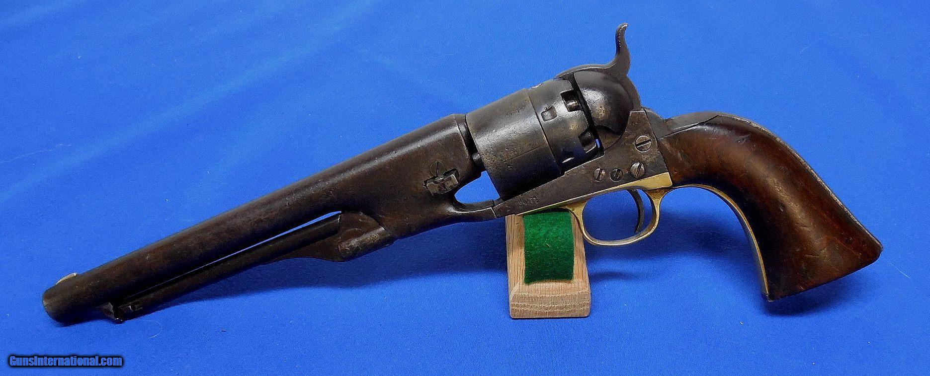 Description: Sold pending Funds / Colt U.S. Model 1860 Army Percussion Revolver, serial # 28918, cal. 44 cal, 7 3/4" barrel with a fair-poor bore. The metal surfaces are dark gray mixed with plum brown patina and overall light pinprick pitting, the barrel with some minor impact marks here and there but nothing alarming. The New York address is still visible and the right side of the muzzle shows holster wear. The cylinder scene is no longer visible and there are some areas of moderate pitting on the cylinder. The trigger guard has toned to a goldenrod patina and shows minor dings and handling marks with a few tool marks. The smooth walnut grip rates very good with minor dings and handling marks, most prominent on the butt, showing light but evident left and right side cartouches. The grip is from a different revolver but the frame, trigger guard and back strap are numbered alike, barrel lug is numbered "28954" the cylinder number can no longer be discerned. The arbor shows a period repair and the un-numbered wedge shows numerous impact and peening marks in an attempt no doubt to tighten its fit. This example is a four-screw frame with the back strap cut for shoulder stock, the lugs being slightly peened. The revolver functions mechanically and has a very "been there done that" look and clearly saw Civil War use. Its overall condition is good as described and photographed. Inv.: # 12-146 SOLD Antique: Yes |