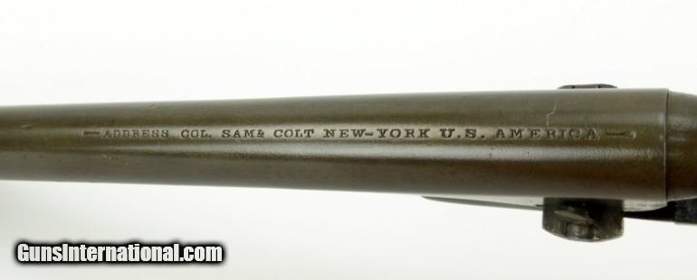 Description: Colt US Martial 1861 Navy revolver. Made in 1862. Sharp gun with a dark gray patina on the metal. Some of the cylinder scene is still present. Cartouches are still visible on the left hand side of the grips. Gun works perfectly and the gun is all matching. Very good example of the Martial Colt 1861 Navy which are scarce guns to start with! SOLD Antique: Yes |