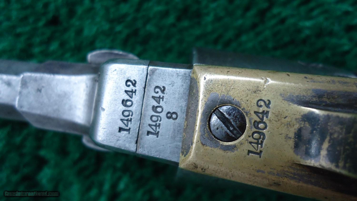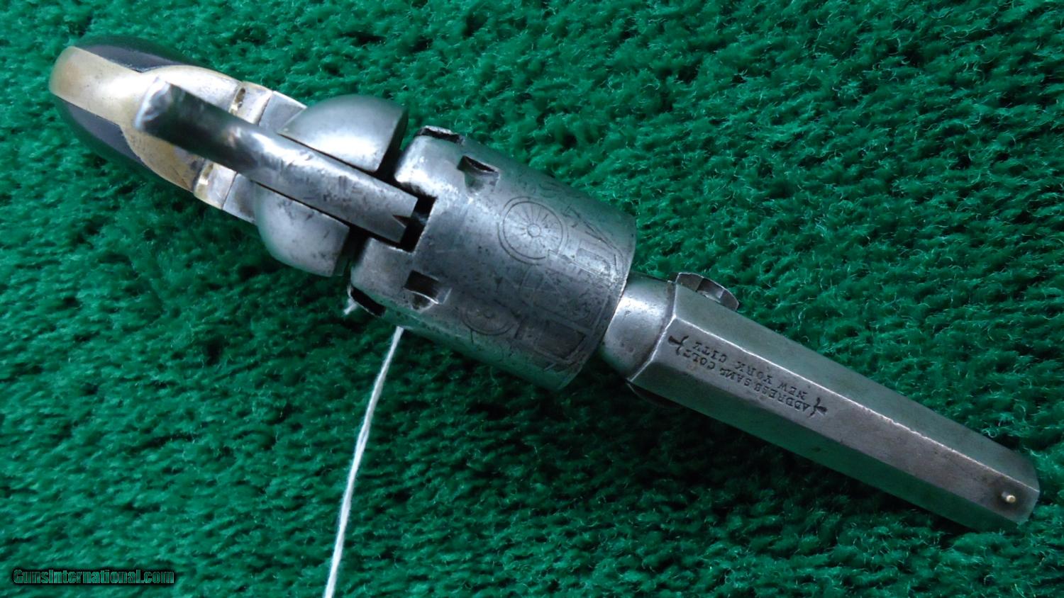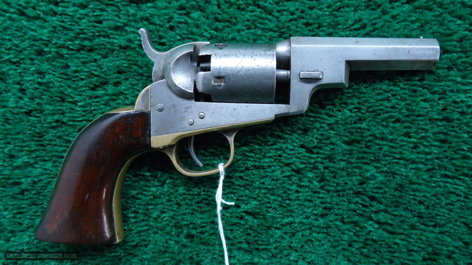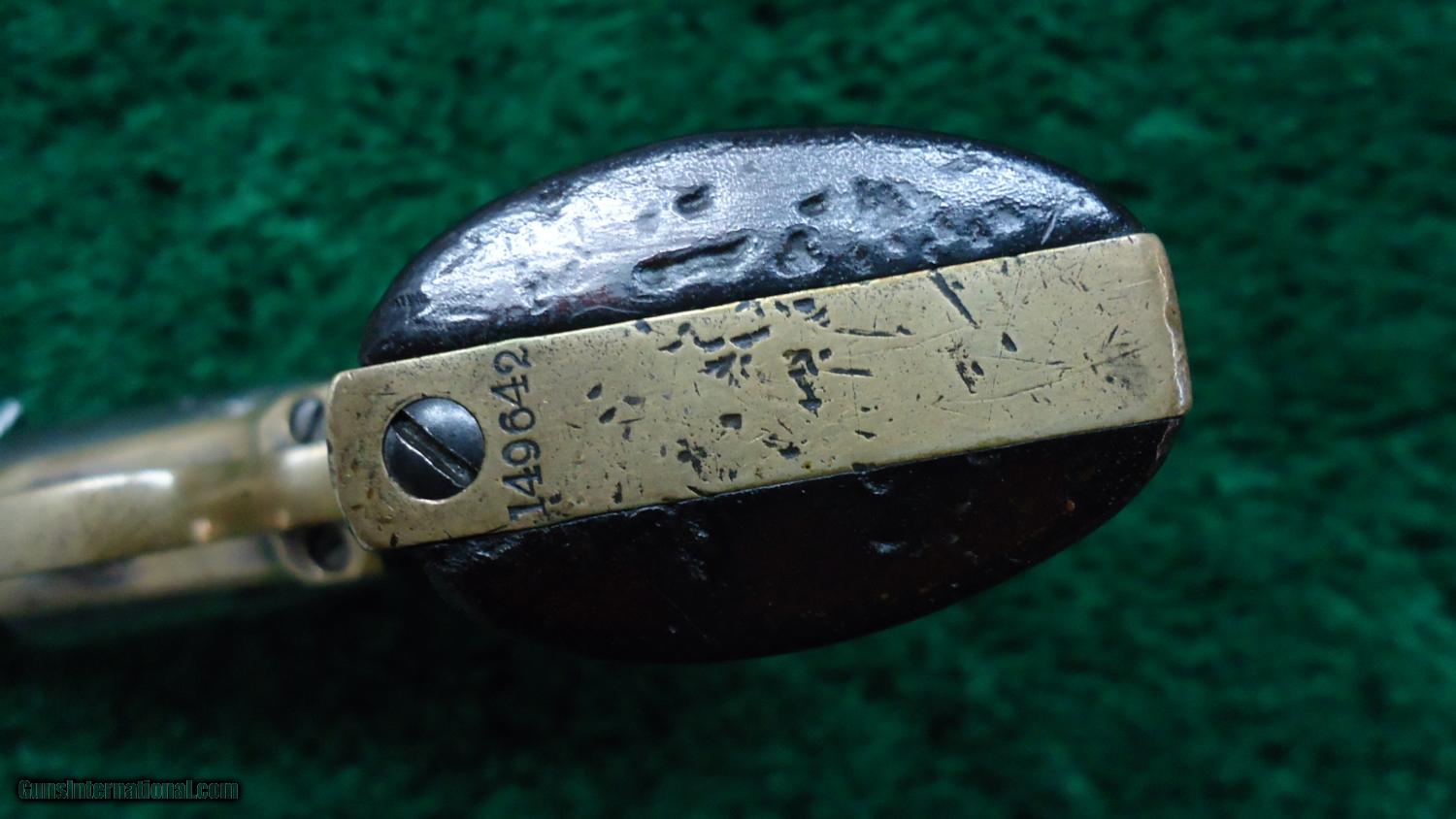 Description: The Wells Fargo was a variation of the 1849 pocket percussion revolver. 5-shot 31 cal. The oddity of the Wells Fargo model was that they were expressly built without a loading lever. Metal is grey and no doubt has been cleaned years ago. Luckily it was not over cleaned as the markings are very good. The cylinder scene is quite visible. Brass on the gun looks VG and has an aged patina. 150k serial range with all numbers matching. Action works good as are the trigger and hammer springs. Other than a couple of dings on the bottom the grips are nice. Leroy Merz Antique Firearms specializes in antique and vintage Winchesters and other fine American firearms. Since 1965 Mr. Merz has taken part in the world of firearms and has been a contributor to many well known reference books. Just recently we mailed the 126th edition of our privately-published catalog. We have hundreds of additional guns in every price range at our home online. Search for Merz Antiques in google. SOLD Antique: Yes |