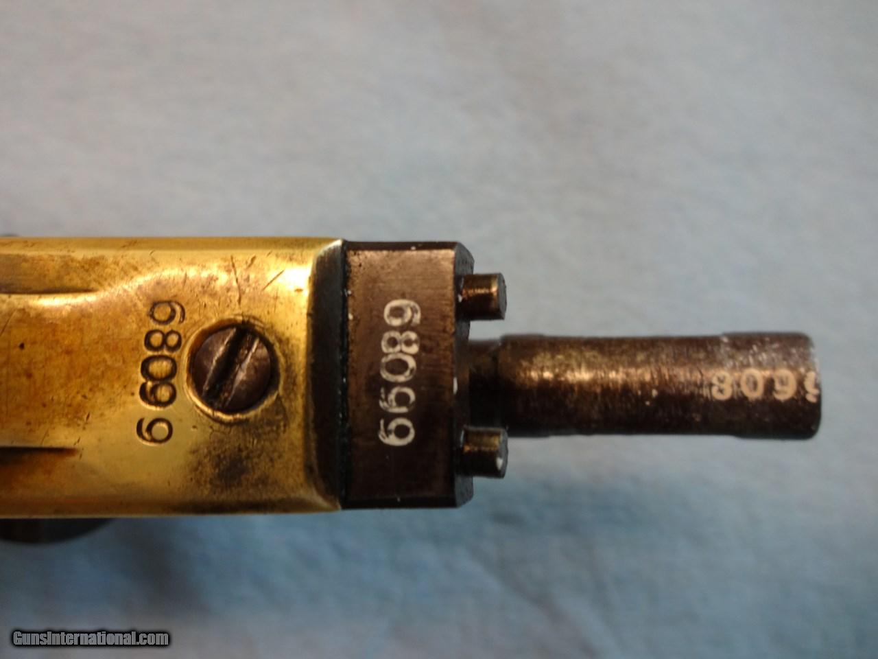 Description: For sale is a Marshal Marked, three screw, Colt 1860 Army, ser# 68099. The serial number indicates a mfg date of 1862, a Civil War gun. The blue is all gone leaving it pretty much in a dark white appearance with no surface rust. All the numbers match except the last four on the wedge, #4476. I believe all other components to be original to the gun, including the "M" marked grips. Left frame is marked COLTS PATENT in two lines. In the brass behind the trigger guard. In the curve to the front grip strap, is marked with what appears to be a letter "C". The right side of the barrel at the extreme rear, behind and slightlty above the wedge is stamped with a letter "K". It's almost imposible to discern without a loop, or something stronger. The grips are very nice with no dents or gouges. The bottom of the right grip is plainly marked with the letter "M". I don't know what's under the grips as they fit too tightly to risk attempting to remove. At the rear of the cylinder, on the rebated area between the cylinder stops, is a horrizontally placed "K". That is, a "K" lying down. I understand that to be a proof mark, not an inspector's stamp. There is another "K" placed similarly at the right rear side of the barrel, as mentioned above. At the rear edge of the non- rebated part of the cylinder, opposite of, and inline with, the horrizontal "K" is an upright "P" inspector's stamp. The battle scene on the cylinder is discernable. The patent number and last four of the serial number, 8099, are clearly marked. The clylinder locks and lead-ins are not excessively worn. The cylinder locks up tight and lines up perfectly. Inside the frame, beside the stock cut out in the right recoil shield, is a stamped letter "P". The bottom of the grip is cut for a stock. The bottom of the barrel, just ahead of the recess for the rammer cogs, is marked with a letter "S". The contour of the metal makes the stamping hard to discern. On the top of the back strap, under the hammer, is a stamping that I can't make out, even under a microscope. In the curve behind the trigger guard is another stamping that I can't make out. The address line is a New York address. The length from the start of one hyphen to the end of the other is 3.96 inches, as best I can measure. The bore is not perfect but, the rifling is still very apparent from one end of the barrel to the other. At some point in the life of this revolver the screw in the loading lever was probably replaced, and the head filed smooth. It would be easy to remove and replace it with a new one as they are readily available. As is, it functions fine. Not to be melowdramatic about this but, I wonder about the possibility it could have been a war-time field expedient repair. I'm not saying that it is, but, I don't know that it isn't either so, I leave it as it is. There it is. I've tried to be thorough with my description. Being over 150 years old, I have to sell it as is with no guarantees. Although I have fired this revolver, I'm not selling it, or recommending it, as a shooter. I think it is a good, representative piece of Civil War history. It shot and functioned very well, by the way. Trigger is pretty light. Never had a misfire. I used 25gr of 3F and #11 caps, which were a little loose on the nipples. I'm asking $1650.00. Free shipping and insurance to your door. There's a three day inspection period, no shooting. Keep it and shipping and insurance are free. Return it with no questions asked, and buyer pays shipping and insurance both ways, plus the $12.00 listing fee. However, this only affects those with buyer's remorse. SOLD Antique: Yes Manufacturer: Colt Model: Colt 1860 Army Serial Number: 68099 Caliber Info: .44 Manufacture Date: 1862 |