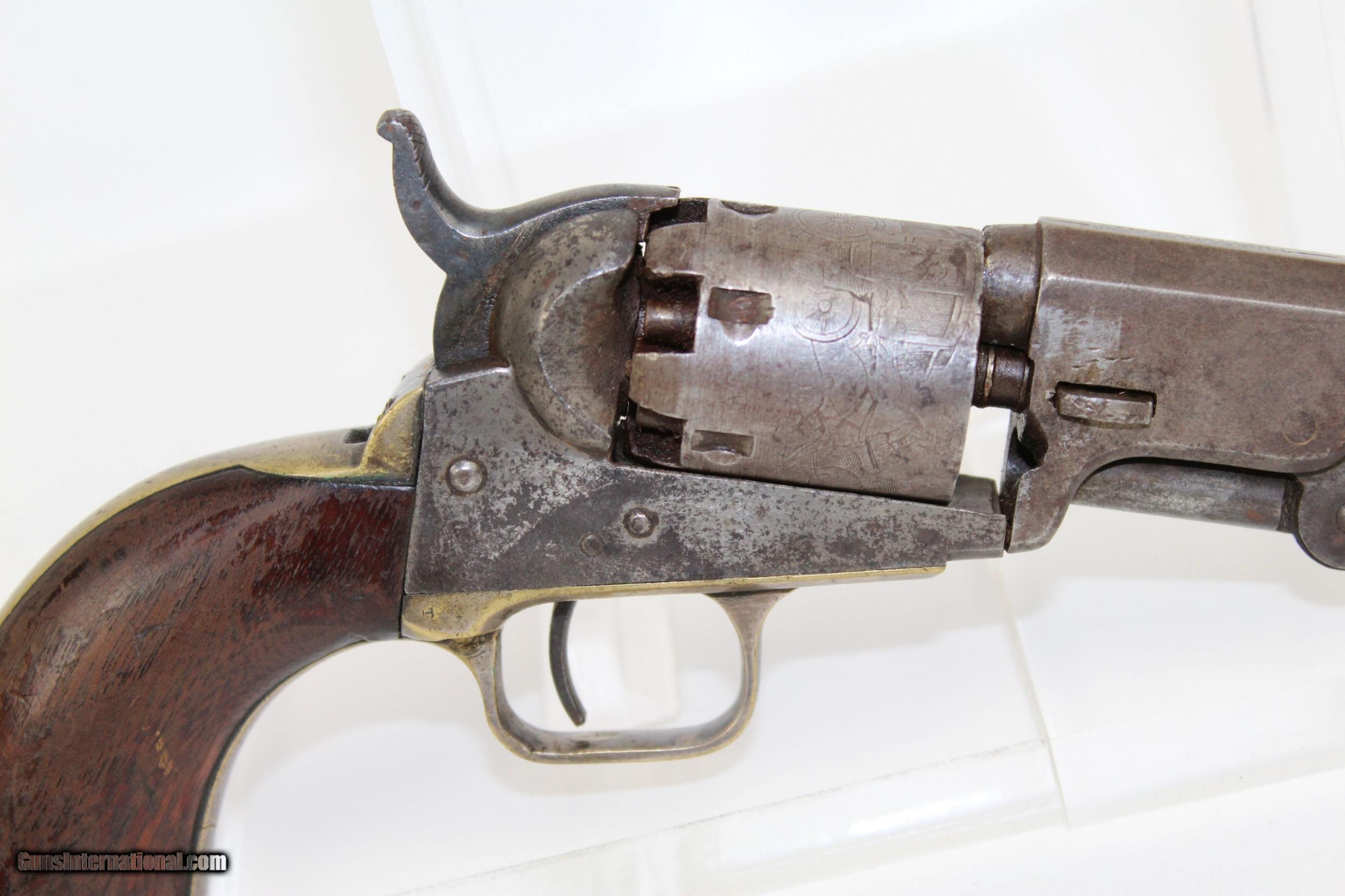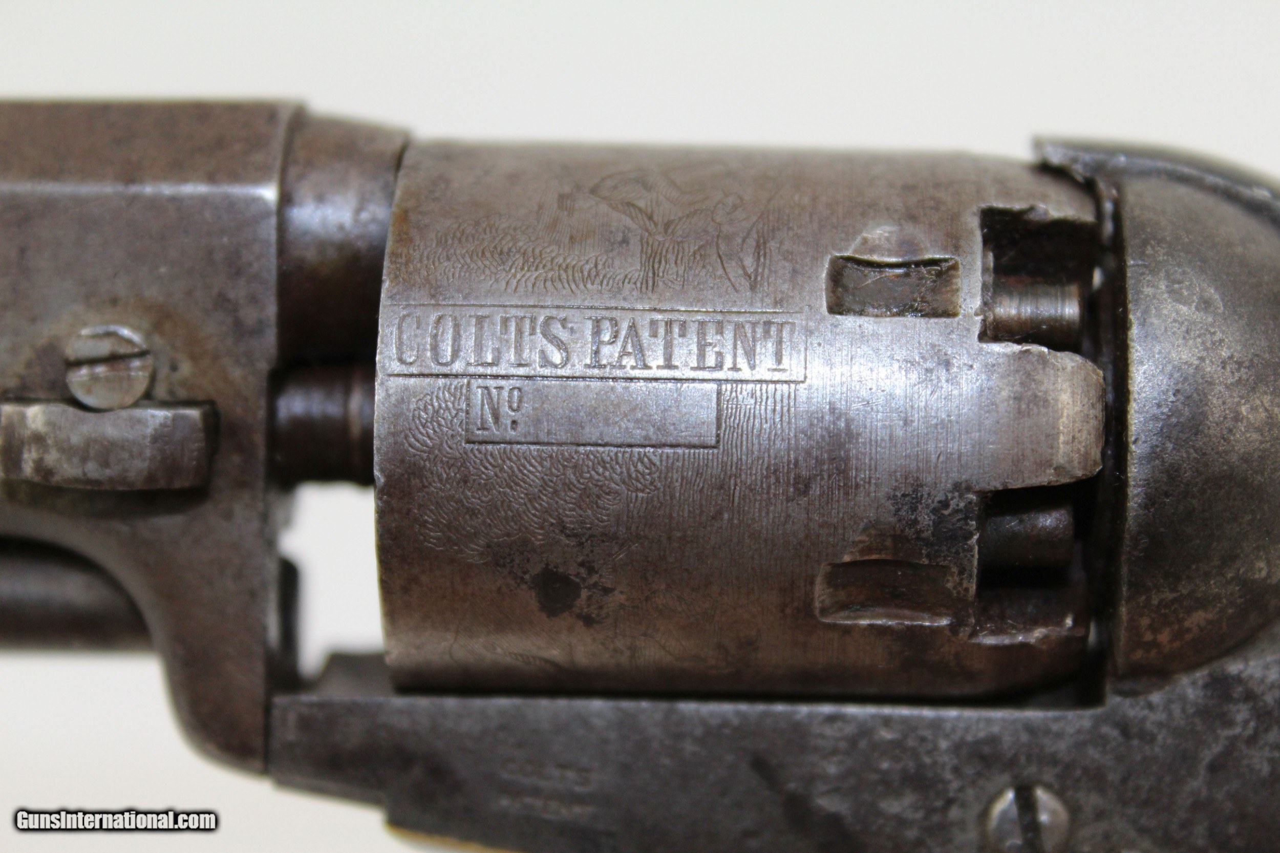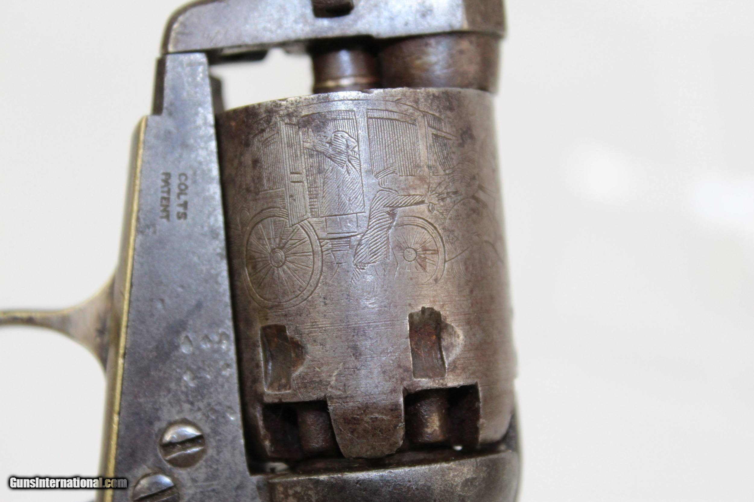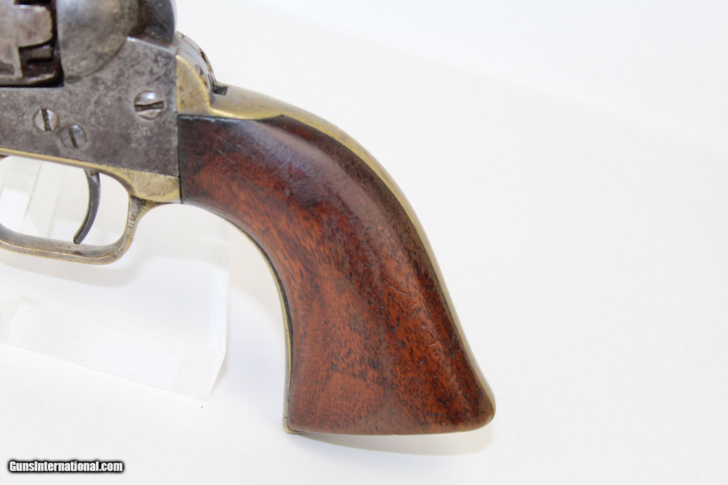 Description: EARLY Antique COLT Model 1849 Pocket REVOLVER Made in 1851 Here we present an antique Colt Model 1849 Pocket Revolver, made in 1851 in Hartford, Connecticut. One of the most aesthetically pleasing aspects of this pistol is its cylinder scene. Cylinder scenes during this period were common, especially for Colt, not only for their visual appeal, but because it made a revolver more difficult to forge. The scene on the 1849 Pocket is that of a stagecoach robbery. The focal point is the stagecoach drawn by four horses. A woman in a dress is seen framed in the doorway of the side of the coach. The driver is standing alongside wielding his pistol against multiple assailants as the horses rear and struggle against their harnesses. Several of the bandits lay dying on the ground, one tries to control the horses, two are running away and one is in the process of falling dead after being shot. Not a bad way to show interested buyers what a pistol like this would be good for. It did a fine job as a self-defense handgun for the average citizen in 19th Century America. The left side of the frame is marked “COLTS PATENT”. The top of the barrel is marked “ADDRESS SAML COLT NEW YORK CITY” in two lines. This appears to have been lightly stamped at the factory and gone over a second time lending to its off-kilter appearance. The cylinder, which appears as though it belongs to the gun was never marked with a serial number, which is quite odd. Interesting too is the “Q” under the serial number on the trigger guard. The cylinder scene is very good and the safety pins on the back of the cylinder are worn but mostly still intact. The overall condition is very good. The metal surfaces have a smooth, even patina. The markings are clear and legible. The serial numbers match. The grips are in great shape. The bore is dark with visible rifling. The action on this revolver is strong. Here is a great and early example of the revolver that really made Colt a household name! Own the original! This is a legitimate antique and not a reproduction. Barrel is 5 inches. Caliber: .31 Percussion Overall condition as seen in photos. Very Fast. Very Safe. FREE SHIPPING WORLDWIDE. Delivered directly to your door by express mail! Guaranteed AUTHENTIC & Includes CERTIFICATE OF AUTHENTICITY. ancestryguns $1450 #7220 SOLD Antique: Yes |