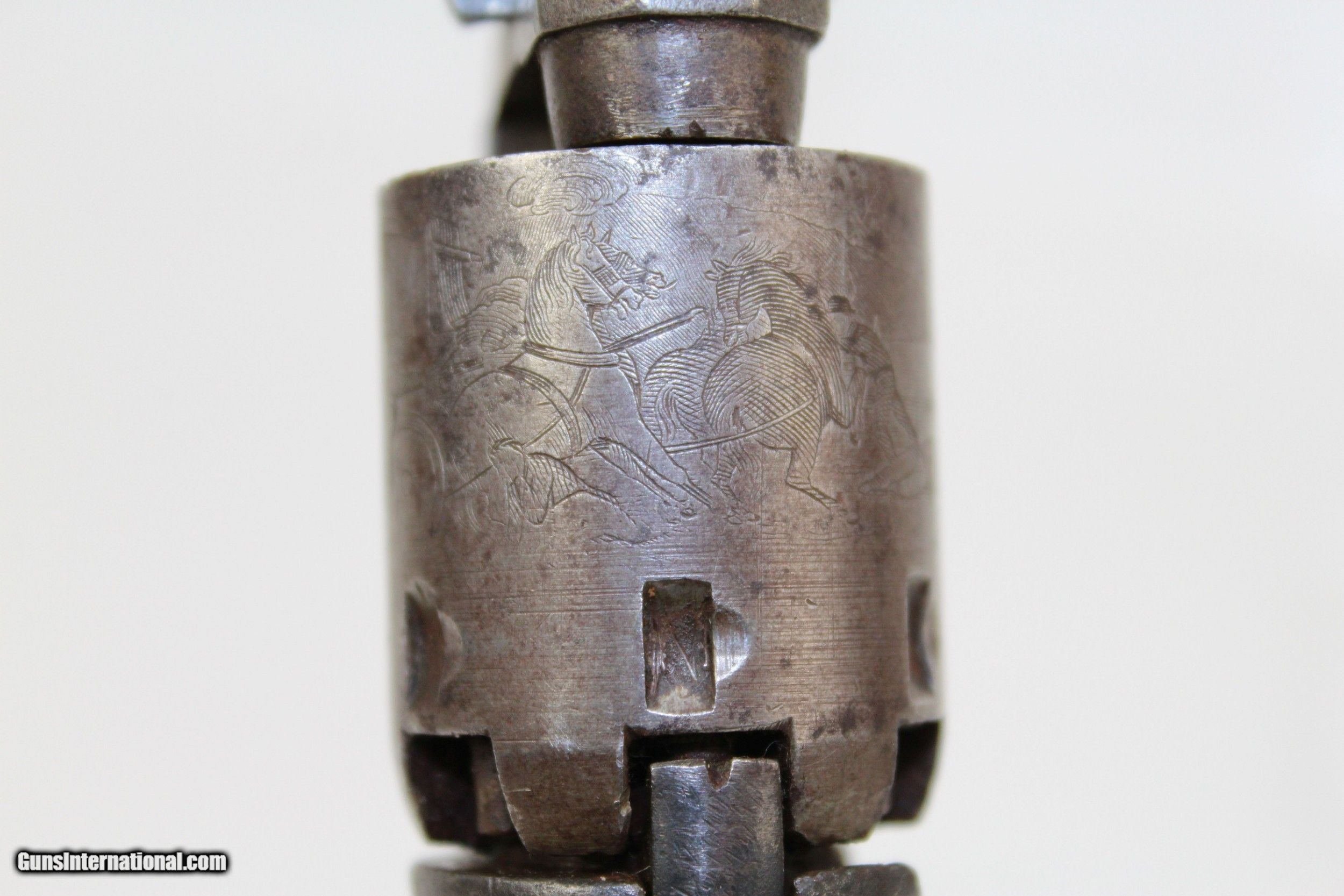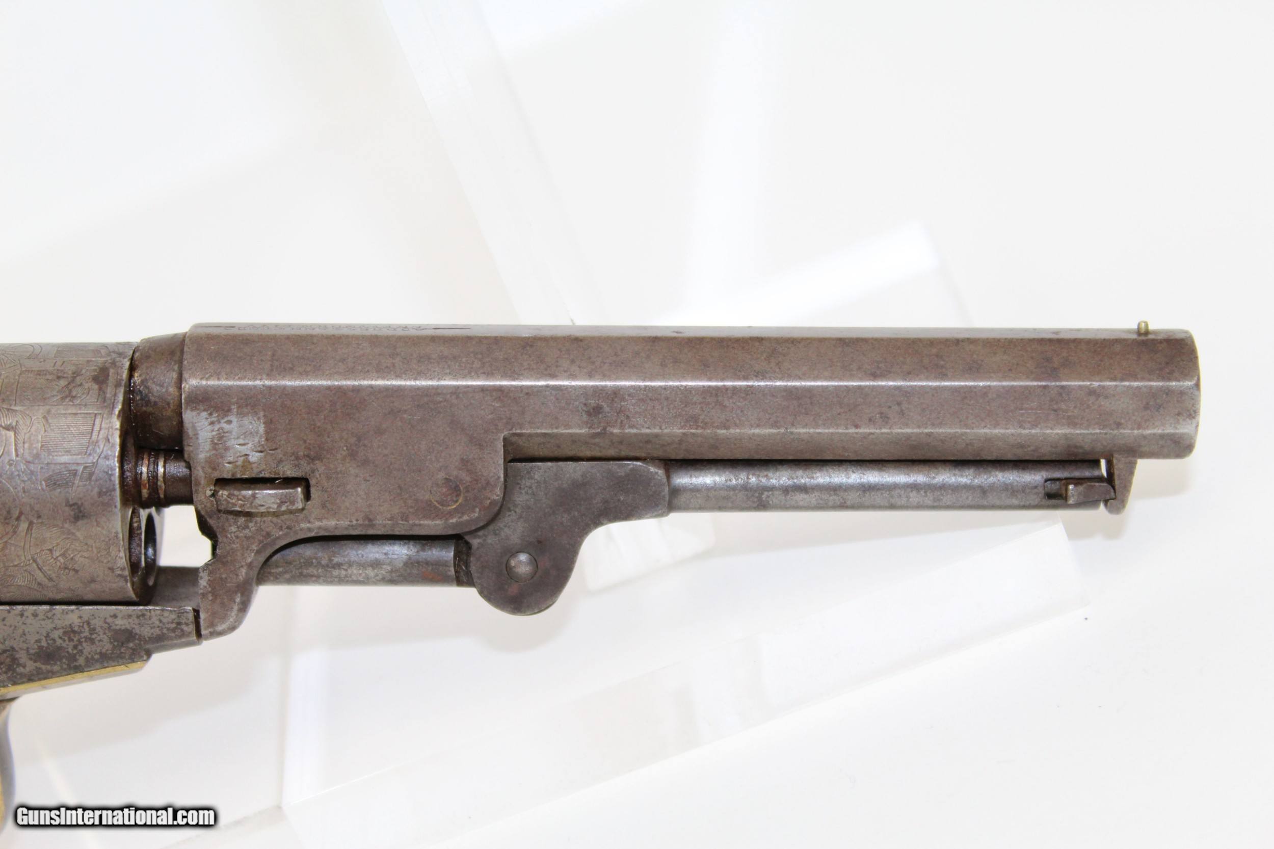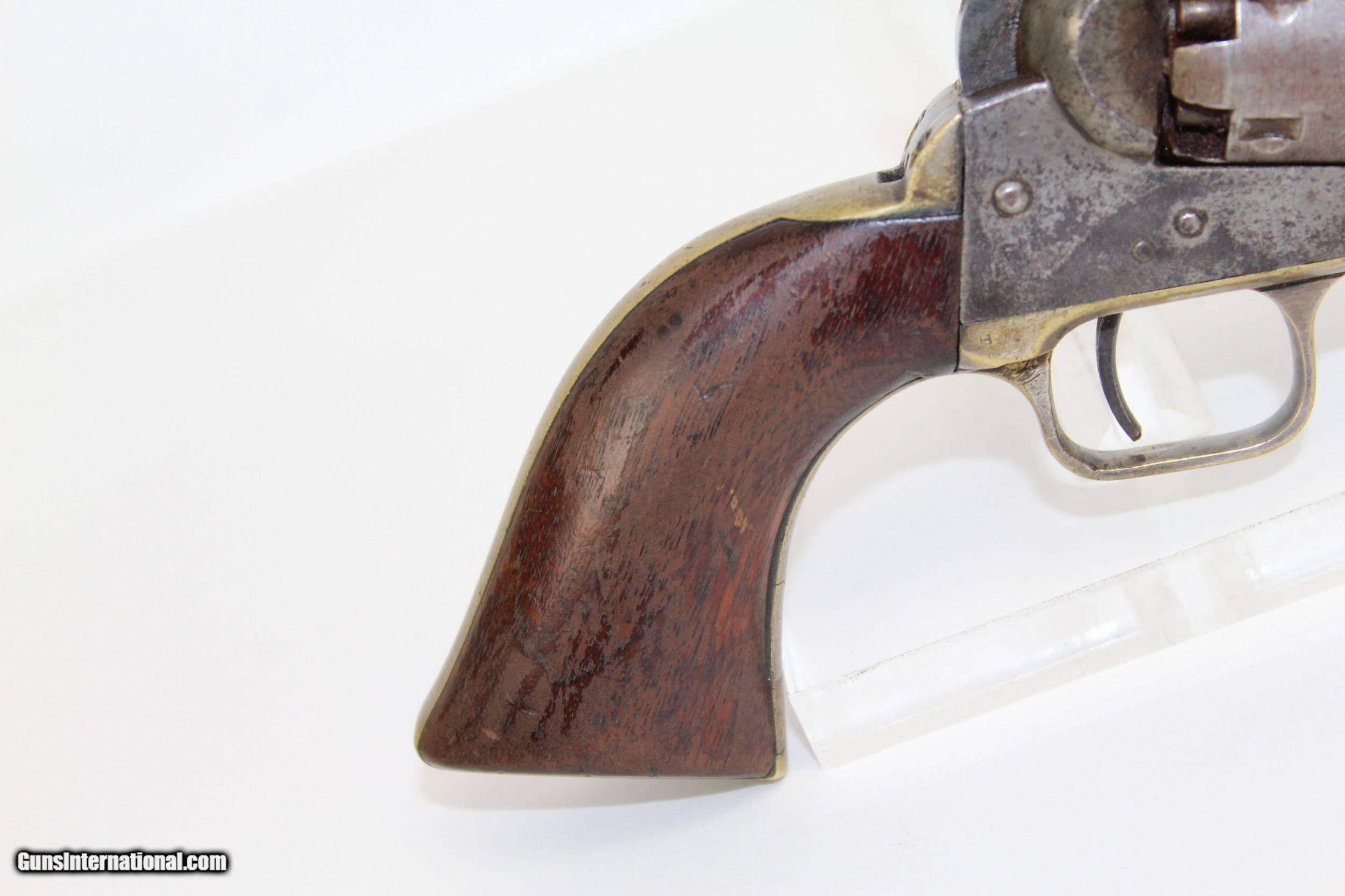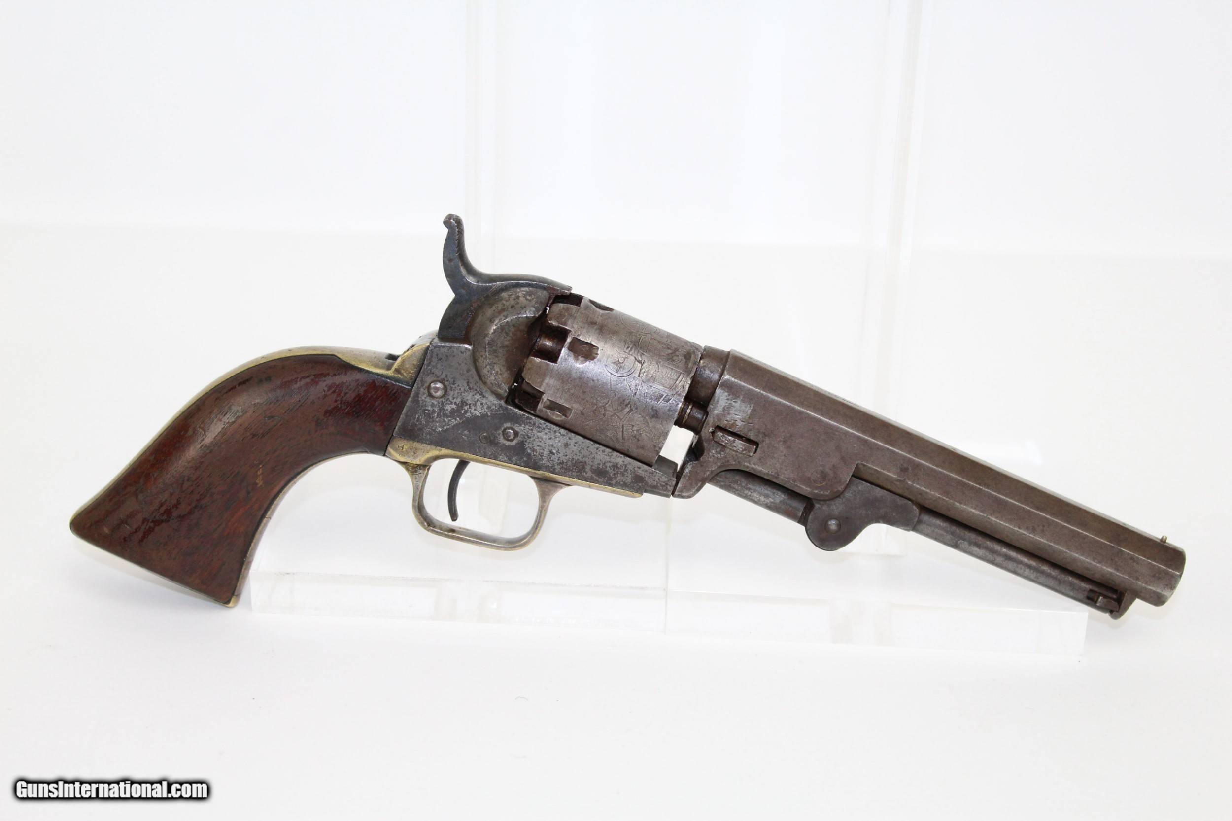 Description: EARLY Antique COLT Model 1849 Pocket REVOLVER Made in 1851 Here we present an antique Colt Model 1849 Pocket Revolver, made in 1851 in Hartford, Connecticut. One of the most aesthetically pleasing aspects of this pistol is its cylinder scene. Cylinder scenes during this period were common, especially for Colt, not only for their visual appeal, but because it made a revolver more difficult to forge. The scene on the 1849 Pocket is that of a stagecoach robbery. The focal point is the stagecoach drawn by four horses. A woman in a dress is seen framed in the doorway of the side of the coach. The driver is standing alongside wielding his pistol against multiple assailants as the horses rear and struggle against their harnesses. Several of the bandits lay dying on the ground, one tries to control the horses, two are running away and one is in the process of falling dead after being shot. Not a bad way to show interested buyers what a pistol like this would be good for. It did a fine job as a self-defense handgun for the average citizen in 19th Century America. The left side of the frame is marked “COLTS PATENT”. The top of the barrel is marked “ADDRESS SAML COLT NEW YORK CITY” in two lines. This appears to have been lightly stamped at the factory and gone over a second time lending to its off-kilter appearance. The cylinder, which appears as though it belongs to the gun was never marked with a serial number, which is quite odd. Interesting too is the “Q” under the serial number on the trigger guard. The cylinder scene is very good and the safety pins on the back of the cylinder are worn but mostly still intact. The overall condition is very good. The metal surfaces have a smooth, even patina. The markings are clear and legible. The serial numbers match. The grips are in great shape. The bore is dark with visible rifling. The action on this revolver is strong. Here is a great and early example of the revolver that really made Colt a household name! Own the original! This is a legitimate antique and not a reproduction. Barrel is 5 inches. Caliber: .31 Percussion Overall condition as seen in photos. Very Fast. Very Safe. FREE SHIPPING WORLDWIDE. Delivered directly to your door by express mail! Guaranteed AUTHENTIC & Includes CERTIFICATE OF AUTHENTICITY. ancestryguns $1450 #7220 SOLD Antique: Yes |