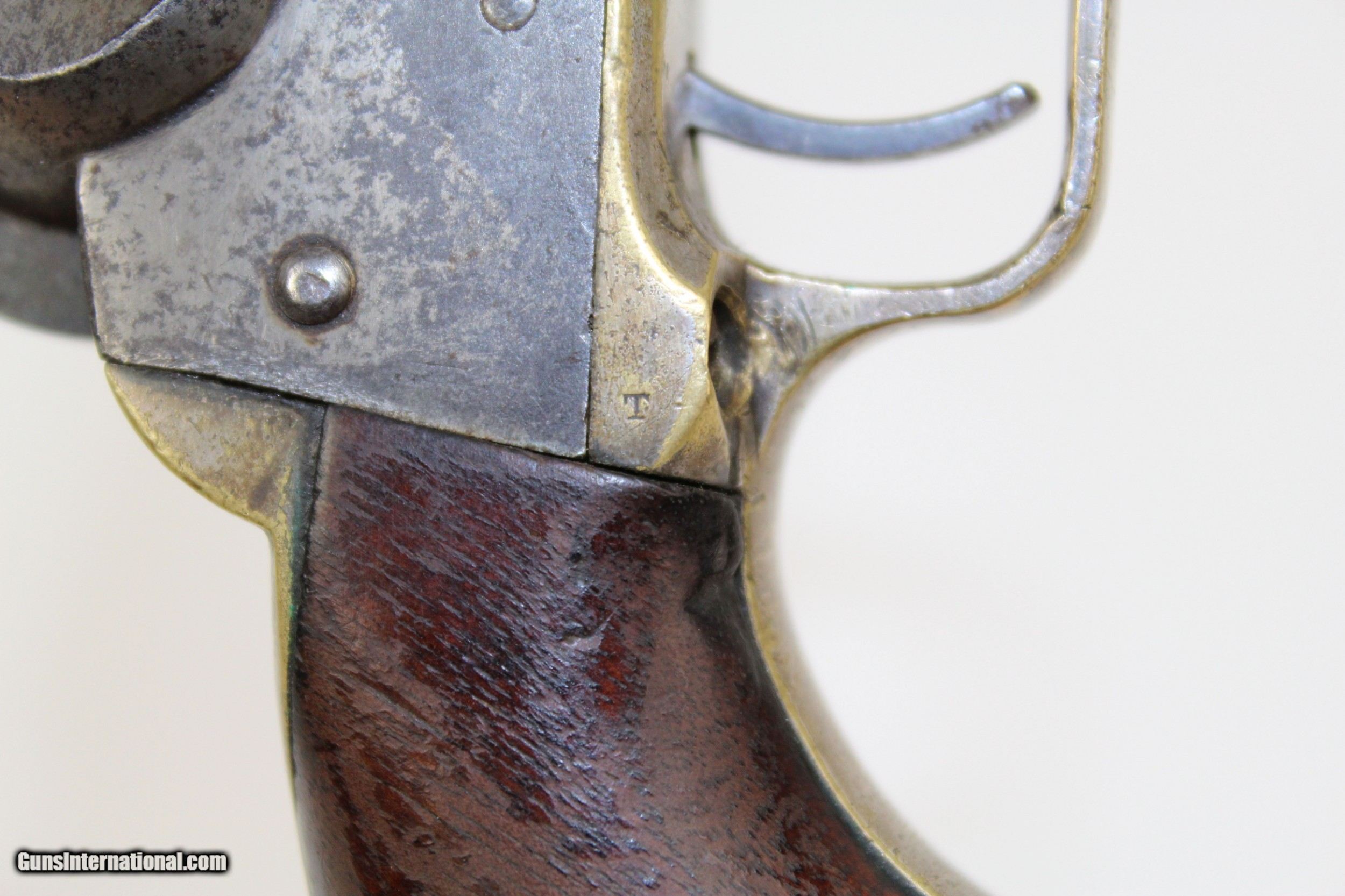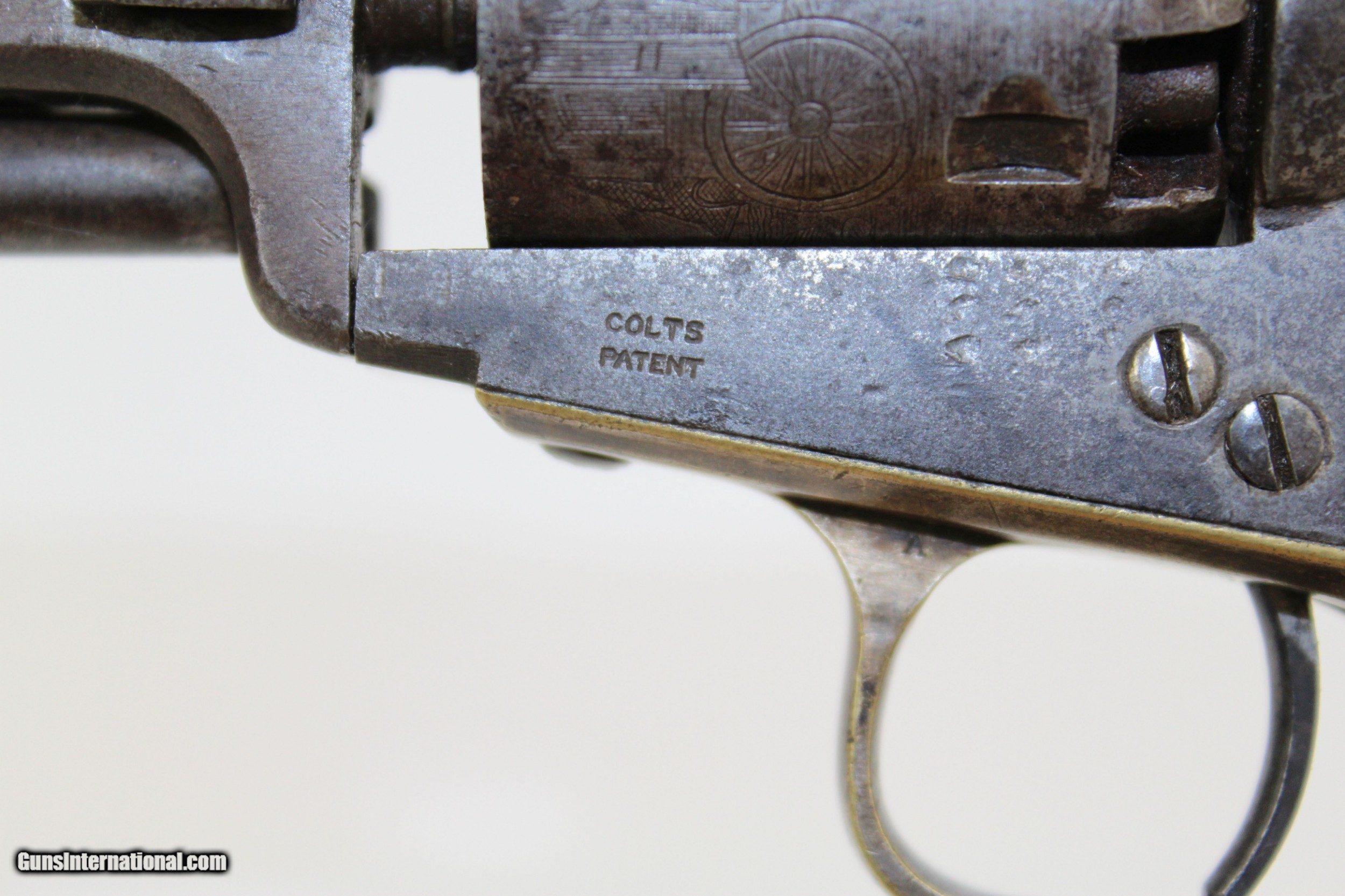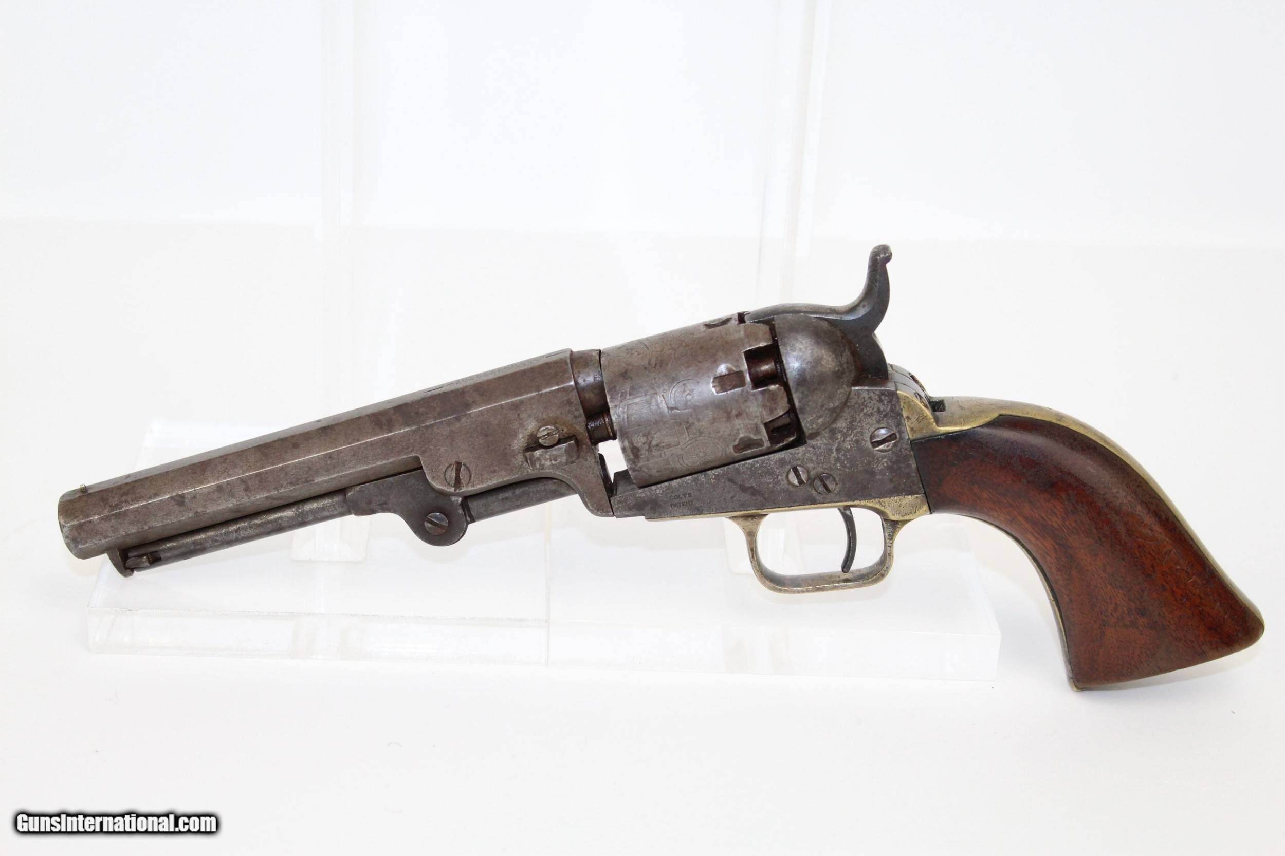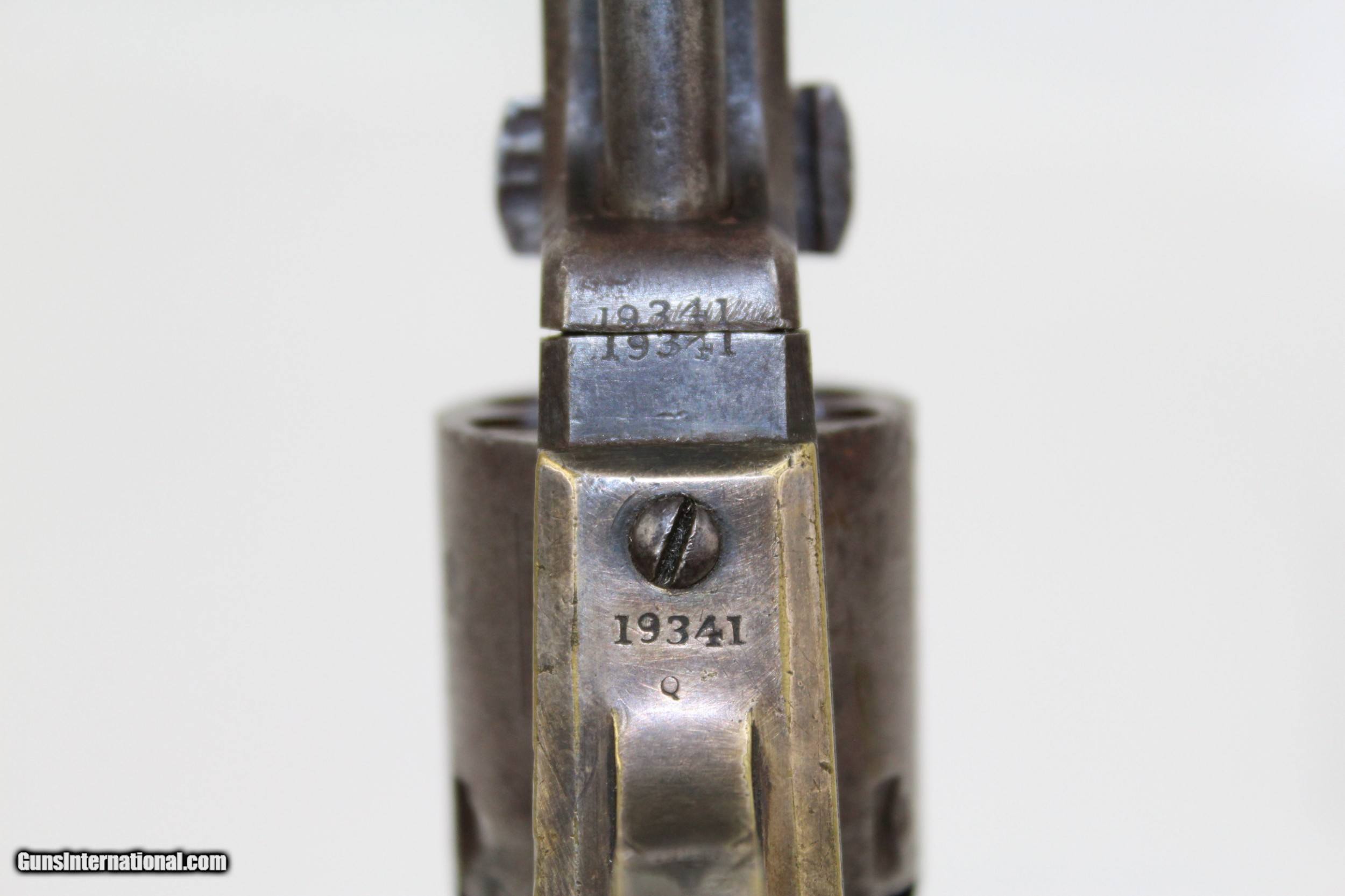 Description: EARLY Antique COLT Model 1849 Pocket REVOLVER Made in 1851 Here we present an antique Colt Model 1849 Pocket Revolver, made in 1851 in Hartford, Connecticut. One of the most aesthetically pleasing aspects of this pistol is its cylinder scene. Cylinder scenes during this period were common, especially for Colt, not only for their visual appeal, but because it made a revolver more difficult to forge. The scene on the 1849 Pocket is that of a stagecoach robbery. The focal point is the stagecoach drawn by four horses. A woman in a dress is seen framed in the doorway of the side of the coach. The driver is standing alongside wielding his pistol against multiple assailants as the horses rear and struggle against their harnesses. Several of the bandits lay dying on the ground, one tries to control the horses, two are running away and one is in the process of falling dead after being shot. Not a bad way to show interested buyers what a pistol like this would be good for. It did a fine job as a self-defense handgun for the average citizen in 19th Century America. The left side of the frame is marked “COLTS PATENT”. The top of the barrel is marked “ADDRESS SAML COLT NEW YORK CITY” in two lines. This appears to have been lightly stamped at the factory and gone over a second time lending to its off-kilter appearance. The cylinder, which appears as though it belongs to the gun was never marked with a serial number, which is quite odd. Interesting too is the “Q” under the serial number on the trigger guard. The cylinder scene is very good and the safety pins on the back of the cylinder are worn but mostly still intact. The overall condition is very good. The metal surfaces have a smooth, even patina. The markings are clear and legible. The serial numbers match. The grips are in great shape. The bore is dark with visible rifling. The action on this revolver is strong. Here is a great and early example of the revolver that really made Colt a household name! Own the original! This is a legitimate antique and not a reproduction. Barrel is 5 inches. Caliber: .31 Percussion Overall condition as seen in photos. Very Fast. Very Safe. FREE SHIPPING WORLDWIDE. Delivered directly to your door by express mail! Guaranteed AUTHENTIC & Includes CERTIFICATE OF AUTHENTICITY. ancestryguns $1450 #7220 SOLD Antique: Yes |