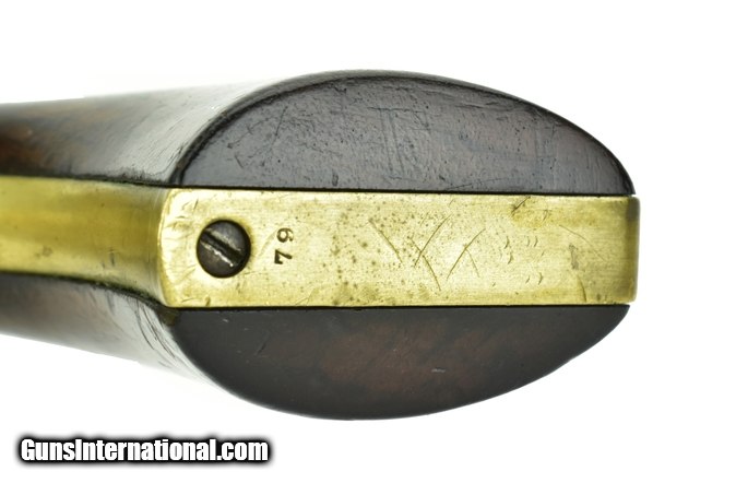 Description: Early Colt 1851 Navy London Model Revolver. Made in 1853. London barrel address with arrow finials. Early two digit gun, serial number 79. This is a London 1851 Navy with brass trigger guard and backstrap. Nice sharp gun with a nice even gray to light brown patina. Metal is sharp and clear. Grips are very fine. Cylinder scene is very good. Action works excellent. Gun is all matching except for wedge. SOLD Antique: Yes |