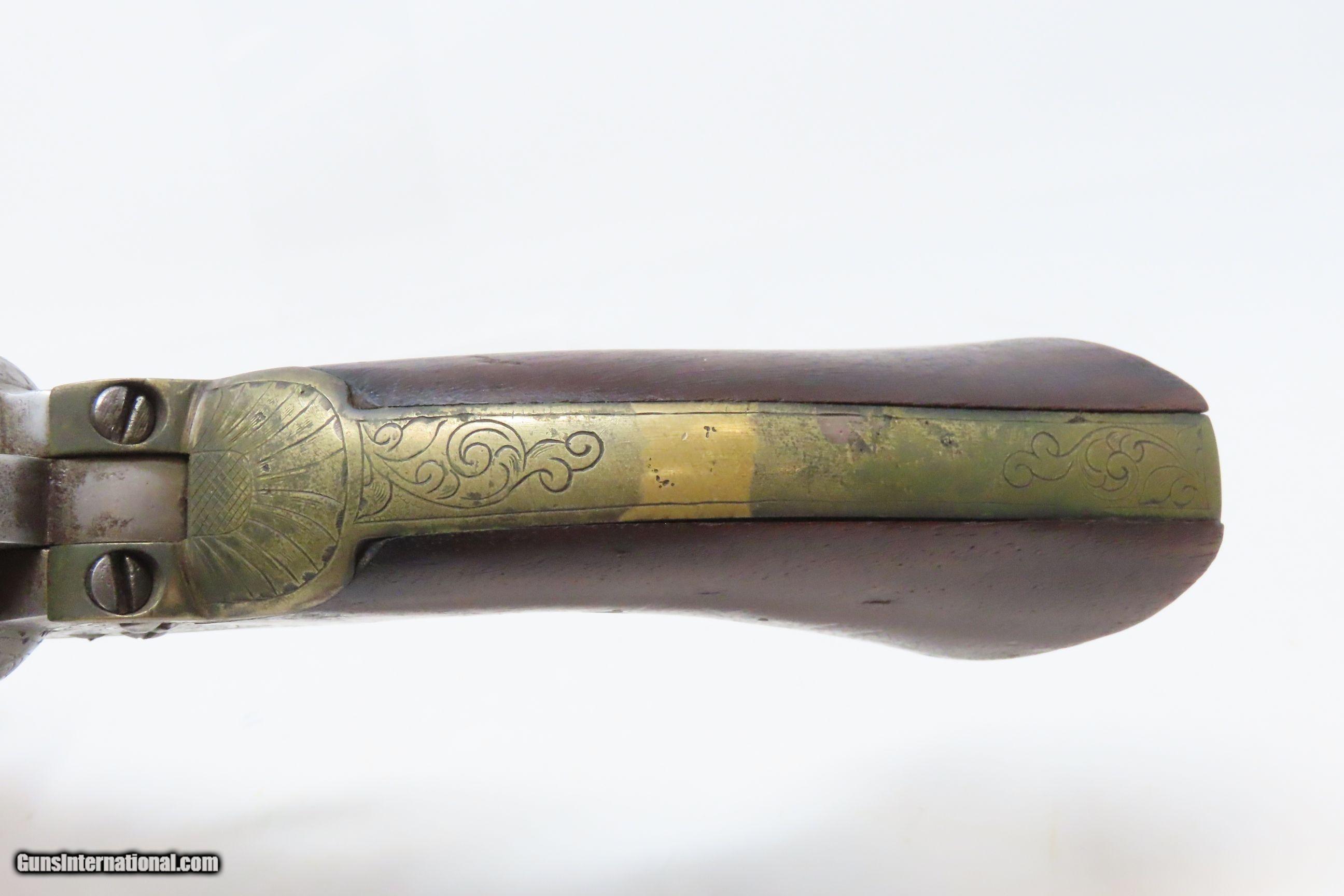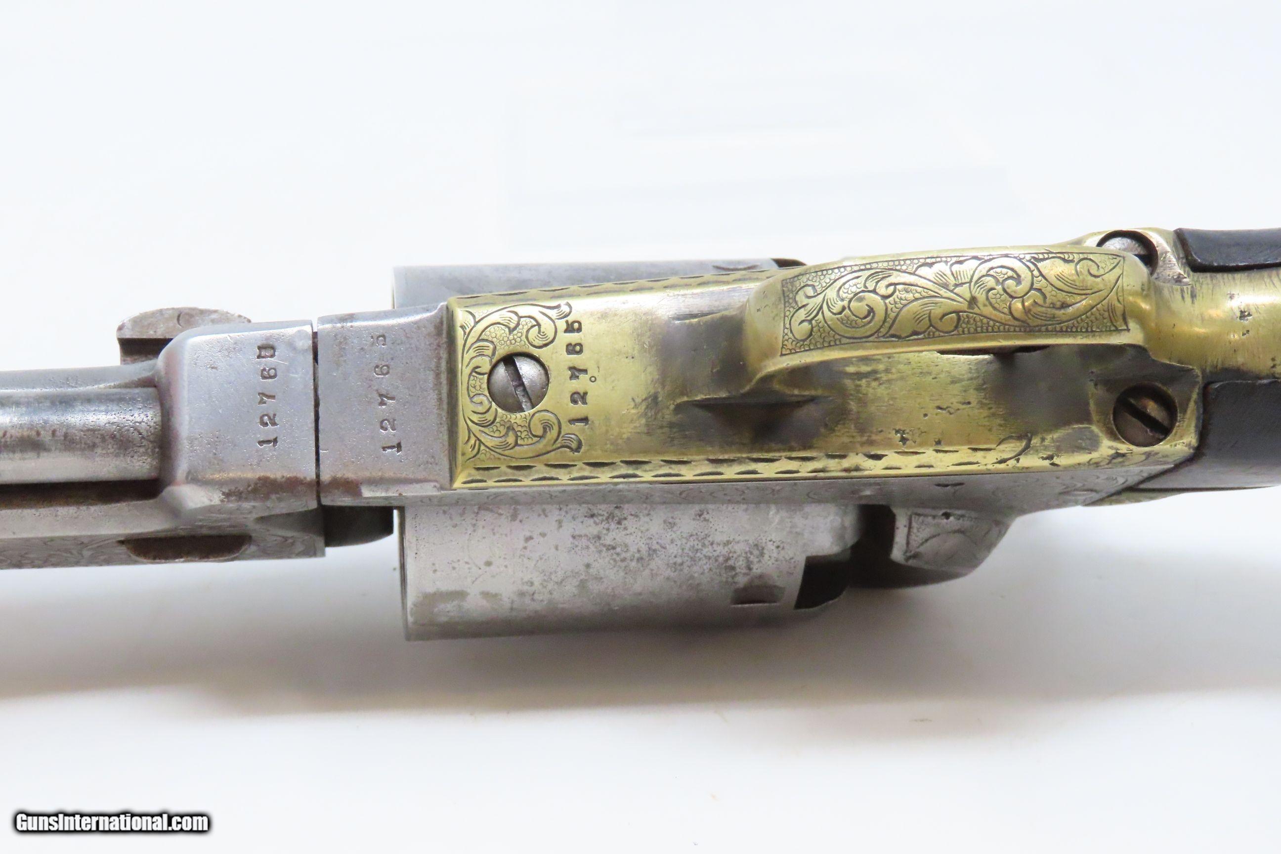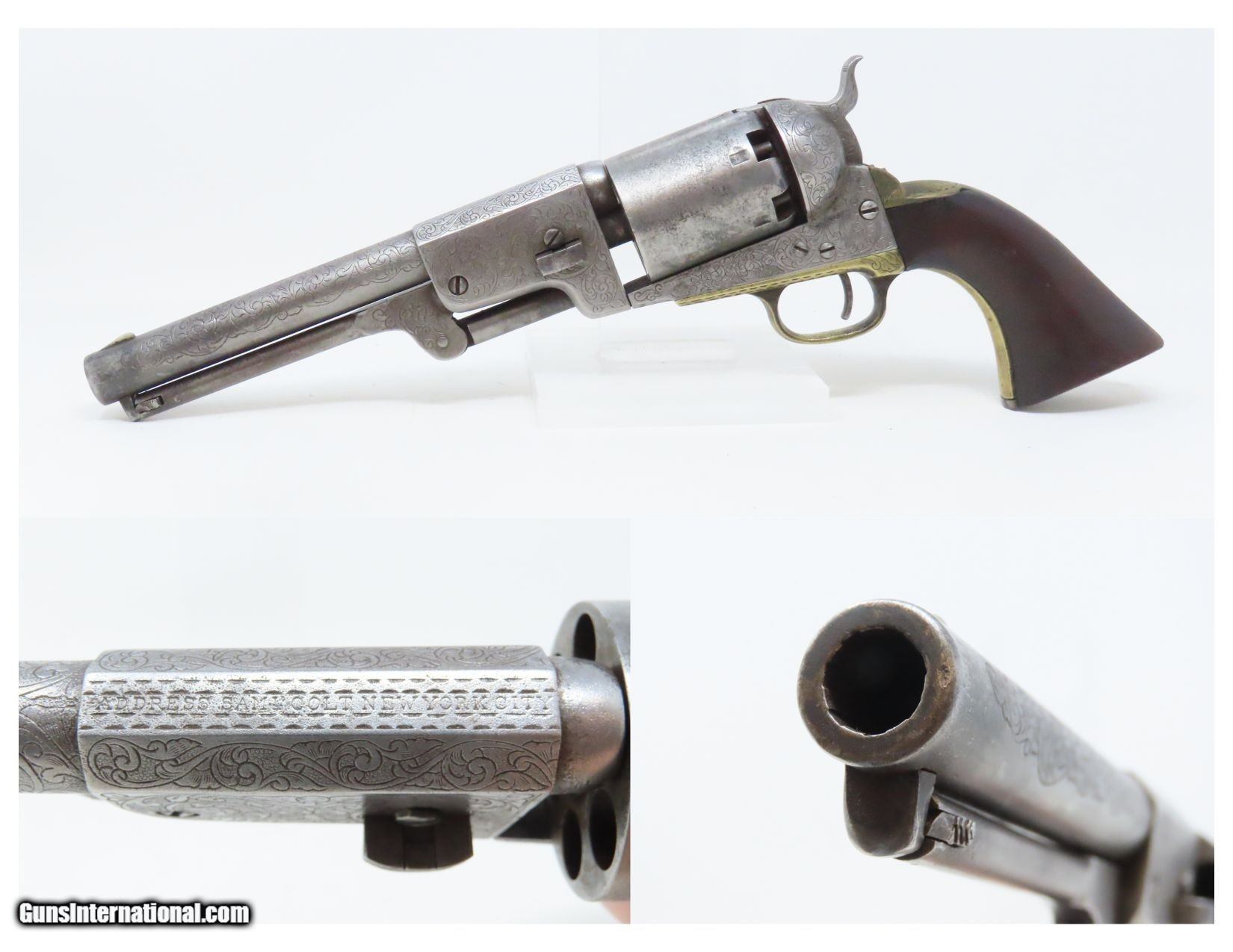 Description: ENGRAVED PERIOD COPY COLT DRAGOON .44 Percussion Revolver 3rd Model Antique c1850s with Scroll Engraving & Gustave Young Motifs Here we present an antique Engraved Period Copy of a Colt 3rd Model Dragoon Revolver, manufactured circa the 1850s. The Colt Third Model was first offered in 1851 and continued production through 1861, for a total of 10,500. The revolver is in .44 caliber and has a part round and part octagonal barrel. This one has rifling in the bore but it is straight rather than with a twist. The overall condition is good. Gustave imitation engraving throughout with scrolls and dog heads with punch dot backgrounds. The action is strong. The bore is well rifled and in good condition. The grip is solid, showing use. Numbers match throughout. Own the original! This is a legitimate antique and not a reproduction. Barrel is 7-1/2 inches. Caliber: .44 Percussion Overall condition as seen in photos. Very Fast. Very Safe. FREE SHIPPING WORLDWIDE. Delivered directly to your door by express mail! Guaranteed AUTHENTIC & Includes CERTIFICATE OF AUTHENTICITY. ancestryguns $2200 #230322 SOLD Antique: Yes |