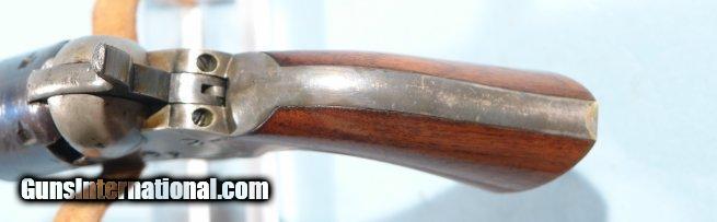 Description: EXCELLENT EARLY COLT MODEL 1849 PERCUSSION 6” POCKET REVOLVER CA. 1854. Small guard, five shot .31 cal. pocket with all matching serial numbers in the 87,xxx range. Two line “ADDRESS SAML. COLT/NEW YORK CITY” barrel address. 100% original including all the screws and wedge. Superb condition with 98% original blue and nearly all the early mousey grey case hardening on the frame, hammer and loading lever. Has nearly all the silver on the straps and varnish on the walnut grips. Even the screws have much original blue. 100% crisp cylinder scene. Near mint bore and chambers. Exceptional example. SOLD Antique: Yes |