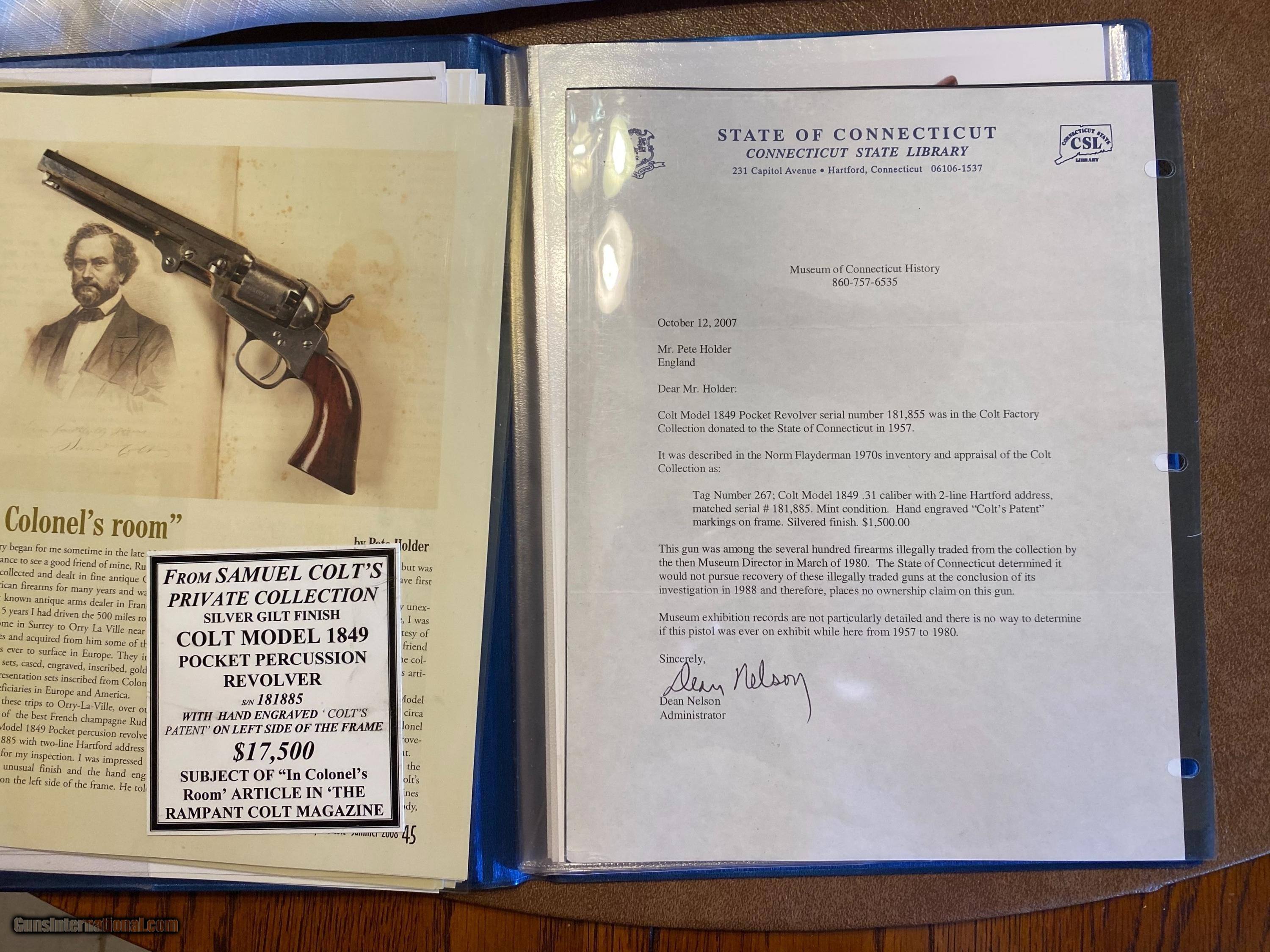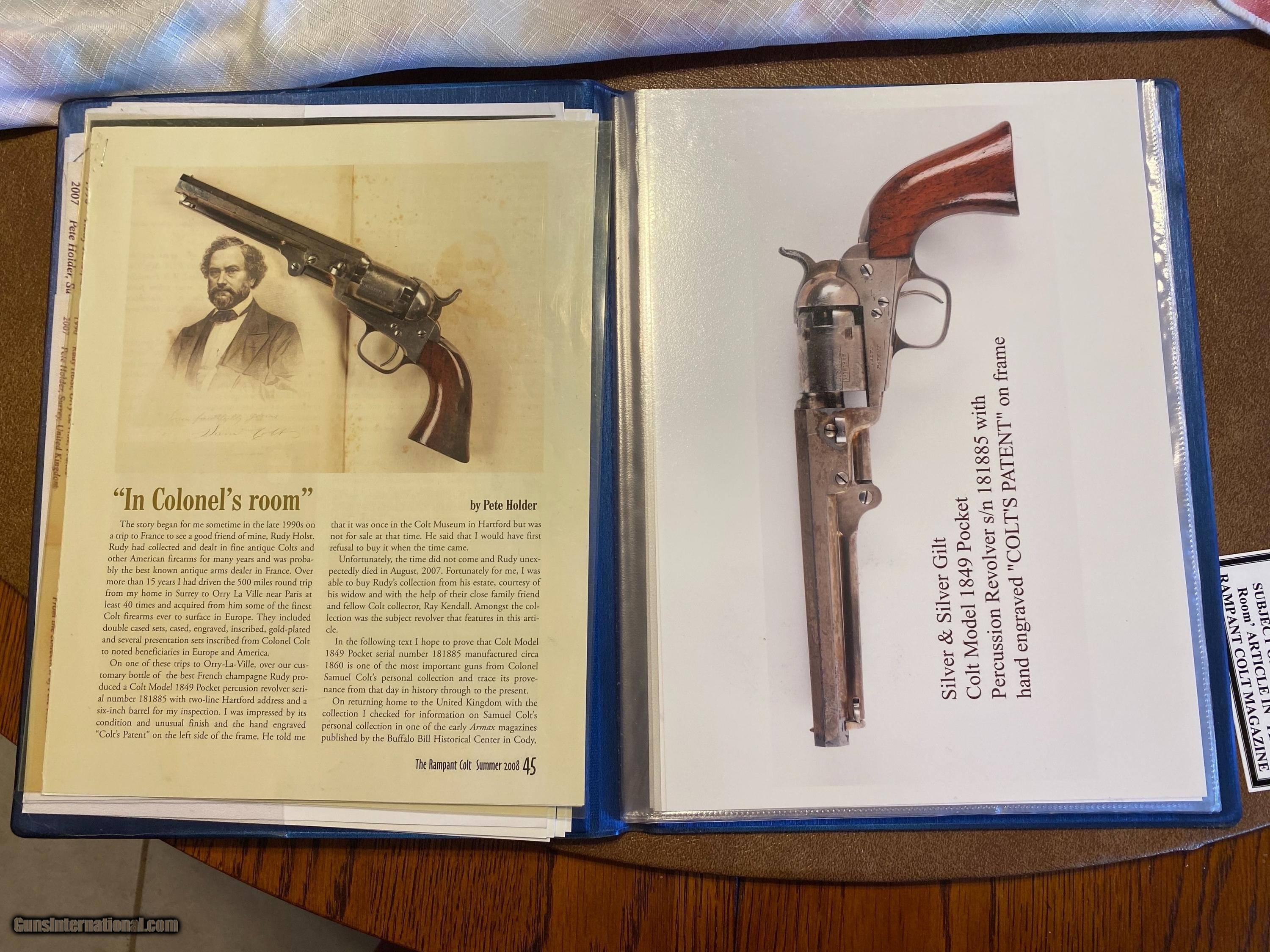 Exceptional Colt Model 1849 Pocket Revolver Silver Gilt Finish from Col Sam Colts Personal Collection w/ Documentation
